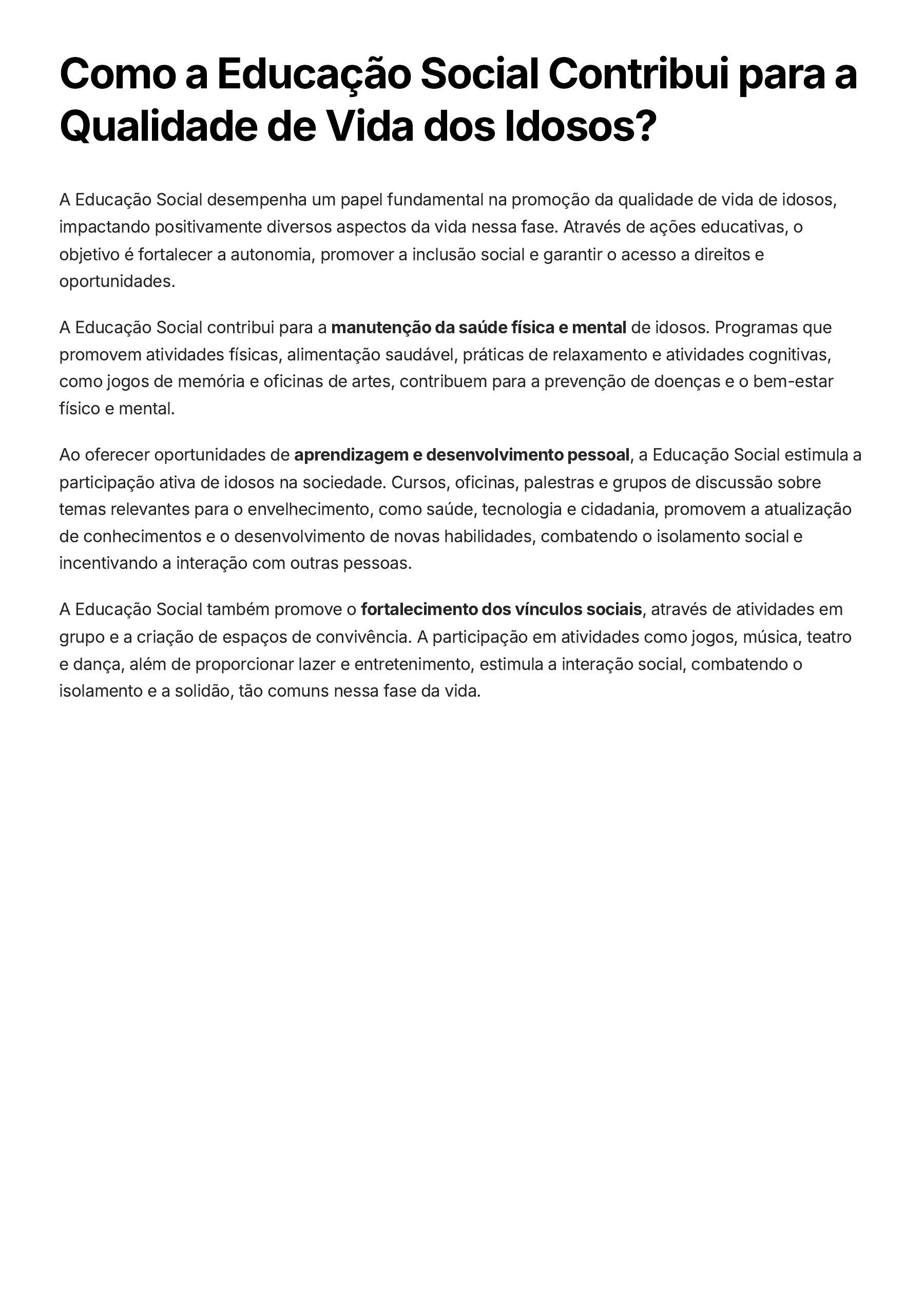 Como a Educação Social Contribui para a Qualidade de Vida dos Idosos? A Educação Social desempenha um papel fundamental na promoção da qualidade de vida de idosos, impactando positivamente diversos aspectos da vida nessa fase. Através de ações educativas, o objetivo é fortalecer a autonomia, promover a inclusão social e garantir o acesso a direitos e oportunidades. A Educação Social contribui para a manutenção da saúde física e mental de idosos. Programas que promovem atividades físicas, alimentação saudável, práticas de relaxamento e atividades cognitivas, como jogos de memória e oficinas de artes, contribuem para a prevenção de doenças e o bem-estar físico e mental. Ao oferecer oportunidades de aprendizagem e desenvolvimento pessoal, a Educação Social estimula a participação ativa de idosos na sociedade. Cursos, oficinas, palestras e grupos de discussão sobre temas relevantes para o envelhecimento, como saúde, tecnologia e cidadania, promovem a atualização de conhecimentos e o desenvolvimento de novas habilidades, combatendo o isolamento social e incentivando a interação com outras pessoas. A Educação Social também promove o fortalecimento dos vínculos sociais, através de atividades em grupo e a criação de espaços de convivência. A participação em atividades como jogos, música, teatro e dança, além de proporcionar lazer e entretenimento, estimula a interação social, combatendo o isolamento e a solidão, tão comuns nessa fase da vida.
