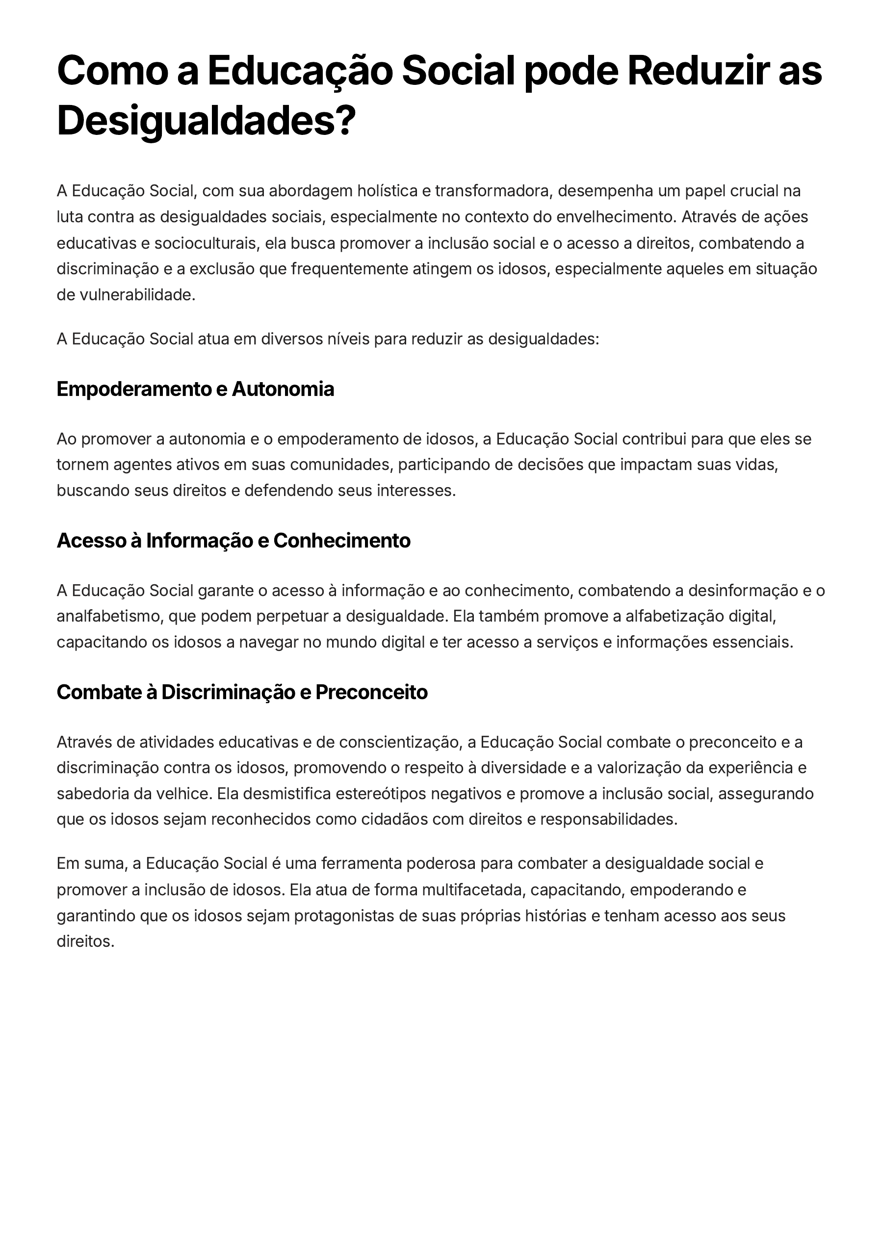 Como a Educação Social pode Reduzir as Desigualdades? A Educação Social, com sua abordagem holística e transformadora, desempenha um papel crucial na luta contra as desigualdades sociais, especialmente no contexto do envelhecimento. Através de ações educativas e socioculturais, ela busca promover a inclusão social e o acesso a direitos, combatendo a discriminação e a exclusão que frequentemente atingem os idosos, especialmente aqueles em situação de vulnerabilidade. A Educação Social atua em diversos níveis para reduzir as desigualdades: Empoderamento e Autonomia Ao promover a autonomia e o empoderamento de idosos, a Educação Social contribui para que eles se tornem agentes ativos em suas comunidades, participando de decisões que impactam suas vidas, buscando seus direitos e defendendo seus interesses. Acesso à Informação e Conhecimento A Educação Social garante o acesso à informação e ao conhecimento, combatendo a desinformação e o analfabetismo, que podem perpetuar a desigualdade. Ela também promove a alfabetização digital, capacitando os idosos a navegar no mundo digital e ter acesso a serviços e informações essenciais. Combate à Discriminação e Preconceito Através de atividades educativas e de conscientização, a Educação Social combate o preconceito e a discriminação contra os idosos, promovendo o respeito à diversidade e a valorização da experiência e sabedoria da velhice. Ela desmistifica estereótipos negativos e promove a inclusão social, assegurando que os idosos sejam reconhecidos como cidadãos com direitos e responsabilidades. Em suma, a Educação Social é uma ferramenta poderosa para combater a desigualdade social e promover a inclusão de idosos. Ela atua de forma multifacetada, capacitando, empoderando e garantindo que os idosos sejam protagonistas de suas próprias histórias e tenham acesso aos seus direitos.