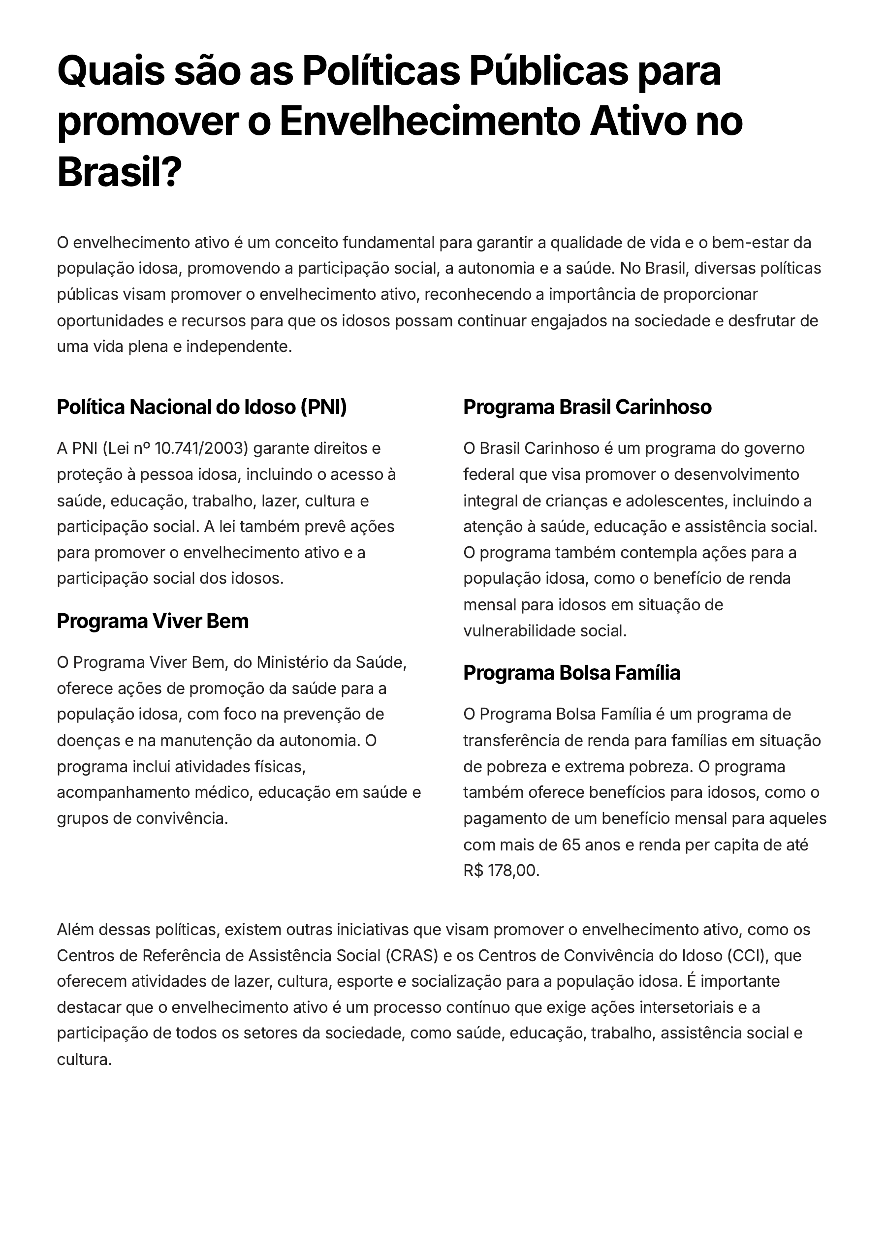 Quais são as Políticas Públicas para promover o Envelhecimento Ativo no Brasil? O envelhecimento ativo é um conceito fundamental para garantir a qualidade de vida e o bem-estar da população idosa, promovendo a participação social, a autonomia e a saúde. No Brasil, diversas políticas públicas visam promover o envelhecimento ativo, reconhecendo a importância de proporcionar oportunidades e recursos para que os idosos possam continuar engajados na sociedade e desfrutar de uma vida plena e independente. Política Nacional do Idoso (PNI) A PNI (Lei nº 10.741/2003) garante direitos e proteção à pessoa idosa, incluindo o acesso à saúde, educação, trabalho, lazer, cultura e participação social. A lei também prevê ações para promover o envelhecimento ativo e a participação social dos idosos. Programa Viver Bem O Programa Viver Bem, do Ministério da Saúde, oferece ações de promoção da saúde para a população idosa, com foco na prevenção de doenças e na manutenção da autonomia. O programa inclui atividades físicas, acompanhamento médico, educação em saúde e grupos de convivência. Programa Brasil Carinhoso O Brasil Carinhoso é um programa do governo federal que visa promover o desenvolvimento integral de crianças e adolescentes, incluindo a atenção à saúde, educação e assistência social. O programa também contempla ações para a população idosa, como o benefício de renda mensal para idosos em situação de vulnerabilidade social. Programa Bolsa Família O Programa Bolsa Família é um programa de transferência de renda para famílias em situação de pobreza e extrema pobreza. O programa também oferece benefícios para idosos, como o pagamento de um benefício mensal para aqueles com mais de 65 anos e renda per capita de até R$ 178,00. Além dessas políticas, existem outras iniciativas que visam promover o envelhecimento ativo, como os Centros de Referência de Assistência Social (CRAS) e os Centros de Convivência do Idoso (CCI), que oferecem atividades de lazer, cultura, esporte e socialização para a população idosa. É importante destacar que o envelhecimento ativo é um processo contínuo que exige ações intersetoriais e a participação de todos os setores da sociedade, como saúde, educação, trabalho, assistência social e cultura.