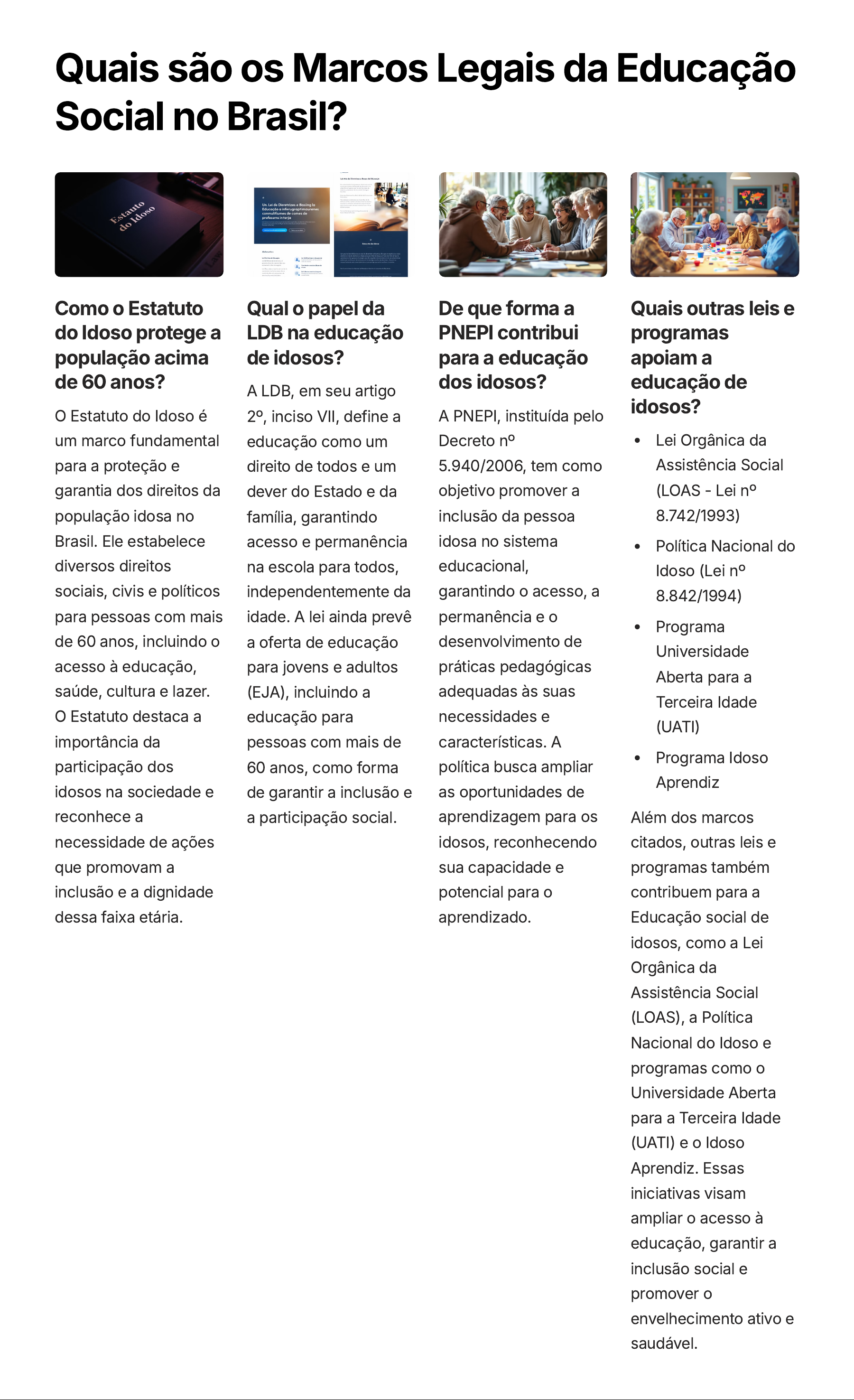 Quais são os Marcos Legais da Educação Social no Brasil? Como o Estatuto do Idoso protege a população acima de 60 anos? O Estatuto do Idoso é um marco fundamental para a proteção e garantia dos direitos da população idosa no Brasil. Ele estabelece diversos direitos sociais, civis e políticos para pessoas com mais de 60 anos, incluindo o acesso à educação, saúde, cultura e lazer. O Estatuto destaca a importância da participação dos idosos na sociedade e reconhece a necessidade de ações que promovam a inclusão e a dignidade dessa faixa etária. Qual o papel da LDB na educação de idosos? A LDB, em seu artigo 2º, inciso VII, define a educação como um direito de todos e um dever do Estado e da família, garantindo acesso e permanência na escola para todos, independentemente da idade. A lei ainda prevê a oferta de educação para jovens e adultos (EJA), incluindo a educação para pessoas com mais de 60 anos, como forma de garantir a inclusão e a participação social. De que forma a PNEPI contribui para a educação dos idosos? A PNEPI, instituída pelo Decreto nº 5.940/2006, tem como objetivo promover a inclusão da pessoa idosa no sistema educacional, garantindo o acesso, a permanência e o desenvolvimento de práticas pedagógicas adequadas às suas necessidades e características. A política busca ampliar as oportunidades de aprendizagem para os idosos, reconhecendo sua capacidade e potencial para o aprendizado. Quais outras leis e programas apoiam a educação de idosos? Lei Orgânica da Assistência Social (LOAS - Lei nº 8.742/1993) Política Nacional do Idoso (Lei nº 8.842/1994) Programa Universidade Aberta para a Terceira Idade (UATI) Programa Idoso Aprendiz Além dos marcos citados, outras leis e programas também contribuem para a Educação social de idosos, como a Lei Orgânica da Assistência Social (LOAS), a Política Nacional do Idoso e programas como o Universidade Aberta para a Terceira Idade (UATI) e o Idoso Aprendiz. Essas iniciativas visam ampliar o acesso à educação, garantir a inclusão social e promover o envelhecimento ativo e saudável.