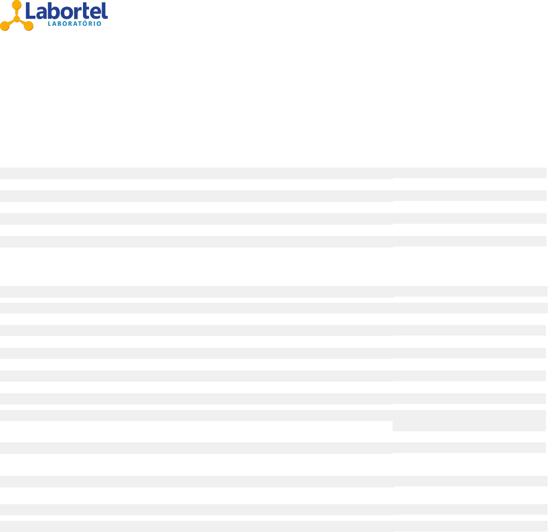 Hemograma Completo Material: Sangue Método: Analisador Automatizado (Contagem por impedância e análise celular por citometria de fluxo) SÉRIE VERMELHA Valores de Referência Hemácias 5,750 milhões/mm3 4,5 a 5,9 milhões/mm3 Hemoglobina 15,20 g/dL 13,5 a 17,5 g/dL Hematócrito 48,30 % 41,0 a 53,0 % V.C.M. 84,00 fL 80,0 a 98,0 fL H.C.M. 26,43 pg 27,0 a 32,0 pg C.H.C.M. 31,47 g/dL 31,0 a 35,0 g/dL R.D.W. (CV) 14,70 % 11,5 a 14,5 % R.D.W. (SD) 44,70 fL 38,6 a 49,1 fL SÉRIE BRANCA LEUCÓCITOS 5,26 milhares/mm3 5,0 a 10,0 milhares/mm3 (%) milhares/mm3 Blastos 0,00 0,0 Ausentes Pro-mielócitos 0,00 0,00 Ausentes Mielócitos 0,00 0,00 Ausentes Metamielócitos 0,00 0,00 Ausentes Neutrófilos Bastonetes 2,00 0,11 0,0 a 3,0 % (Até 830/mm3) Neutrófilos Segmentados 60,00 3,16 35 a 75 % (1.520 a 4.980/mm3) Eosinófilos 3,80 0,20 0,0 a 3,0 % (30 a 400/mm3) Basófilos 0,40 0,02 0,0 a 1,0 % (Até 80/mm3) Linfócitos típicos 27,90 1,47 20,0 a 50,0 % (900 a 3.400/mm3) Linfócitos atípicos 0,00 0,00 Ausentes Monócitos 5,90 0,31 2,0 a 10,0 % (240 a 680/mm3) Células Indiferenciadas 0,00 0,00 Ausentes Razão Neutrófilos/Linfócitos (NLR) 2,22 1,00 a 3,00 PLAQUETAS 198,00 milhares/mm3 140 a 400 milhares/mm3 M.P.V. 10,20 fL 7,5 a 11,5 fL Data/Hora Coleta: 05/08/2024 - 12:29:55 Data/Hora Liberação: 05/08/2024 - 17:29:39 * Amostra processada pelo analisador automático Sysmex Série-X. Liberado eletronicamente por Dra. Amanda de Resende Co - CRF-ES 4015 Página(s)....:1/11 Sr.(a).......: ALEXSANDRO GALDINO Data/Hora Atend...:05/08/2024 - 12:29:55 Solicitante..: TEREZA VALESKA NORONHA Nro. da OS........:1112-67057-2456 Procedência..: LABORTEL/UBS PR. LARANJEIRAS Convênio..........:1288-ESF PARQUE RES LARANJEIRAS - LABORTEL Data de Nasc.: 13/05/1995 Data/Hora Emissão.:07/08/2024 - 13:07:27 Av. Dido Fontes, Nº 10 - Jardim Tropical - Serra/ES - Tel.: (27) 3381-3888 | CNPJ: 27.414.515/011-66 LABORTEL LABORATORIO - ALVARA SANITARIO 3032019 - CNES 743205 - CRF-ES 6572 - RESPONSÁVEL TÉCNICO: GEISIBEL TEIXEIRA DE LIMA CRF-ES 5456 Todo teste laboratorial deve ser correlacionado com a clínica e interpretado pelo médico. ASSINATURA DIGITAL 14892EA1FC3B1FB79C9CA63E060930B6F82870A8C23E476DB0500E7699B3E65F046448885F5AEE4B Tempo e Atividade da Protrombina (TAP / INR) Material: Plasma em Citrato Método: Coagulometrico Automatizado Tempo (Paciente).......................: 12,1 segundos Atividade (Paciente)...................: 96,8 % VR: 70 a 100 % Relação Paciente/Controle..............: 1,02 INR (Relação Normatizada Internacional): 1,02 VR: Anticoagulação pré-operatória: Alvo: 2,5 (Limites: 2,0 a 3,0); Prevenção primária e secundária de trombose arterial: Alvo: 2,5 (Limites: 2,0 a 3,0); Acidente tromboembólico agudo e prevenção de tromboses venosas recidivantes: Alvo: 3,0 (Limites: 2,0 a 4,0); Próteses valvulares cardíacas e prevenção de tromboembolismo arterial: Alvo: 3,5 (Limites: 3,0 a 4,5). CONTROLE: Tempo (Controle).......................: 11,9 segundos Atividade (Controle)...................: 100 % Data/Hora Coleta: 05/08/2024 - 12:29:55 Data/Hora Liberacao: 05/08/2024 - 16:25:52 Liberado eletronicamente por Dra. Amanda de Resende Co - CRF-ES 4015 Página(s)....:2/11 Sr.(a).......: ALEXSANDRO GALDINO Data/Hora Atend...:05/08/2024 - 12:29:55 Solicitante..: TEREZA VALESKA NORONHA Nro. da OS........:1112-67057-2456 Procedência..: LABORTEL/UBS PR. LARANJEIRAS Convênio..........:1288-ESF PARQUE RES LARANJEIRAS - LABORTEL Data de Nasc.: 13/05/1995 Data/Hora Emissão.:07/08/2024 - 13:07:27 Av. Dido Fontes, Nº 10 - Jardim Tropical - Serra/ES - Tel.: (27) 3381-3888 | CNPJ: 27.414.515/011-66 LABORTEL LABORATORIO - ALVARA SANITARIO 3032019 - CNES 743205 - CRF-ES 6572 - RESPONSÁVEL TÉCNICO: GEISIBEL TEIXEIRA DE LIMA CRF-ES 5456 Todo teste laboratorial deve ser correlacionado com a clínica e interpretado pelo médico. ASSINATURA DIGITAL 14892EA1FC3B1FB79C9CA63E060930B6F82870A8C23E476DB0500E7699B3E65F046448885F5AEE4B Tempo de Tromboplastina Parcial Ativado (TTPa ou PTTK) Material : Plasma em Citrato Metodo : Coagulometrico Automatizado Tempo (Paciente) ....................: 30,5 seg Tempo (Controle) ....................: 28,0 seg Relação Paciente / Controle: 1,09 VR: Crianças até 17 anos e 11 meses: 22,3 segundos a 35,7 segundos ou Relação Paciente/Controle: 0,80 a 1,28 Para adultos a partir de 18 anos: 25,4 segundos a 33,4 segundos ou Relação Paciente/Controle: 0,91 a 1,20. Recém-nascidos e prematuros normais tem TTPA prolongado, que retorna ao normal ao redor dos 6 meses de idade. Ref.: Toulon P, Berruyer M, Brionne-François M, et al. Age dependency for coagulation parameters in paediatric populations. Results of a multicentre study aimed at defining the age-specific reference ranges. Thromb Haemost. 2016 Jul 4;116(1):9-16. doi: 10.1160/TH15-12-0964. Epub 2016 Mar 17 Data/Hora Coleta: 05/08/2024 - 12:29:55 Data/Hora Liberacao: 05/08/2024 - 16:25:52 Liberado eletronicamente por Dra. Amanda de Resende Co - CRF-ES 4015 Grupo (ABO) Sanguíneo " B " Material : Sangue Total (EDTA) Método : Aglutinação (Imunohematologia) Anteriores: Data/Hora Coleta: 05/08/2024 - 12:29:55 Data/Hora Liberação: 06/08/2024 - 18:54:24 Liberado eletronicamente por Dra. Amanda de Resende Co - CRF-ES 4015 30/11/23 16:03:10 05/08/24 12:29:55 0,6 0,8 1 1,2 1,4 1,6 1,19 1,09 Página(s)....:3/11 Sr.(a).......: ALEXSANDRO GALDINO Data/Hora Atend...:05/08/2024 - 12:29:55 Solicitante..: TEREZA VALESKA NORONHA Nro. da OS........:1112-67057-2456 Procedência..: LABORTEL/UBS PR. LARANJEIRAS Convênio..........:1288-ESF PARQUE RES LARANJEIRAS - LABORTEL Data de Nasc.: 13/05/1995 Data/Hora Emissão.:07/08/2024 - 13:07:27 Av. Dido Fontes, Nº 10 - Jardim Tropical - Serra/ES - Tel.: (27) 3381-3888 | CNPJ: 27.414.515/011-66 LABORTEL LABORATORIO - ALVARA SANITARIO 3032019 - CNES 743205 - CRF-ES 6572 - RESPONSÁVEL TÉCNICO: GEISIBEL TEIXEIRA DE LIMA CRF-ES 5456 Todo teste laboratorial deve ser correlacionado com a clí