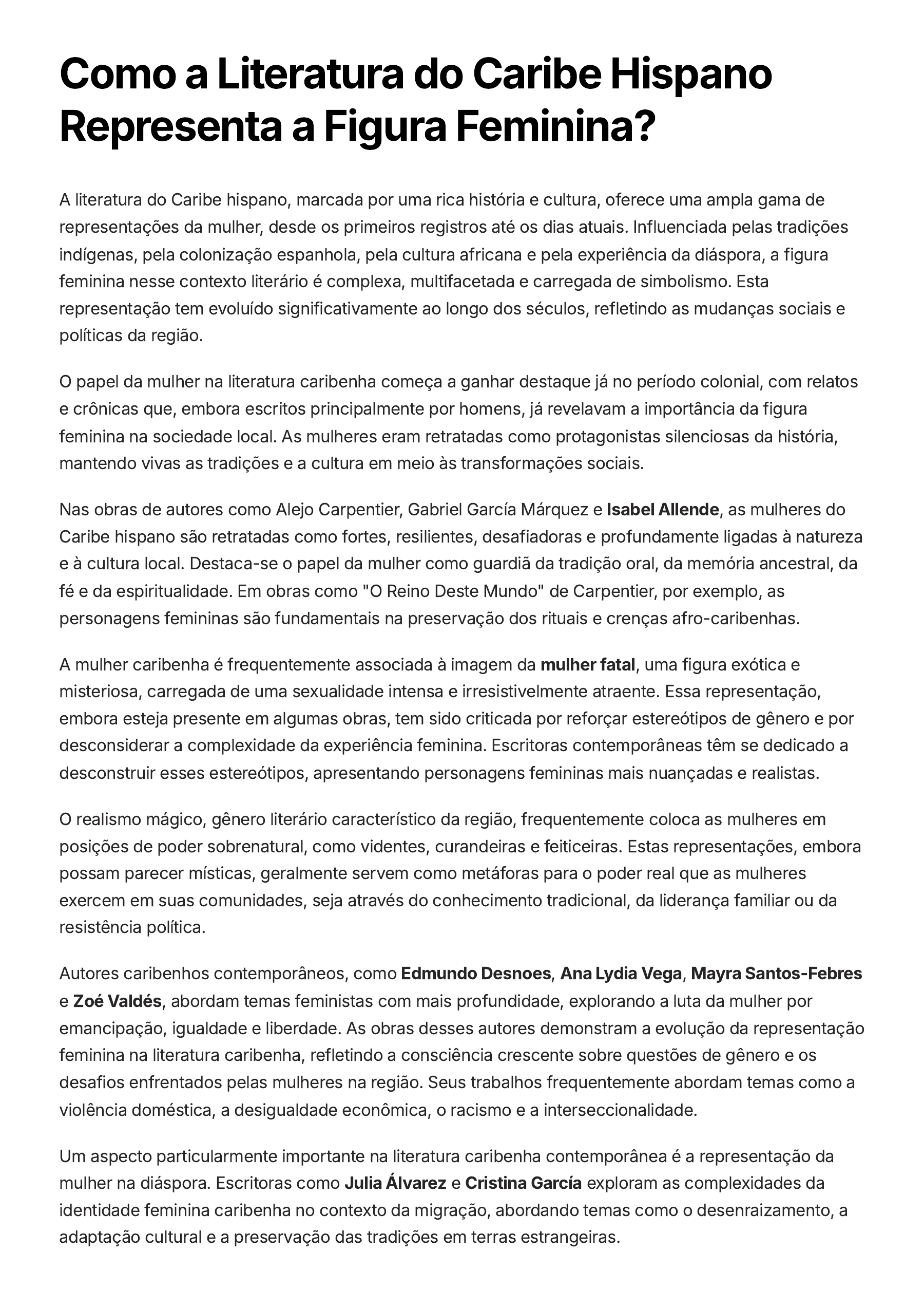 Como a Literatura do Caribe Hispano Representa a Figura Feminina? A literatura do Caribe hispano, marcada por uma rica história e cultura, oferece uma ampla gama de representações da mulher, desde os primeiros registros até os dias atuais. Influenciada pelas tradições indígenas, pela colonização espanhola, pela cultura africana e pela experiência da diáspora, a figura feminina nesse contexto literário é complexa, multifacetada e carregada de simbolismo. Esta representação tem evoluído significativamente ao longo dos séculos, refletindo as mudanças sociais e políticas da região. O papel da mulher na literatura caribenha começa a ganhar destaque já no período colonial, com relatos e crônicas que, embora escritos principalmente por homens, já revelavam a importância da figura feminina na sociedade local. As mulheres eram retratadas como protagonistas silenciosas da história, mantendo vivas as tradições e a cultura em meio às transformações sociais. Nas obras de autores como Alejo Carpentier, Gabriel García Márquez e Isabel Allende, as mulheres do Caribe hispano são retratadas como fortes, resilientes, desafiadoras e profundamente ligadas à natureza e à cultura local. Destaca-se o papel da mulher como guardiã da tradição oral, da memória ancestral, da fé e da espiritualidade. Em obras como "O Reino Deste Mundo" de Carpentier, por exemplo, as personagens femininas são fundamentais na preservação dos rituais e crenças afro-caribenhas. A mulher caribenha é frequentemente associada à imagem da mulher fatal, uma figura exótica e misteriosa, carregada de uma sexualidade intensa e irresistivelmente atraente. Essa representação, embora esteja presente em algumas obras, tem sido criticada por reforçar estereótipos de gênero e por desconsiderar a complexidade da experiência feminina. Escritoras contemporâneas têm se dedicado a desconstruir esses estereótipos, apresentando personagens femininas mais nuançadas e realistas. O realismo mágico, gênero literário característico da região, frequentemente coloca as mulheres em posições de poder sobrenatural, como videntes, curandeiras e feiticeiras. Estas representações, embora possam parecer místicas, geralmente servem como metáforas para o poder real que as mulheres exercem em suas comunidades, seja através do conhecimento tradicional, da liderança familiar ou da resistência política. Autores caribenhos contemporâneos, como Edmundo Desnoes, Ana Lydia Vega, Mayra Santos-Febres e Zoé Valdés, abordam temas feministas com mais profundidade, explorando a luta da mulher por emancipação, igualdade e liberdade. As obras desses autores demonstram a evolução da representação feminina na literatura caribenha, refletindo a consciência crescente sobre questões de gênero e os desafios enfrentados pelas mulheres na região. Seus trabalhos frequentemente abordam temas como a violência doméstica, a desigualdade econômica, o racismo e a interseccionalidade. Um aspecto particularmente importante na literatura caribenha contemporânea é a representação da mulher na diáspora. Escritoras como Julia Álvarez e Cristina García exploram as complexidades da identidade feminina caribenha no contexto da migração, abordando temas como o desenraizamento, a adaptação cultural e a preservação das tradições em terras estrangeiras.