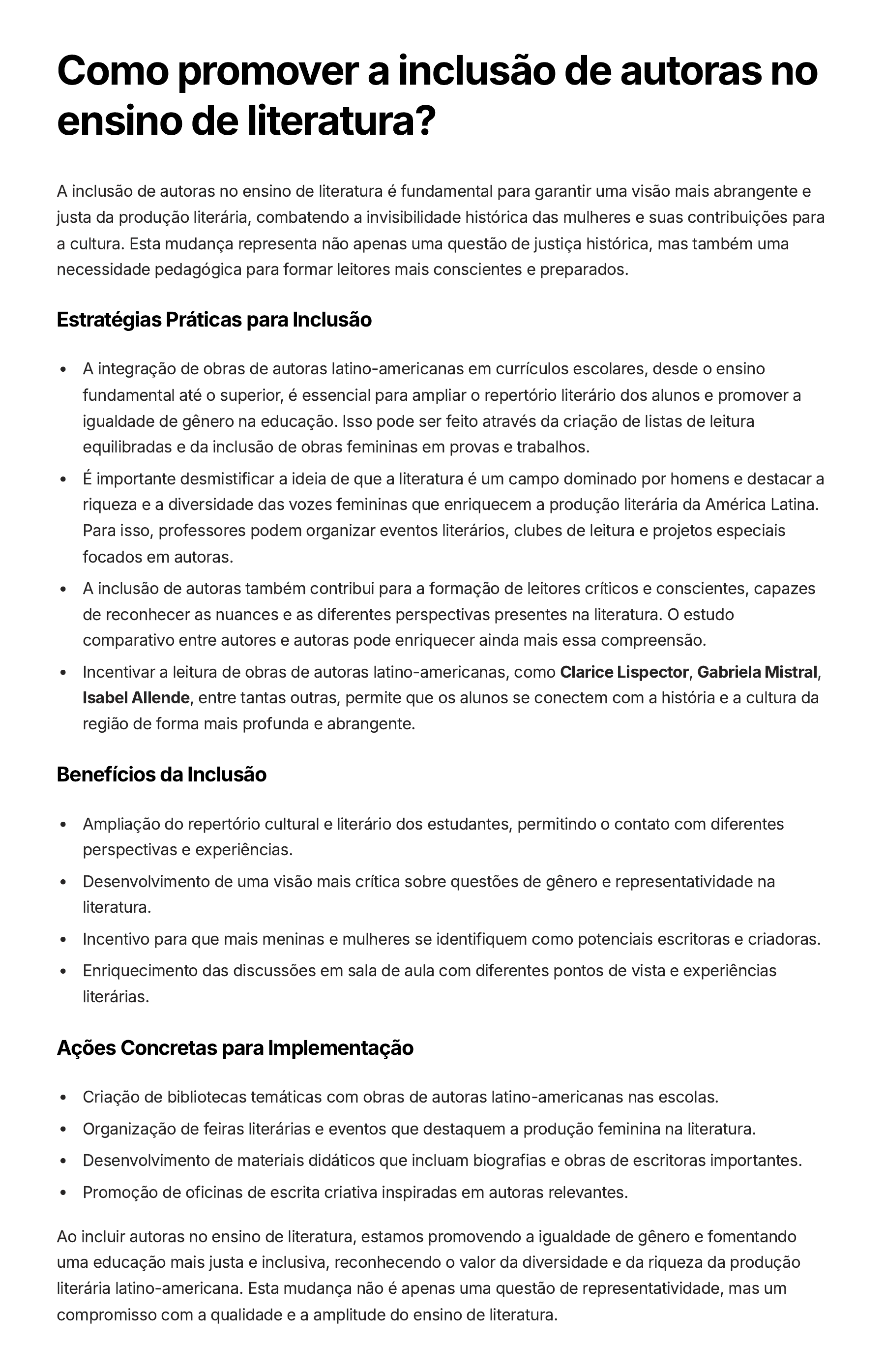Como promover a inclusão de autoras no ensino de literatura? A inclusão de autoras no ensino de literatura é fundamental para garantir uma visão mais abrangente e justa da produção literária, combatendo a invisibilidade histórica das mulheres e suas contribuições para a cultura. Esta mudança representa não apenas uma questão de justiça histórica, mas também uma necessidade pedagógica para formar leitores mais conscientes e preparados. Estratégias Práticas para Inclusão A integração de obras de autoras latino-americanas em currículos escolares, desde o ensino fundamental até o superior, é essencial para ampliar o repertório literário dos alunos e promover a igualdade de gênero na educação. Isso pode ser feito através da criação de listas de leitura equilibradas e da inclusão de obras femininas em provas e trabalhos. É importante desmistificar a ideia de que a literatura é um campo dominado por homens e destacar a riqueza e a diversidade das vozes femininas que enriquecem a produção literária da América Latina. Para isso, professores podem organizar eventos literários, clubes de leitura e projetos especiais focados em autoras. A inclusão de autoras também contribui para a formação de leitores críticos e conscientes, capazes de reconhecer as nuances e as diferentes perspectivas presentes na literatura. O estudo comparativo entre autores e autoras pode enriquecer ainda mais essa compreensão. Incentivar a leitura de obras de autoras latino-americanas, como Clarice Lispector, Gabriela Mistral, Isabel Allende, entre tantas outras, permite que os alunos se conectem com a história e a cultura da região de forma mais profunda e abrangente. Benefícios da Inclusão Ampliação do repertório cultural e literário dos estudantes, permitindo o contato com diferentes perspectivas e experiências. Desenvolvimento de uma visão mais crítica sobre questões de gênero e representatividade na literatura. Incentivo para que mais meninas e mulheres se identifiquem como potenciais escritoras e criadoras. Enriquecimento das discussões em sala de aula com diferentes pontos de vista e experiências literárias. Ações Concretas para Implementação Criação de bibliotecas temáticas com obras de autoras latino-americanas nas escolas. Organização de feiras literárias e eventos que destaquem a produção feminina na literatura. Desenvolvimento de materiais didáticos que incluam biografias e obras de escritoras importantes. Promoção de oficinas de escrita criativa inspiradas em autoras relevantes. Ao incluir autoras no ensino de literatura, estamos promovendo a igualdade de gênero e fomentando uma educação mais justa e inclusiva, reconhecendo o valor da diversidade e da riqueza da produção literária latino-americana. Esta mudança não é apenas uma questão de representatividade, mas um compromisso com a qualidade e a amplitude do ensino de literatura.