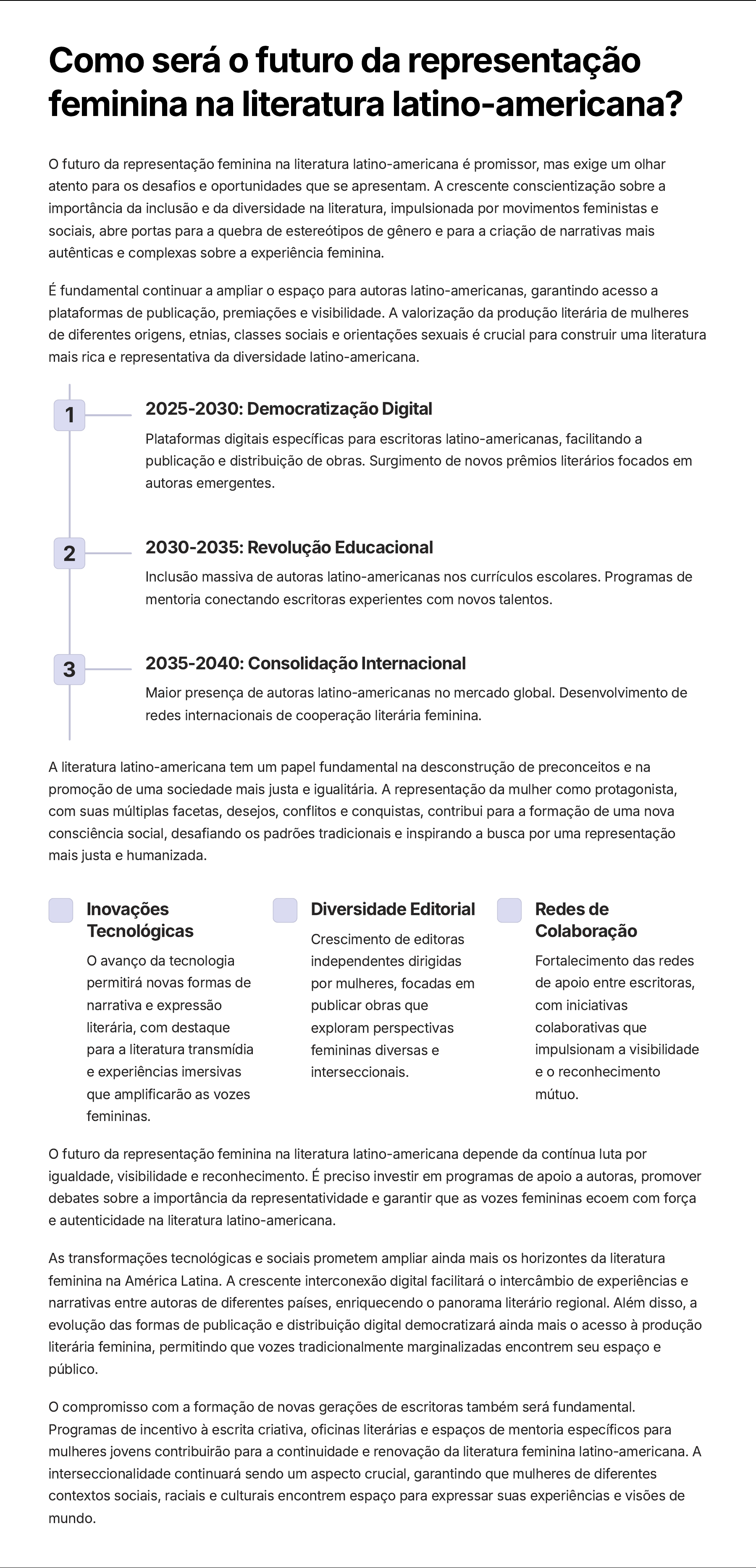 Como será o futuro da representação feminina na literatura latino-americana? O futuro da representação feminina na literatura latino-americana é promissor, mas exige um olhar atento para os desafios e oportunidades que se apresentam. A crescente conscientização sobre a importância da inclusão e da diversidade na literatura, impulsionada por movimentos feministas e sociais, abre portas para a quebra de estereótipos de gênero e para a criação de narrativas mais autênticas e complexas sobre a experiência feminina. É fundamental continuar a ampliar o espaço para autoras latino-americanas, garantindo acesso a plataformas de publicação, premiações e visibilidade. A valorização da produção literária de mulheres de diferentes origens, etnias, classes sociais e orientações sexuais é crucial para construir uma literatura mais rica e representativa da diversidade latino-americana. 1 2025-2030: Democratização Digital Plataformas digitais específicas para escritoras latino-americanas, facilitando a publicação e distribuição de obras. Surgimento de novos prêmios literários focados em autoras emergentes. 2 2030-2035: Revolução Educacional Inclusão massiva de autoras latino-americanas nos currículos escolares. Programas de mentoria conectando escritoras experientes com novos talentos. 3 2035-2040: Consolidação Internacional Maior presença de autoras latino-americanas no mercado global. Desenvolvimento de redes internacionais de cooperação literária feminina. A literatura latino-americana tem um papel fundamental na desconstrução de preconceitos e na promoção de uma sociedade mais justa e igualitária. A representação da mulher como protagonista, com suas múltiplas facetas, desejos, conflitos e conquistas, contribui para a formação de uma nova consciência social, desafiando os padrões tradicionais e inspirando a busca por uma representação mais justa e humanizada. Inovações Tecnológicas O avanço da tecnologia permitirá novas formas de narrativa e expressão literária, com destaque para a literatura transmídia e experiências imersivas que amplificarão as vozes femininas. Diversidade Editorial Crescimento de editoras independentes dirigidas por mulheres, focadas em publicar obras que exploram perspectivas femininas diversas e interseccionais. Redes de Colaboração Fortalecimento das redes de apoio entre escritoras, com iniciativas colaborativas que impulsionam a visibilidade e o reconhecimento mútuo. O futuro da representação feminina na literatura latino-americana depende da contínua luta por igualdade, visibilidade e reconhecimento. É preciso investir em programas de apoio a autoras, promover debates sobre a importância da representatividade e garantir que as vozes femininas ecoem com força e autenticidade na literatura latino-americana. As transformações tecnológicas e sociais prometem ampliar ainda mais os horizontes da literatura feminina na América Latina. A crescente interconexão digital facilitará o intercâmbio de experiências e narrativas entre autoras de diferentes países, enriquecendo o panorama literário regional. Além disso, a evolução das formas de publicação e distribuição digital democratizará ainda mais o acesso à produção literária feminina, permitindo que vozes tradicionalmente marginalizadas encontrem seu espaço e público. O compromisso com a formação de novas gerações de escritoras também será fundamental. Programas de incentivo à escrita criativa, oficinas literárias e espaços de mentoria específicos para mulheres jovens contribuirão para a continuidade e renovação da literatura feminina latino-americana. A interseccionalidade continuará sendo um aspecto crucial, garantindo que mulheres de diferentes contextos sociais, raciais e culturais encontrem espaço para expressar suas experiências e visões de mundo.