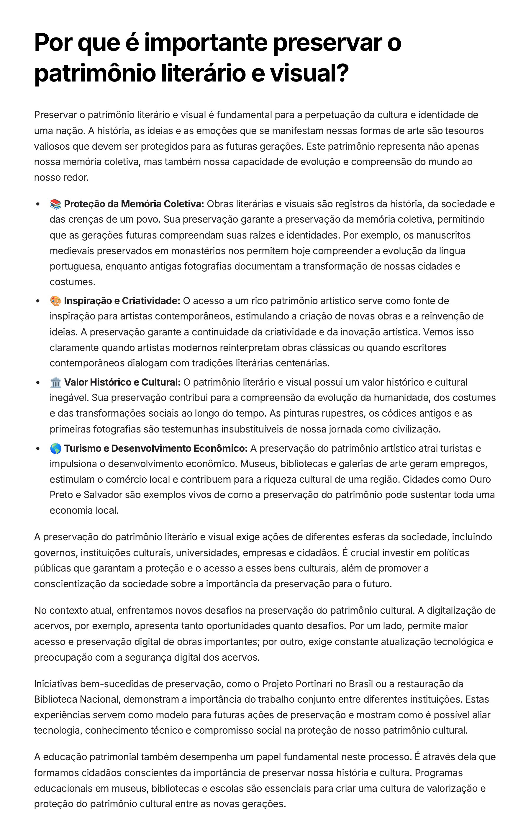 Por que é importante preservar o patrimônio literário e visual? Preservar o patrimônio literário e visual é fundamental para a perpetuação da cultura e identidade de uma nação. A história, as ideias e as emoções que se manifestam nessas formas de arte são tesouros valiosos que devem ser protegidos para as futuras gerações. Este patrimônio representa não apenas nossa memória coletiva, mas também nossa capacidade de evolução e compreensão do mundo ao nosso redor. È Proteção da Memória Coletiva: Obras literárias e visuais são registros da história, da sociedade e das crenças de um povo. Sua preservação garante a preservação da memória coletiva, permitindo que as gerações futuras compreendam suas raízes e identidades. Por exemplo, os manuscritos medievais preservados em monastérios nos permitem hoje compreender a evolução da língua portuguesa, enquanto antigas fotografias documentam a transformação de nossas cidades e costumes. � Inspiração e Criatividade: O acesso a um rico patrimônio artístico serve como fonte de inspiração para artistas contemporâneos, estimulando a criação de novas obras e a reinvenção de ideias. A preservação garante a continuidade da criatividade e da inovação artística. Vemos isso claramente quando artistas modernos reinterpretam obras clássicas ou quando escritores contemporâneos dialogam com tradições literárias centenárias. Ë Valor Histórico e Cultural: O patrimônio literário e visual possui um valor histórico e cultural inegável. Sua preservação contribui para a compreensão da evolução da humanidade, dos costumes e das transformações sociais ao longo do tempo. As pinturas rupestres, os códices antigos e as primeiras fotografias são testemunhas insubstituíveis de nossa jornada como civilização. � Turismo e Desenvolvimento Econômico: A preservação do patrimônio artístico atrai turistas e impulsiona o desenvolvimento econômico. Museus, bibliotecas e galerias de arte geram empregos, estimulam o comércio local e contribuem para a riqueza cultural de uma região. Cidades como Ouro Preto e Salvador são exemplos vivos de como a preservação do patrimônio pode sustentar toda uma economia local. A preservação do patrimônio literário e visual exige ações de diferentes esferas da sociedade, incluindo governos, instituições culturais, universidades, empresas e cidadãos. É crucial investir em políticas públicas que garantam a proteção e o acesso a esses bens culturais, além de promover a conscientização da sociedade sobre a importância da preservação para o futuro. No contexto atual, enfrentamos novos desafios na preservação do patrimônio cultural. A digitalização de acervos, por exemplo, apresenta tanto oportunidades quanto desafios. Por um lado, permite maior acesso e preservação digital de obras importantes; por outro, exige constante atualização tecnológica e preocupação com a segurança digital dos acervos. Iniciativas bem-sucedidas de preservação, como o Projeto Portinari no Brasil ou a restauração da Biblioteca Nacional, demonstram a importância do trabalho conjunto entre diferentes instituições. Estas experiências servem como modelo para futuras ações de preservação e mostram como é possível aliar tecnologia, conhecimento técnico e compromisso social na proteção de nosso patrimônio cultural. A educação patrimonial também desempenha um papel fundamental neste processo. É através dela que formamos cidadãos conscientes da importância de preservar nossa história e cultura. Programas educacionais em museus, bibliotecas e escolas são essenciais para criar uma cultura de valorização e proteção do patrimônio cultural entre as novas gerações.