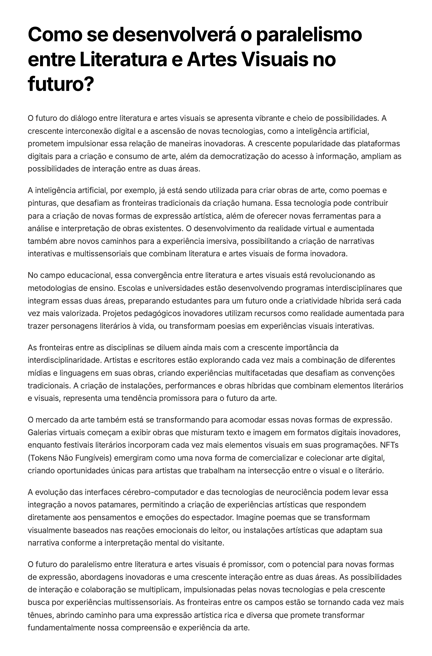 Como se desenvolverá o paralelismo entre Literatura e Artes Visuais no futuro? O futuro do diálogo entre literatura e artes visuais se apresenta vibrante e cheio de possibilidades. A crescente interconexão digital e a ascensão de novas tecnologias, como a inteligência artificial, prometem impulsionar essa relação de maneiras inovadoras. A crescente popularidade das plataformas digitais para a criação e consumo de arte, além da democratização do acesso à informação, ampliam as possibilidades de interação entre as duas áreas. A inteligência artificial, por exemplo, já está sendo utilizada para criar obras de arte, como poemas e pinturas, que desafiam as fronteiras tradicionais da criação humana. Essa tecnologia pode contribuir para a criação de novas formas de expressão artística, além de oferecer novas ferramentas para a análise e interpretação de obras existentes. O desenvolvimento da realidade virtual e aumentada também abre novos caminhos para a experiência imersiva, possibilitando a criação de narrativas interativas e multissensoriais que combinam literatura e artes visuais de forma inovadora. No campo educacional, essa convergência entre literatura e artes visuais está revolucionando as metodologias de ensino. Escolas e universidades estão desenvolvendo programas interdisciplinares que integram essas duas áreas, preparando estudantes para um futuro onde a criatividade híbrida será cada vez mais valorizada. Projetos pedagógicos inovadores utilizam recursos como realidade aumentada para trazer personagens literários à vida, ou transformam poesias em experiências visuais interativas. As fronteiras entre as disciplinas se diluem ainda mais com a crescente importância da interdisciplinaridade. Artistas e escritores estão explorando cada vez mais a combinação de diferentes mídias e linguagens em suas obras, criando experiências multifacetadas que desafiam as convenções tradicionais. A criação de instalações, performances e obras híbridas que combinam elementos literários e visuais, representa uma tendência promissora para o futuro da arte. O mercado da arte também está se transformando para acomodar essas novas formas de expressão. Galerias virtuais começam a exibir obras que misturam texto e imagem em formatos digitais inovadores, enquanto festivais literários incorporam cada vez mais elementos visuais em suas programações. NFTs (Tokens Não Fungíveis) emergiram como uma nova forma de comercializar e colecionar arte digital, criando oportunidades únicas para artistas que trabalham na intersecção entre o visual e o literário. A evolução das interfaces cérebro-computador e das tecnologias de neurociência podem levar essa integração a novos patamares, permitindo a criação de experiências artísticas que respondem diretamente aos pensamentos e emoções do espectador. Imagine poemas que se transformam visualmente baseados nas reações emocionais do leitor, ou instalações artísticas que adaptam sua narrativa conforme a interpretação mental do visitante. O futuro do paralelismo entre literatura e artes visuais é promissor, com o potencial para novas formas de expressão, abordagens inovadoras e uma crescente interação entre as duas áreas. As possibilidades de interação e colaboração se multiplicam, impulsionadas pelas novas tecnologias e pela crescente busca por experiências multissensoriais. As fronteiras entre os campos estão se tornando cada vez mais tênues, abrindo caminho para uma expressão artística rica e diversa que promete transformar fundamentalmente nossa compreensão e experiência da arte.
