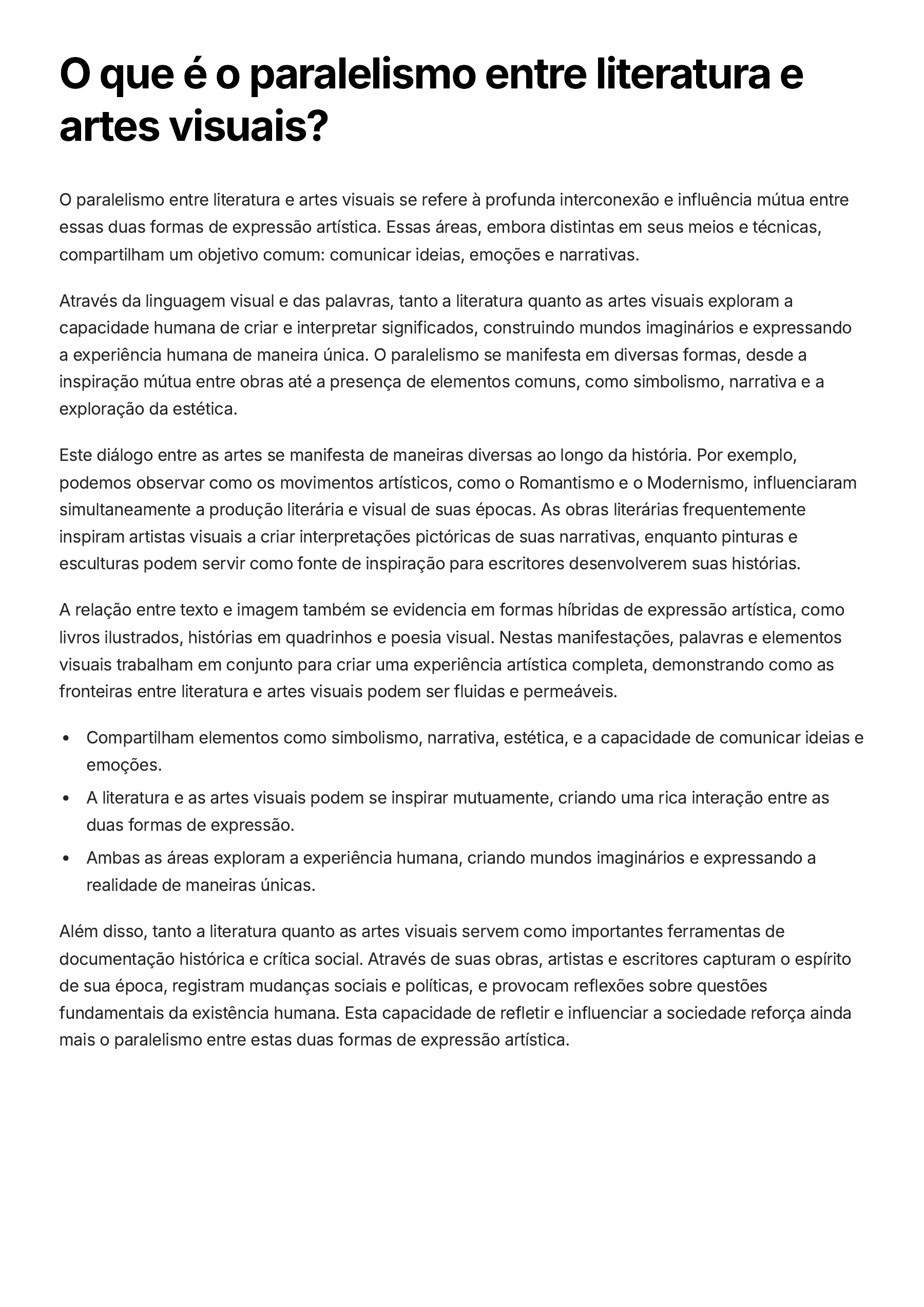 O que é o paralelismo entre literatura e artes visuais? O paralelismo entre literatura e artes visuais se refere à profunda interconexão e influência mútua entre essas duas formas de expressão artística. Essas áreas, embora distintas em seus meios e técnicas, compartilham um objetivo comum: comunicar ideias, emoções e narrativas. Através da linguagem visual e das palavras, tanto a literatura quanto as artes visuais exploram a capacidade humana de criar e interpretar significados, construindo mundos imaginários e expressando a experiência humana de maneira única. O paralelismo se manifesta em diversas formas, desde a inspiração mútua entre obras até a presença de elementos comuns, como simbolismo, narrativa e a exploração da estética. Este diálogo entre as artes se manifesta de maneiras diversas ao longo da história. Por exemplo, podemos observar como os movimentos artísticos, como o Romantismo e o Modernismo, influenciaram simultaneamente a produção literária e visual de suas épocas. As obras literárias frequentemente inspiram artistas visuais a criar interpretações pictóricas de suas narrativas, enquanto pinturas e esculturas podem servir como fonte de inspiração para escritores desenvolverem suas histórias. A relação entre texto e imagem também se evidencia em formas híbridas de expressão artística, como livros ilustrados, histórias em quadrinhos e poesia visual. Nestas manifestações, palavras e elementos visuais trabalham em conjunto para criar uma experiência artística completa, demonstrando como as fronteiras entre literatura e artes visuais podem ser fluidas e permeáveis. Compartilham elementos como simbolismo, narrativa, estética, e a capacidade de comunicar ideias e emoções. A literatura e as artes visuais podem se inspirar mutuamente, criando uma rica interação entre as duas formas de expressão. Ambas as áreas exploram a experiência humana, criando mundos imaginários e expressando a realidade de maneiras únicas. Além disso, tanto a literatura quanto as artes visuais servem como importantes ferramentas de documentação histórica e crítica social. Através de suas obras, artistas e escritores capturam o espírito de sua época, registram mudanças sociais e políticas, e provocam reflexões sobre questões fundamentais da existência humana. Esta capacidade de refletir e influenciar a sociedade reforça ainda mais o paralelismo entre estas duas formas de expressão artística.