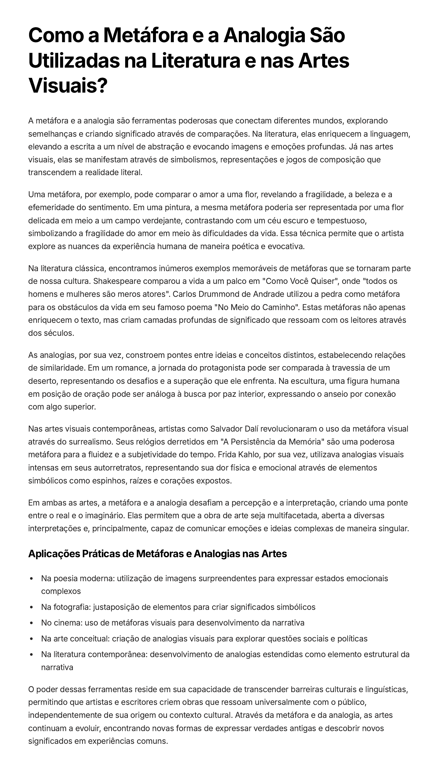 Como a Metáfora e a Analogia São Utilizadas na Literatura e nas Artes Visuais? A metáfora e a analogia são ferramentas poderosas que conectam diferentes mundos, explorando semelhanças e criando significado através de comparações. Na literatura, elas enriquecem a linguagem, elevando a escrita a um nível de abstração e evocando imagens e emoções profundas. Já nas artes visuais, elas se manifestam através de simbolismos, representações e jogos de composição que transcendem a realidade literal. Uma metáfora, por exemplo, pode comparar o amor a uma flor, revelando a fragilidade, a beleza e a efemeridade do sentimento. Em uma pintura, a mesma metáfora poderia ser representada por uma flor delicada em meio a um campo verdejante, contrastando com um céu escuro e tempestuoso, simbolizando a fragilidade do amor em meio às dificuldades da vida. Essa técnica permite que o artista explore as nuances da experiência humana de maneira poética e evocativa. Na literatura clássica, encontramos inúmeros exemplos memoráveis de metáforas que se tornaram parte de nossa cultura. Shakespeare comparou a vida a um palco em "Como Você Quiser", onde "todos os homens e mulheres são meros atores". Carlos Drummond de Andrade utilizou a pedra como metáfora para os obstáculos da vida em seu famoso poema "No Meio do Caminho". Estas metáforas não apenas enriquecem o texto, mas criam camadas profundas de significado que ressoam com os leitores através dos séculos. As analogias, por sua vez, constroem pontes entre ideias e conceitos distintos, estabelecendo relações de similaridade. Em um romance, a jornada do protagonista pode ser comparada à travessia de um deserto, representando os desafios e a superação que ele enfrenta. Na escultura, uma figura humana em posição de oração pode ser análoga à busca por paz interior, expressando o anseio por conexão com algo superior. Nas artes visuais contemporâneas, artistas como Salvador Dalí revolucionaram o uso da metáfora visual através do surrealismo. Seus relógios derretidos em "A Persistência da Memória" são uma poderosa metáfora para a fluidez e a subjetividade do tempo. Frida Kahlo, por sua vez, utilizava analogias visuais intensas em seus autorretratos, representando sua dor física e emocional através de elementos simbólicos como espinhos, raízes e corações expostos. Em ambas as artes, a metáfora e a analogia desafiam a percepção e a interpretação, criando uma ponte entre o real e o imaginário. Elas permitem que a obra de arte seja multifacetada, aberta a diversas interpretações e, principalmente, capaz de comunicar emoções e ideias complexas de maneira singular. Aplicações Práticas de Metáforas e Analogias nas Artes Na poesia moderna: utilização de imagens surpreendentes para expressar estados emocionais complexos Na fotografia: justaposição de elementos para criar significados simbólicos No cinema: uso de metáforas visuais para desenvolvimento da narrativa Na arte conceitual: criação de analogias visuais para explorar questões sociais e políticas Na literatura contemporânea: desenvolvimento de analogias estendidas como elemento estrutural da narrativa O poder dessas ferramentas reside em sua capacidade de transcender barreiras culturais e linguísticas, permitindo que artistas e escritores criem obras que ressoam universalmente com o público, independentemente de sua origem ou contexto cultural. Através da metáfora e da analogia, as artes continuam a evoluir, encontrando novas formas de expressar verdades antigas e descobrir novos significados em experiências comuns.