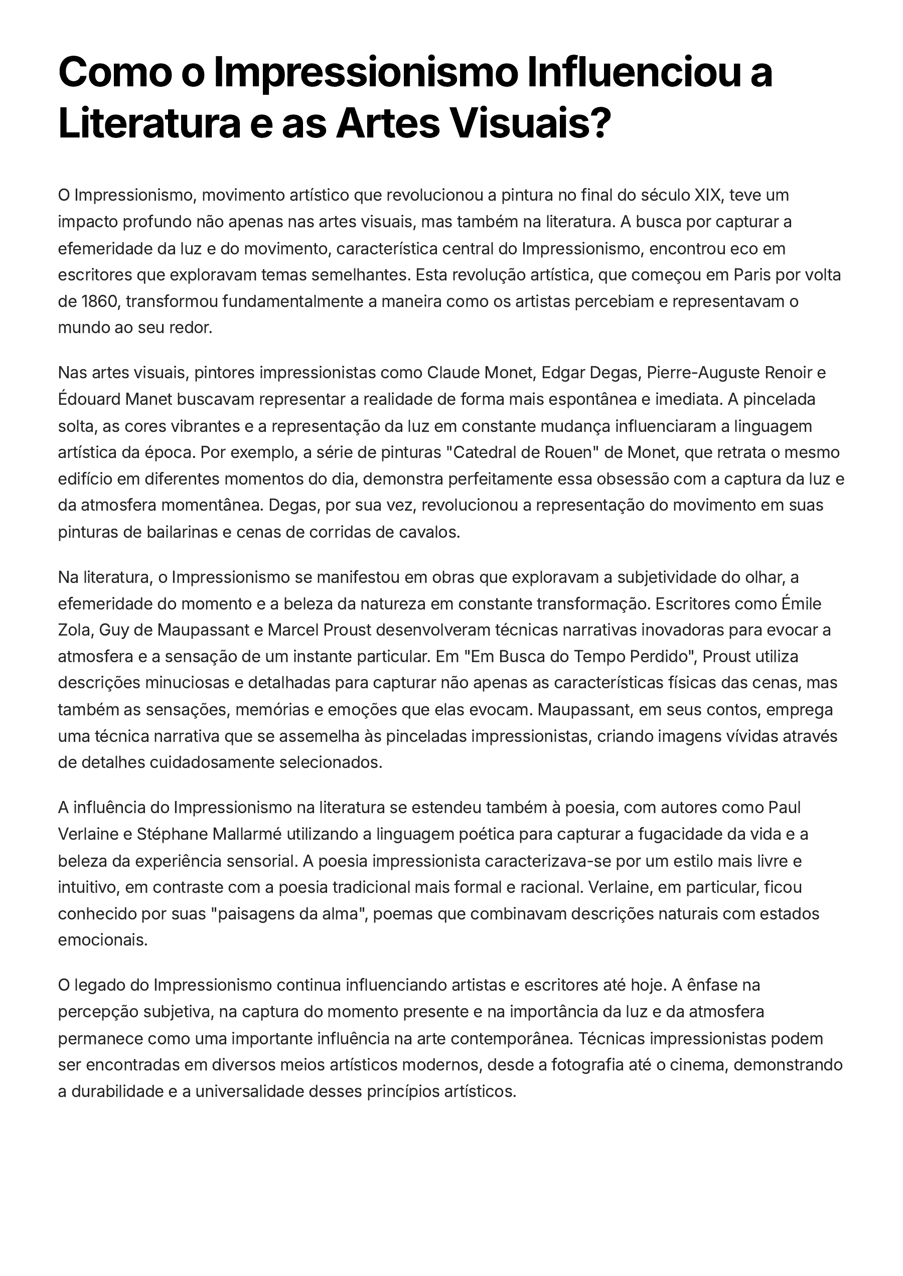 Como o Impressionismo Influenciou a Literatura e as Artes Visuais? O Impressionismo, movimento artístico que revolucionou a pintura no final do século XIX, teve um impacto profundo não apenas nas artes visuais, mas também na literatura. A busca por capturar a efemeridade da luz e do movimento, característica central do Impressionismo, encontrou eco em escritores que exploravam temas semelhantes. Esta revolução artística, que começou em Paris por volta de 1860, transformou fundamentalmente a maneira como os artistas percebiam e representavam o mundo ao seu redor. Nas artes visuais, pintores impressionistas como Claude Monet, Edgar Degas, Pierre-Auguste Renoir e Édouard Manet buscavam representar a realidade de forma mais espontânea e imediata. A pincelada solta, as cores vibrantes e a representação da luz em constante mudança influenciaram a linguagem artística da época. Por exemplo, a série de pinturas "Catedral de Rouen" de Monet, que retrata o mesmo edifício em diferentes momentos do dia, demonstra perfeitamente essa obsessão com a captura da luz e da atmosfera momentânea. Degas, por sua vez, revolucionou a representação do movimento em suas pinturas de bailarinas e cenas de corridas de cavalos. Na literatura, o Impressionismo se manifestou em obras que exploravam a subjetividade do olhar, a efemeridade do momento e a beleza da natureza em constante transformação. Escritores como Émile Zola, Guy de Maupassant e Marcel Proust desenvolveram técnicas narrativas inovadoras para evocar a atmosfera e a sensação de um instante particular. Em "Em Busca do Tempo Perdido", Proust utiliza descrições minuciosas e detalhadas para capturar não apenas as características físicas das cenas, mas também as sensações, memórias e emoções que elas evocam. Maupassant, em seus contos, emprega uma técnica narrativa que se assemelha às pinceladas impressionistas, criando imagens vívidas através de detalhes cuidadosamente selecionados. A influência do Impressionismo na literatura se estendeu também à poesia, com autores como Paul Verlaine e Stéphane Mallarmé utilizando a linguagem poética para capturar a fugacidade da vida e a beleza da experiência sensorial. A poesia impressionista caracterizava-se por um estilo mais livre e intuitivo, em contraste com a poesia tradicional mais formal e racional. Verlaine, em particular, ficou conhecido por suas "paisagens da alma", poemas que combinavam descrições naturais com estados emocionais. O legado do Impressionismo continua influenciando artistas e escritores até hoje. A ênfase na percepção subjetiva, na captura do momento presente e na importância da luz e da atmosfera permanece como uma importante influência na arte contemporânea. Técnicas impressionistas podem ser encontradas em diversos meios artísticos modernos, desde a fotografia até o cinema, demonstrando a durabilidade e a universalidade desses princípios artísticos.