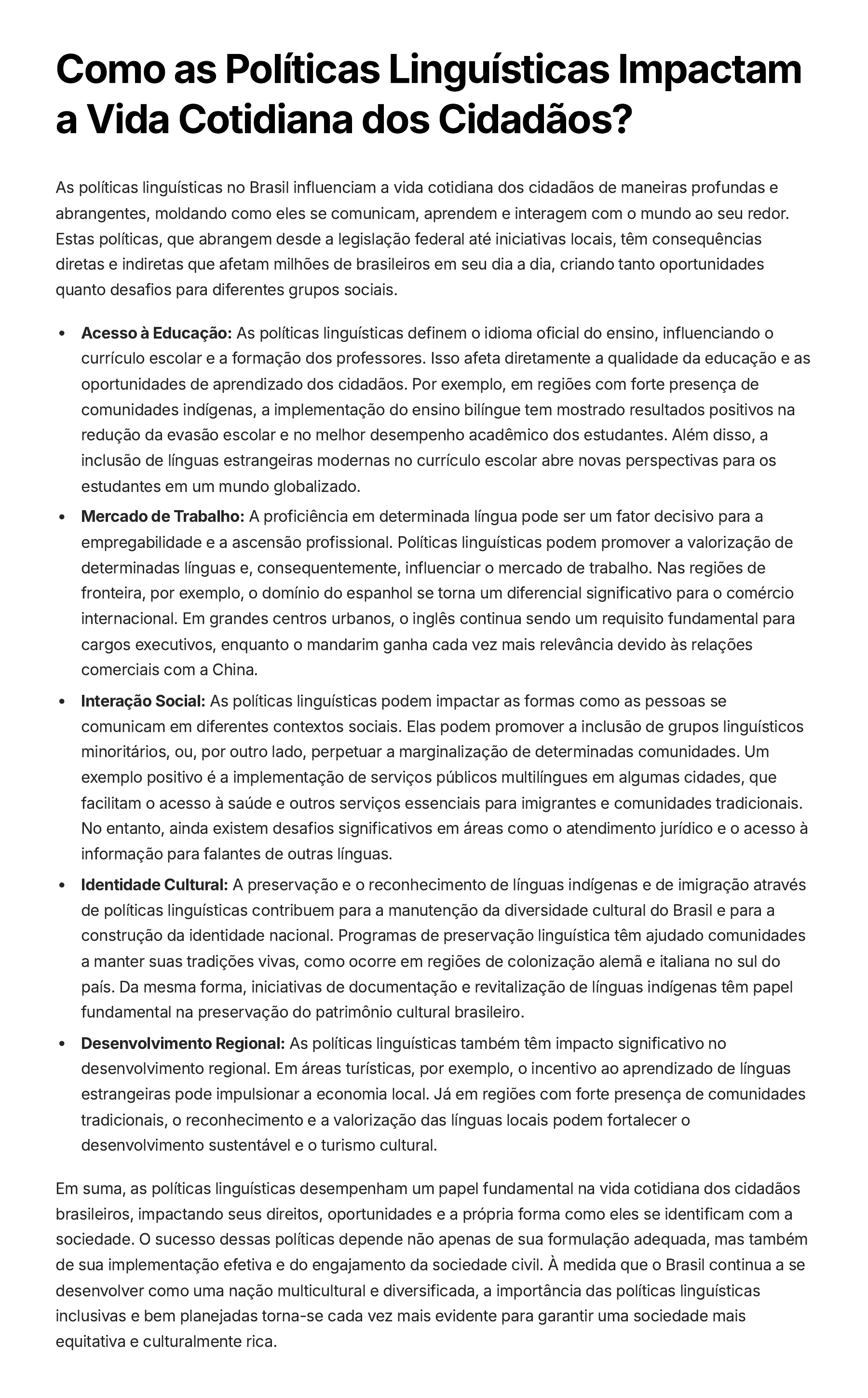 Como as Políticas Linguísticas Impactam a Vida Cotidiana dos Cidadãos? As políticas linguísticas no Brasil influenciam a vida cotidiana dos cidadãos de maneiras profundas e abrangentes, moldando como eles se comunicam, aprendem e interagem com o mundo ao seu redor. Estas políticas, que abrangem desde a legislação federal até iniciativas locais, têm consequências diretas e indiretas que afetam milhões de brasileiros em seu dia a dia, criando tanto oportunidades quanto desafios para diferentes grupos sociais. Acesso à Educação: As políticas linguísticas definem o idioma oficial do ensino, influenciando o currículo escolar e a formação dos professores. Isso afeta diretamente a qualidade da educação e as oportunidades de aprendizado dos cidadãos. Por exemplo, em regiões com forte presença de comunidades indígenas, a implementação do ensino bilíngue tem mostrado resultados positivos na redução da evasão escolar e no melhor desempenho acadêmico dos estudantes. Além disso, a inclusão de línguas estrangeiras modernas no currículo escolar abre novas perspectivas para os estudantes em um mundo globalizado. Mercado de Trabalho: A proficiência em determinada língua pode ser um fator decisivo para a empregabilidade e a ascensão profissional. Políticas linguísticas podem promover a valorização de determinadas línguas e, consequentemente, influenciar o mercado de trabalho. Nas regiões de fronteira, por exemplo, o domínio do espanhol se torna um diferencial significativo para o comércio internacional. Em grandes centros urbanos, o inglês continua sendo um requisito fundamental para cargos executivos, enquanto o mandarim ganha cada vez mais relevância devido às relações comerciais com a China. Interação Social: As políticas linguísticas podem impactar as formas como as pessoas se comunicam em diferentes contextos sociais. Elas podem promover a inclusão de grupos linguísticos minoritários, ou, por outro lado, perpetuar a marginalização de determinadas comunidades. Um exemplo positivo é a implementação de serviços públicos multilíngues em algumas cidades, que facilitam o acesso à saúde e outros serviços essenciais para imigrantes e comunidades tradicionais. No entanto, ainda existem desafios significativos em áreas como o atendimento jurídico e o acesso à informação para falantes de outras línguas. Identidade Cultural: A preservação e o reconhecimento de línguas indígenas e de imigração através de políticas linguísticas contribuem para a manutenção da diversidade cultural do Brasil e para a construção da identidade nacional. Programas de preservação linguística têm ajudado comunidades a manter suas tradições vivas, como ocorre em regiões de colonização alemã e italiana no sul do país. Da mesma forma, iniciativas de documentação e revitalização de línguas indígenas têm papel fundamental na preservação do patrimônio cultural brasileiro. Desenvolvimento Regional: As políticas linguísticas também têm impacto significativo no desenvolvimento regional. Em áreas turísticas, por exemplo, o incentivo ao aprendizado de línguas estrangeiras pode impulsionar a economia local. Já em regiões com forte presença de comunidades tradicionais, o reconhecimento e a valorização das línguas locais podem fortalecer o desenvolvimento sustentável e o turismo cultural. Em suma, as políticas linguísticas desempenham um papel fundamental na vida cotidiana dos cidadãos brasileiros, impactando seus direitos, oportunidades e a própria forma como eles se identificam com a sociedade. O sucesso dessas políticas depende não apenas de sua formulação adequada, mas também de sua implementação efetiva e do engajamento da sociedade civil. À medida que o Brasil continua a se desenvolver como uma nação multicultural e diversificada, a importância das políticas linguísticas inclusivas e bem planejadas torna-se cada vez mais evidente para garantir uma sociedade mais equitativa e culturalmente rica.