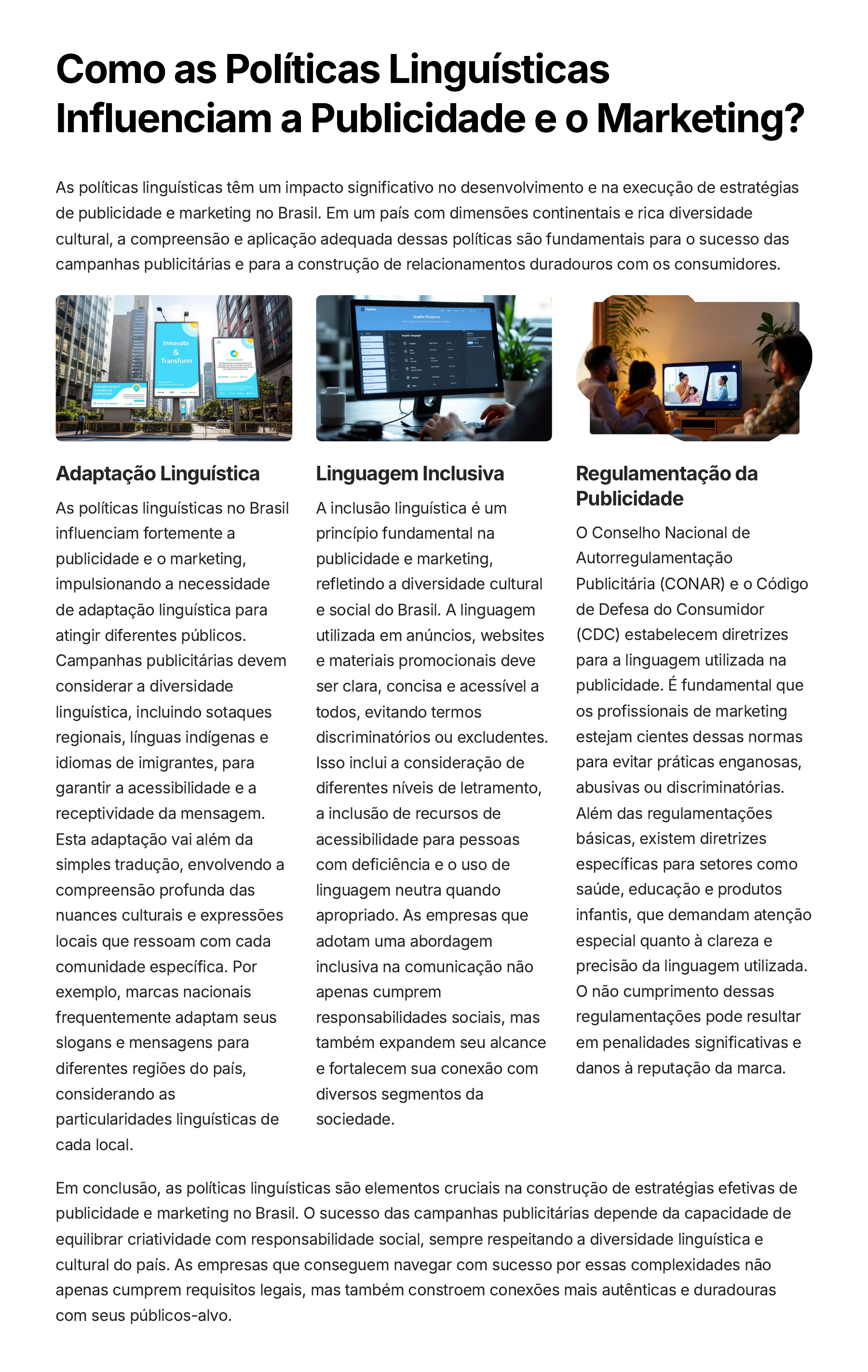 Como as Políticas Linguísticas Influenciam a Publicidade e o Marketing? As políticas linguísticas têm um impacto significativo no desenvolvimento e na execução de estratégias de publicidade e marketing no Brasil. Em um país com dimensões continentais e rica diversidade cultural, a compreensão e aplicação adequada dessas políticas são fundamentais para o sucesso das campanhas publicitárias e para a construção de relacionamentos duradouros com os consumidores. Adaptação Linguística As políticas linguísticas no Brasil influenciam fortemente a publicidade e o marketing, impulsionando a necessidade de adaptação linguística para atingir diferentes públicos. Campanhas publicitárias devem considerar a diversidade linguística, incluindo sotaques regionais, línguas indígenas e idiomas de imigrantes, para garantir a acessibilidade e a receptividade da mensagem. Esta adaptação vai além da simples tradução, envolvendo a compreensão profunda das nuances culturais e expressões locais que ressoam com cada comunidade específica. Por exemplo, marcas nacionais frequentemente adaptam seus slogans e mensagens para diferentes regiões do país, considerando as particularidades linguísticas de cada local. Linguagem Inclusiva A inclusão linguística é um princípio fundamental na publicidade e marketing, refletindo a diversidade cultural e social do Brasil. A linguagem utilizada em anúncios, websites e materiais promocionais deve ser clara, concisa e acessível a todos, evitando termos discriminatórios ou excludentes. Isso inclui a consideração de diferentes níveis de letramento, a inclusão de recursos de acessibilidade para pessoas com deficiência e o uso de linguagem neutra quando apropriado. As empresas que adotam uma abordagem inclusiva na comunicação não apenas cumprem responsabilidades sociais, mas também expandem seu alcance e fortalecem sua conexão com diversos segmentos da sociedade. Regulamentação da Publicidade O Conselho Nacional de Autorregulamentação Publicitária (CONAR) e o Código de Defesa do Consumidor (CDC) estabelecem diretrizes para a linguagem utilizada na publicidade. É fundamental que os profissionais de marketing estejam cientes dessas normas para evitar práticas enganosas, abusivas ou discriminatórias. Além das regulamentações básicas, existem diretrizes específicas para setores como saúde, educação e produtos infantis, que demandam atenção especial quanto à clareza e precisão da linguagem utilizada. O não cumprimento dessas regulamentações pode resultar em penalidades significativas e danos à reputação da marca. Em conclusão, as políticas linguísticas são elementos cruciais na construção de estratégias efetivas de publicidade e marketing no Brasil. O sucesso das campanhas publicitárias depende da capacidade de equilibrar criatividade com responsabilidade social, sempre respeitando a diversidade linguística e cultural do país. As empresas que conseguem navegar com sucesso por essas complexidades não apenas cumprem requisitos legais, mas também constroem conexões mais autênticas e duradouras com seus públicos-alvo.