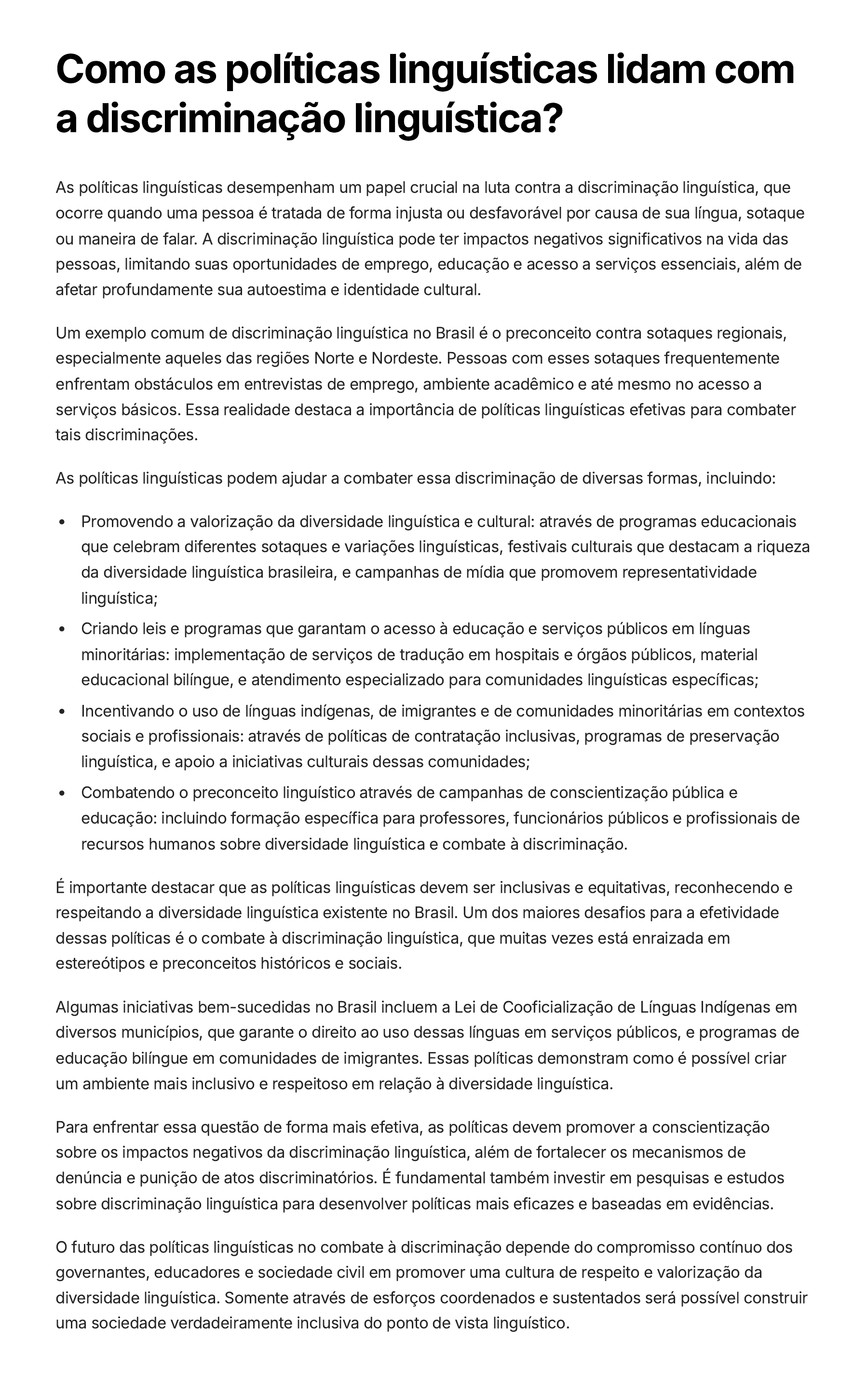 Como as políticas linguísticas lidam com a discriminação linguística? As políticas linguísticas desempenham um papel crucial na luta contra a discriminação linguística, que ocorre quando uma pessoa é tratada de forma injusta ou desfavorável por causa de sua língua, sotaque ou maneira de falar. A discriminação linguística pode ter impactos negativos significativos na vida das pessoas, limitando suas oportunidades de emprego, educação e acesso a serviços essenciais, além de afetar profundamente sua autoestima e identidade cultural. Um exemplo comum de discriminação linguística no Brasil é o preconceito contra sotaques regionais, especialmente aqueles das regiões Norte e Nordeste. Pessoas com esses sotaques frequentemente enfrentam obstáculos em entrevistas de emprego, ambiente acadêmico e até mesmo no acesso a serviços básicos. Essa realidade destaca a importância de políticas linguísticas efetivas para combater tais discriminações. As políticas linguísticas podem ajudar a combater essa discriminação de diversas formas, incluindo: Promovendo a valorização da diversidade linguística e cultural: através de programas educacionais que celebram diferentes sotaques e variações linguísticas, festivais culturais que destacam a riqueza da diversidade linguística brasileira, e campanhas de mídia que promovem representatividade linguística; Criando leis e programas que garantam o acesso à educação e serviços públicos em línguas minoritárias: implementação de serviços de tradução em hospitais e órgãos públicos, material educacional bilíngue, e atendimento especializado para comunidades linguísticas específicas; Incentivando o uso de línguas indígenas, de imigrantes e de comunidades minoritárias em contextos sociais e profissionais: através de políticas de contratação inclusivas, programas de preservação linguística, e apoio a iniciativas culturais dessas comunidades; Combatendo o preconceito linguístico através de campanhas de conscientização pública e educação: incluindo formação específica para professores, funcionários públicos e profissionais de recursos humanos sobre diversidade linguística e combate à discriminação. É importante destacar que as políticas linguísticas devem ser inclusivas e equitativas, reconhecendo e respeitando a diversidade linguística existente no Brasil. Um dos maiores desafios para a efetividade dessas políticas é o combate à discriminação linguística, que muitas vezes está enraizada em estereótipos e preconceitos históricos e sociais. Algumas iniciativas bem-sucedidas no Brasil incluem a Lei de Cooficialização de Línguas Indígenas em diversos municípios, que garante o direito ao uso dessas línguas em serviços públicos, e programas de educação bilíngue em comunidades de imigrantes. Essas políticas demonstram como é possível criar um ambiente mais inclusivo e respeitoso em relação à diversidade linguística. Para enfrentar essa questão de forma mais efetiva, as políticas devem promover a conscientização sobre os impactos negativos da discriminação linguística, além de fortalecer os mecanismos de denúncia e punição de atos discriminatórios. É fundamental também investir em pesquisas e estudos sobre discriminação linguística para desenvolver políticas mais eficazes e baseadas em evidências. O futuro das políticas linguísticas no combate à discriminação depende do compromisso contínuo dos governantes, educadores e sociedade civil em promover uma cultura de respeito e valorização da diversidade linguística. Somente através de esforços coordenados e sustentados será possível construir uma sociedade verdadeiramente inclusiva do ponto de vista linguístico.