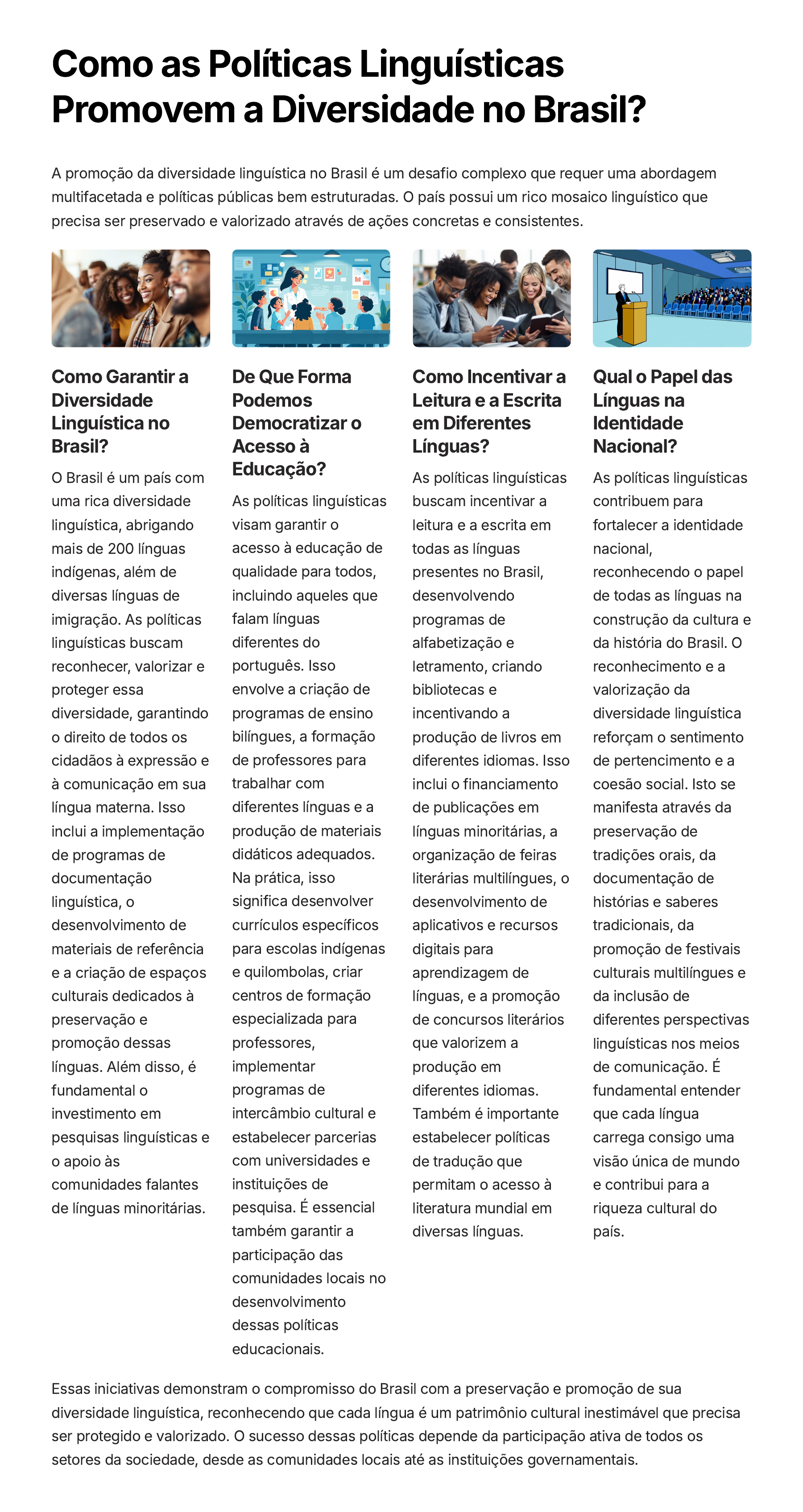 Como as Políticas Linguísticas Promovem a Diversidade no Brasil? A promoção da diversidade linguística no Brasil é um desafio complexo que requer uma abordagem multifacetada e políticas públicas bem estruturadas. O país possui um rico mosaico linguístico que precisa ser preservado e valorizado através de ações concretas e consistentes. Como Garantir a Diversidade Linguística no Brasil? O Brasil é um país com uma rica diversidade linguística, abrigando mais de 200 línguas indígenas, além de diversas línguas de imigração. As políticas linguísticas buscam reconhecer, valorizar e proteger essa diversidade, garantindo o direito de todos os cidadãos à expressão e à comunicação em sua língua materna. Isso inclui a implementação de programas de documentação linguística, o desenvolvimento de materiais de referência e a criação de espaços culturais dedicados à preservação e promoção dessas línguas. Além disso, é fundamental o investimento em pesquisas linguísticas e o apoio às comunidades falantes de línguas minoritárias. De Que Forma Podemos Democratizar o Acesso à Educação? As políticas linguísticas visam garantir o acesso à educação de qualidade para todos, incluindo aqueles que falam línguas diferentes do português. Isso envolve a criação de programas de ensino bilíngues, a formação de professores para trabalhar com diferentes línguas e a produção de materiais didáticos adequados. Na prática, isso significa desenvolver currículos específicos para escolas indígenas e quilombolas, criar centros de formação especializada para professores, implementar programas de intercâmbio cultural e estabelecer parcerias com universidades e instituições de pesquisa. É essencial também garantir a participação das comunidades locais no desenvolvimento dessas políticas educacionais. Como Incentivar a Leitura e a Escrita em Diferentes Línguas? As políticas linguísticas buscam incentivar a leitura e a escrita em todas as línguas presentes no Brasil, desenvolvendo programas de alfabetização e letramento, criando bibliotecas e incentivando a produção de livros em diferentes idiomas. Isso inclui o financiamento de publicações em línguas minoritárias, a organização de feiras literárias multilíngues, o desenvolvimento de aplicativos e recursos digitais para aprendizagem de línguas, e a promoção de concursos literários que valorizem a produção em diferentes idiomas. Também é importante estabelecer políticas de tradução que permitam o acesso à literatura mundial em diversas línguas. Qual o Papel das Línguas na Identidade Nacional? As políticas linguísticas contribuem para fortalecer a identidade nacional, reconhecendo o papel de todas as línguas na construção da cultura e da história do Brasil. O reconhecimento e a valorização da diversidade linguística reforçam o sentimento de pertencimento e a coesão social. Isto se manifesta através da preservação de tradições orais, da documentação de histórias e saberes tradicionais, da promoção de festivais culturais multilíngues e da inclusão de diferentes perspectivas linguísticas nos meios de comunicação. É fundamental entender que cada língua carrega consigo uma visão única de mundo e contribui para a riqueza cultural do país. Essas iniciativas demonstram o compromisso do Brasil com a preservação e promoção de sua diversidade linguística, reconhecendo que cada língua é um patrimônio cultural inestimável que precisa ser protegido e valorizado. O sucesso dessas políticas depende da participação ativa de todos os setores da sociedade, desde as comunidades locais até as instituições governamentais.