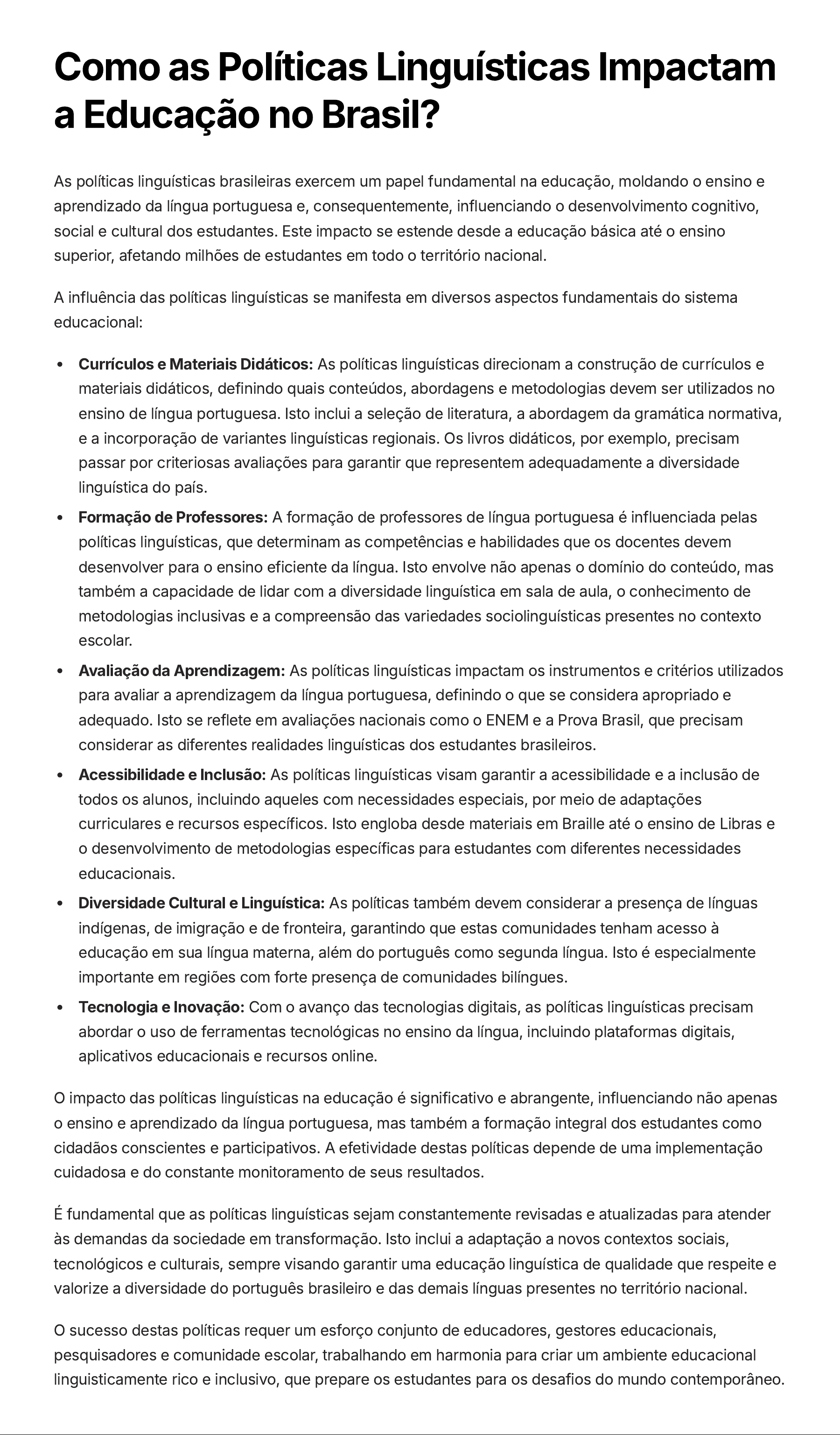 Como as Políticas Linguísticas Impactam a Educação no Brasil? As políticas linguísticas brasileiras exercem um papel fundamental na educação, moldando o ensino e aprendizado da língua portuguesa e, consequentemente, influenciando o desenvolvimento cognitivo, social e cultural dos estudantes. Este impacto se estende desde a educação básica até o ensino superior, afetando milhões de estudantes em todo o território nacional. A influência das políticas linguísticas se manifesta em diversos aspectos fundamentais do sistema educacional: Currículos e Materiais Didáticos: As políticas linguísticas direcionam a construção de currículos e materiais didáticos, definindo quais conteúdos, abordagens e metodologias devem ser utilizados no ensino de língua portuguesa. Isto inclui a seleção de literatura, a abordagem da gramática normativa, e a incorporação de variantes linguísticas regionais. Os livros didáticos, por exemplo, precisam passar por criteriosas avaliações para garantir que representem adequadamente a diversidade linguística do país. Formação de Professores: A formação de professores de língua portuguesa é influenciada pelas políticas linguísticas, que determinam as competências e habilidades que os docentes devem desenvolver para o ensino eficiente da língua. Isto envolve não apenas o domínio do conteúdo, mas também a capacidade de lidar com a diversidade linguística em sala de aula, o conhecimento de metodologias inclusivas e a compreensão das variedades sociolinguísticas presentes no contexto escolar. Avaliação da Aprendizagem: As políticas linguísticas impactam os instrumentos e critérios utilizados para avaliar a aprendizagem da língua portuguesa, definindo o que se considera apropriado e adequado. Isto se reflete em avaliações nacionais como o ENEM e a Prova Brasil, que precisam considerar as diferentes realidades linguísticas dos estudantes brasileiros. Acessibilidade e Inclusão: As políticas linguísticas visam garantir a acessibilidade e a inclusão de todos os alunos, incluindo aqueles com necessidades especiais, por meio de adaptações curriculares e recursos específicos. Isto engloba desde materiais em Braille até o ensino de Libras e o desenvolvimento de metodologias específicas para estudantes com diferentes necessidades educacionais. Diversidade Cultural e Linguística: As políticas também devem considerar a presença de línguas indígenas, de imigração e de fronteira, garantindo que estas comunidades tenham acesso à educação em sua língua materna, além do português como segunda língua. Isto é especialmente importante em regiões com forte presença de comunidades bilíngues. Tecnologia e Inovação: Com o avanço das tecnologias digitais, as políticas linguísticas precisam abordar o uso de ferramentas tecnológicas no ensino da língua, incluindo plataformas digitais, aplicativos educacionais e recursos online. O impacto das políticas linguísticas na educação é significativo e abrangente, influenciando não apenas o ensino e aprendizado da língua portuguesa, mas também a formação integral dos estudantes como cidadãos conscientes e participativos. A efetividade destas políticas depende de uma implementação cuidadosa e do constante monitoramento de seus resultados. É fundamental que as políticas linguísticas sejam constantemente revisadas e atualizadas para atender às demandas da sociedade em transformação. Isto inclui a adaptação a novos contextos sociais, tecnológicos e culturais, sempre visando garantir uma educação linguística de qualidade que respeite e valorize a diversidade do português brasileiro e das demais línguas presentes no território nacional. O sucesso destas políticas requer um esforço conjunto de educadores, gestores educacionais, pesquisadores e comunidade escolar, trabalhando em harmonia para criar um ambiente educacional linguisticamente rico e inclusivo, que prepare os estudantes para os desafios do mundo contemporâneo.
