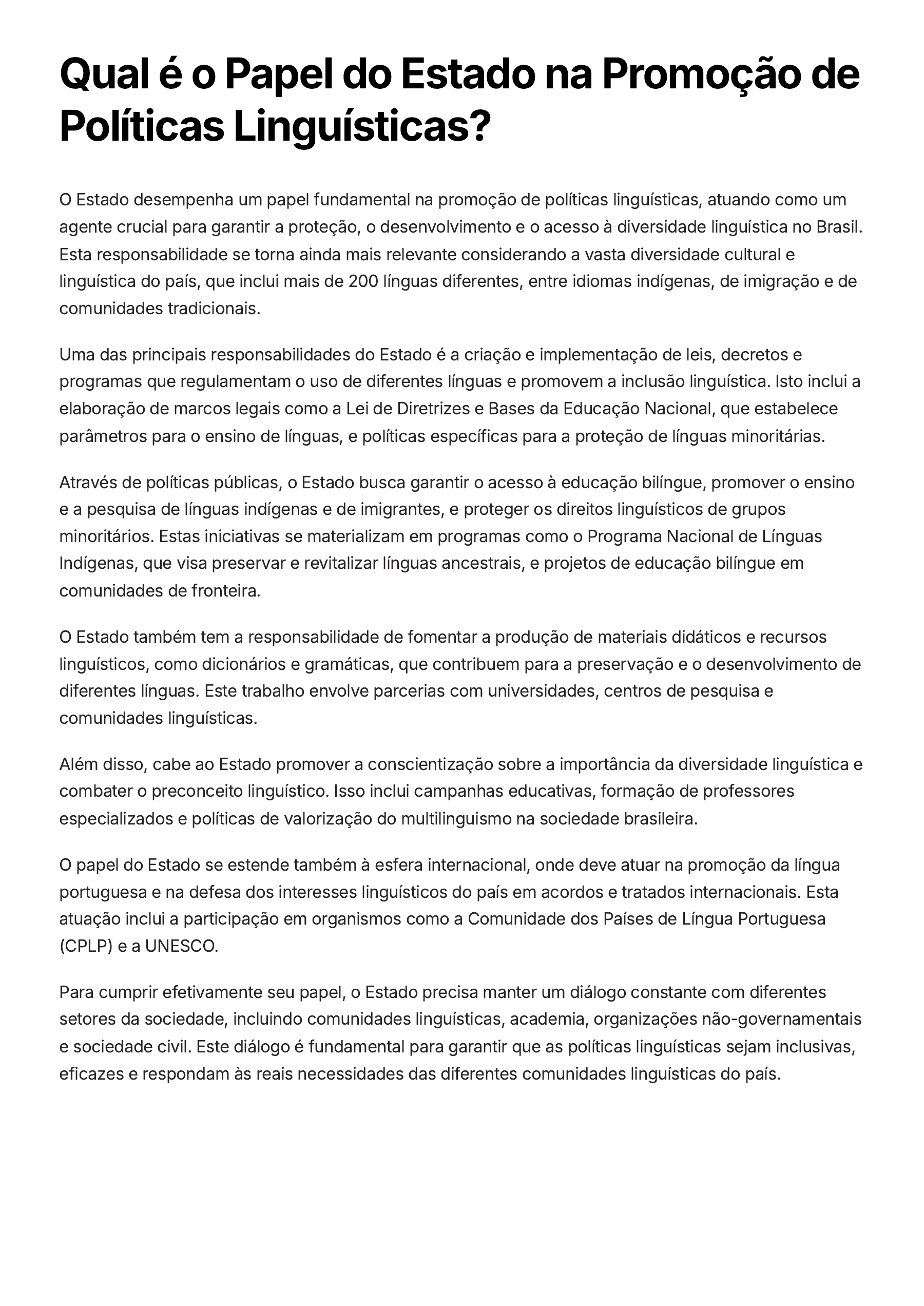 Qual é o Papel do Estado na Promoção de Políticas Linguísticas? O Estado desempenha um papel fundamental na promoção de políticas linguísticas, atuando como um agente crucial para garantir a proteção, o desenvolvimento e o acesso à diversidade linguística no Brasil. Esta responsabilidade se torna ainda mais relevante considerando a vasta diversidade cultural e linguística do país, que inclui mais de 200 línguas diferentes, entre idiomas indígenas, de imigração e de comunidades tradicionais. Uma das principais responsabilidades do Estado é a criação e implementação de leis, decretos e programas que regulamentam o uso de diferentes línguas e promovem a inclusão linguística. Isto inclui a elaboração de marcos legais como a Lei de Diretrizes e Bases da Educação Nacional, que estabelece parâmetros para o ensino de línguas, e políticas específicas para a proteção de línguas minoritárias. Através de políticas públicas, o Estado busca garantir o acesso à educação bilíngue, promover o ensino e a pesquisa de línguas indígenas e de imigrantes, e proteger os direitos linguísticos de grupos minoritários. Estas iniciativas se materializam em programas como o Programa Nacional de Línguas Indígenas, que visa preservar e revitalizar línguas ancestrais, e projetos de educação bilíngue em comunidades de fronteira. O Estado também tem a responsabilidade de fomentar a produção de materiais didáticos e recursos linguísticos, como dicionários e gramáticas, que contribuem para a preservação e o desenvolvimento de diferentes línguas. Este trabalho envolve parcerias com universidades, centros de pesquisa e comunidades linguísticas. Além disso, cabe ao Estado promover a conscientização sobre a importância da diversidade linguística e combater o preconceito linguístico. Isso inclui campanhas educativas, formação de professores especializados e políticas de valorização do multilinguismo na sociedade brasileira. O papel do Estado se estende também à esfera internacional, onde deve atuar na promoção da língua portuguesa e na defesa dos interesses linguísticos do país em acordos e tratados internacionais. Esta atuação inclui a participação em organismos como a Comunidade dos Países de Língua Portuguesa (CPLP) e a UNESCO. Para cumprir efetivamente seu papel, o Estado precisa manter um diálogo constante com diferentes setores da sociedade, incluindo comunidades linguísticas, academia, organizações não-governamentais e sociedade civil. Este diálogo é fundamental para garantir que as políticas linguísticas sejam inclusivas, eficazes e respondam às reais necessidades das diferentes comunidades linguísticas do país.
