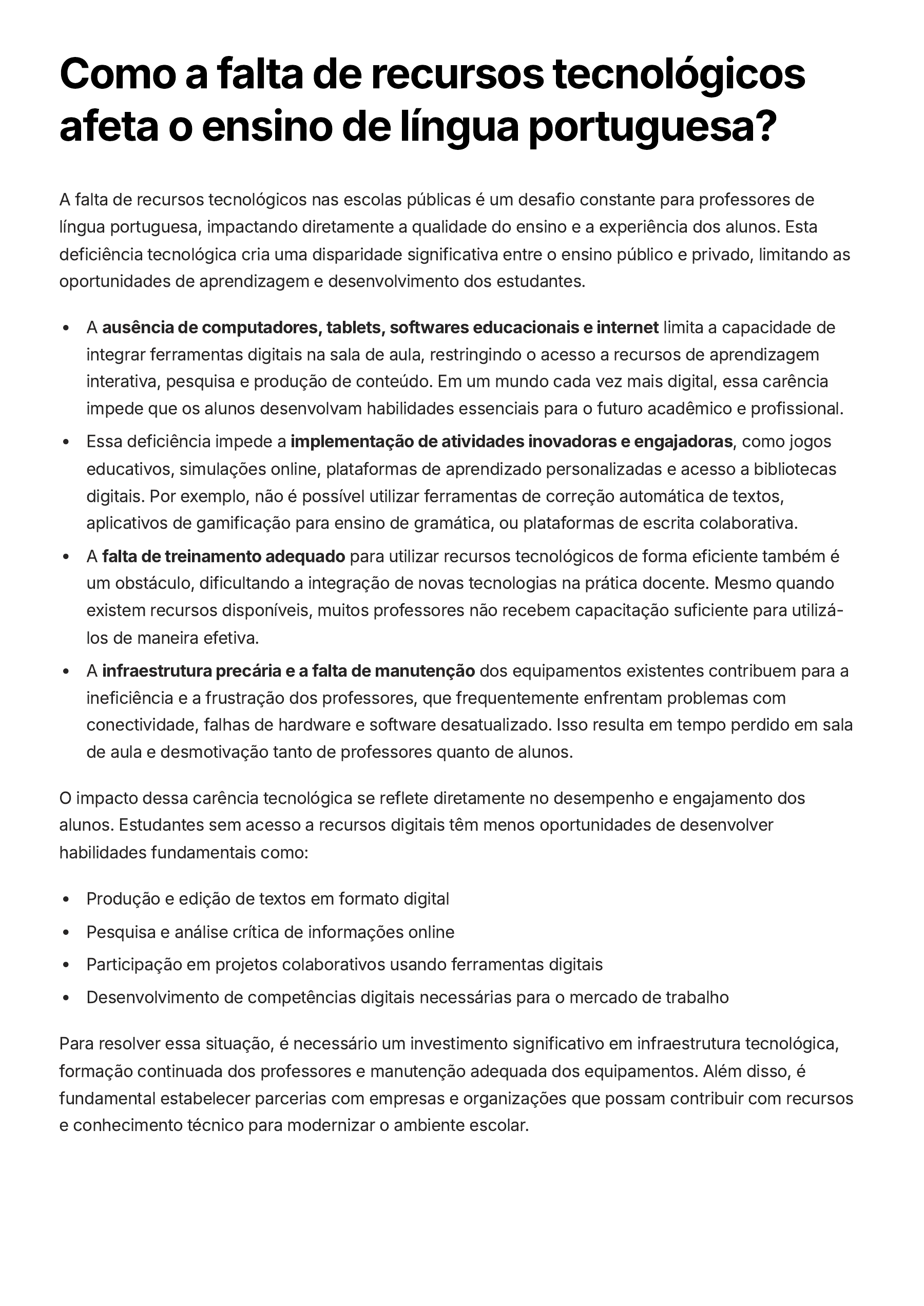 Como a falta de recursos tecnológicos afeta o ensino de língua portuguesa? A falta de recursos tecnológicos nas escolas públicas é um desafio constante para professores de língua portuguesa, impactando diretamente a qualidade do ensino e a experiência dos alunos. Esta deficiência tecnológica cria uma disparidade significativa entre o ensino público e privado, limitando as oportunidades de aprendizagem e desenvolvimento dos estudantes. A ausência de computadores, tablets, softwares educacionais e internet limita a capacidade de integrar ferramentas digitais na sala de aula, restringindo o acesso a recursos de aprendizagem interativa, pesquisa e produção de conteúdo. Em um mundo cada vez mais digital, essa carência impede que os alunos desenvolvam habilidades essenciais para o futuro acadêmico e profissional. Essa deficiência impede a implementação de atividades inovadoras e engajadoras, como jogos educativos, simulações online, plataformas de aprendizado personalizadas e acesso a bibliotecas digitais. Por exemplo, não é possível utilizar ferramentas de correção automática de textos, aplicativos de gamificação para ensino de gramática, ou plataformas de escrita colaborativa. A falta de treinamento adequado para utilizar recursos tecnológicos de forma eficiente também é um obstáculo, dificultando a integração de novas tecnologias na prática docente. Mesmo quando existem recursos disponíveis, muitos professores não recebem capacitação suficiente para utilizá- los de maneira efetiva. A infraestrutura precária e a falta de manutenção dos equipamentos existentes contribuem para a ineficiência e a frustração dos professores, que frequentemente enfrentam problemas com conectividade, falhas de hardware e software desatualizado. Isso resulta em tempo perdido em sala de aula e desmotivação tanto de professores quanto de alunos. O impacto dessa carência tecnológica se reflete diretamente no desempenho e engajamento dos alunos. Estudantes sem acesso a recursos digitais têm menos oportunidades de desenvolver habilidades fundamentais como: Produção e edição de textos em formato digital Pesquisa e análise crítica de informações online Participação em projetos colaborativos usando ferramentas digitais Desenvolvimento de competências digitais necessárias para o mercado de trabalho Para resolver essa situação, é necessário um investimento significativo em infraestrutura tecnológica, formação continuada dos professores e manutenção adequada dos equipamentos. Além disso, é fundamental estabelecer parcerias com empresas e organizações que possam contribuir com recursos e conhecimento técnico para modernizar o ambiente escolar.