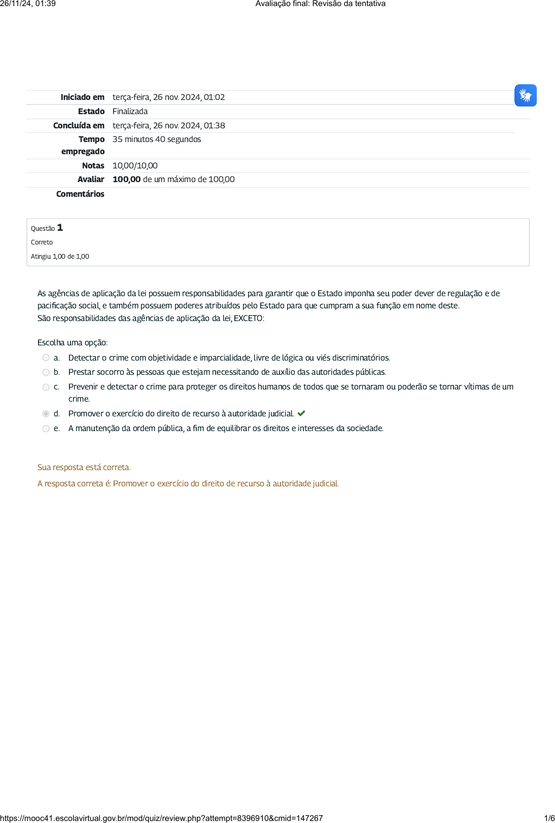Iniciado em terça-feira, 26 nov. 2024, 01:02 Estado Finalizada Concluída em terça-feira, 26 nov. 2024, 01:38 Tempo empregado 35 minutos 40 segundos Notas 10,00/10,00 Avaliar 100,00 de um máximo de 100,00 Comentários Questão 1 Correto Atingiu 1,00 de 1,00 As agências de aplicação da lei possuem responsabilidades para garantir que o Estado imponha seu poder dever de regulação e de paci�cação social, e também possuem poderes atribuídos pelo Estado para que cumpram a sua função em nome deste. São responsabilidades das agências de aplicação da lei, EXCETO: Escolha uma opção: a. Detectar o crime com objetividade e imparcialidade, livre de lógica ou viés discriminatórios. b. Prestar socorro às pessoas que estejam necessitando de auxílio das autoridades públicas. c. Prevenir e detectar o crime para proteger os direitos humanos de todos que se tornaram ou poderão se tornar vítimas de um crime. d. Promover o exercício do direito de recurso à autoridade judicial. e. A manutenção da ordem pública, a �m de equilibrar os direitos e interesses da sociedade. Sua resposta está correta. A resposta correta é: Promover o exercício do direito de recurso à autoridade judicial. 26/11/24, 01:39 Avaliação final: Revisão da tentativa https://mooc41.escolavirtual.gov.br/mod/quiz/review.php?attempt=8396910&cmid=147267 1/6 Questão 2 Correto Atingiu 1,00 de 1,00 Questão 3 Correto Atingiu 1,00 de 1,00 O mito de que a violência juvenil é uma epidemia incontrolável é frequentemente compartilhado. No entanto, como mencionado por Jody Miller, professora de Criminologia, a violência juvenil não deve ser abordada de maneira sensacionalista. Miller (2001) enfatiza a importância de considerar o contexto social e estrutural ao analisar a violência juvenil. Escolha uma opção: a. A violência juvenil pode ser in�uenciada pelo ambiente, mas a falta de suporte social e econômico também desempenha um papel. b. A violência juvenil pode ser mais visível em algumas áreas, mas as in�uências socioeconômicas também devem ser consideradas. c. A violência juvenil pode afetar a coesão social, mas também pode ser mitigada por meio de intervenções educacionais e sociais. d. A violência juvenil é uma preocupação legítima, mas rotulá-la como epidemia pode obscurecer as complexidades subjacentes. e. A violência juvenil é resultado de interações complexas entre fatores genéticos e ambientais, e uma abordagem abrangente é necessária. Sua resposta está correta. A resposta correta é: A violência juvenil pode ser mais visível em algumas áreas, mas as in�uências socioeconômicas também devem ser consideradas. Os Princípios Básicos do Uso da Força e de Armas de Fogo pelos Funcionários Responsáveis pela Aplicação da Lei (PBUFAF), adotados pela ONU, padronizam e orientam os Estados signatários sobre o uso da força quando da aplicação da lei por meio de seus agentes. A Portaria Interministerial 4.226/2010 incorporou estes Princípios em sua normativa. Marque a alternativa correta com relação ao uso de arma de fogo pelos funcionários responsáveis pela aplicação da lei: Escolha uma opção: a. O funcionário responsável pela aplicação da lei deverá utilizar arma de fogo sempre que entender necessário, a �m de proteger precipuamente o patrimônio e os serviços públicos. b. O funcionário responsável pela aplicação da lei somente deverá recorrer ao uso letal da arma de fogo, em qualquer caso, quando tal uso for indispensável para proteger vidas. c. O disparo de advertência é aceito pela doutrina e pela jurisprudência como forma de legítima do uso da força pelo do agente aplicador da lei. d. Os protocolos operacionais devem prever o ato de apontar arma de fogo contra pessoas em procedimentos de abordagem como regra procedimental, a �m de garantir a segurança da Guarnição. e. O agente de segurança pública que estiver portando arma de fogo será dispensado do uso de instrumentos de menor potencial ofensivo. Sua resposta está correta. A resposta correta é: O funcionário responsável pela aplicação da lei somente deverá recorrer ao uso letal da arma de fogo, em qualquer caso, quando tal uso for indispensável para proteger vidas. 26/11/24, 01:39 Avaliação final: Revisão da tentativa https://mooc41.escolavirtual.gov.br/mod/quiz/review.php?attempt=8396910&cmid=147267 2/6 Questão 4 Correto Atingiu 1,00 de 1,00 Questão 5 Correto Atingiu 1,00 de 1,00 O poder de polícia na segurança pública não provém das instituições policiais que a exercem e sim da função constitucional do Estado e da União, a quem o Estado Democrático de Direito incumbiu de exercê- la. (CAMPOS, 2013) Considerando a prerrogativa do Estado em exercer o poder de polícia através de seus agentes, assinale V ou F nas a�rmações a seguir: ( ) Os órgãos com função policial utilizam o poder de polícia como instrumento para fazer cumprir a imposição do interesse coletivo, na garantia da tranquilidade pública. ( ) O poder de polícia, prerrogativa da Administração Pública delegada aos seus agentes, é atividade de regula e limita os direitos individuais, desde que haja concordância formal e voluntária do cidadão em abrir mão dos seus direitos individuais em prol da coletividade. ( ) As instituições policiais são a origem do poder de polícia administrativo, sendo por isso primordiais no controle social de um Estado Democrático de Direito. ( ) O poder dos órgãos com função policial deve ser de�nido de forma distinta ao poder de polícia, uma vez que o exercício da atividade policial é inviável sem que o Estado lhe revista do poder de polícia, que por sua vez provém da função constitucional do próprio Estado. O resultado é: Escolha uma opção: a. V-F-F-V. b. V-V-F-F. c. F-F-V-V. d. F-V-F-V. e. V-F-V-F. Sua resposta está correta. A resposta correta é: V-F-F-V. Você estudou que é dever de todo funcionário resp