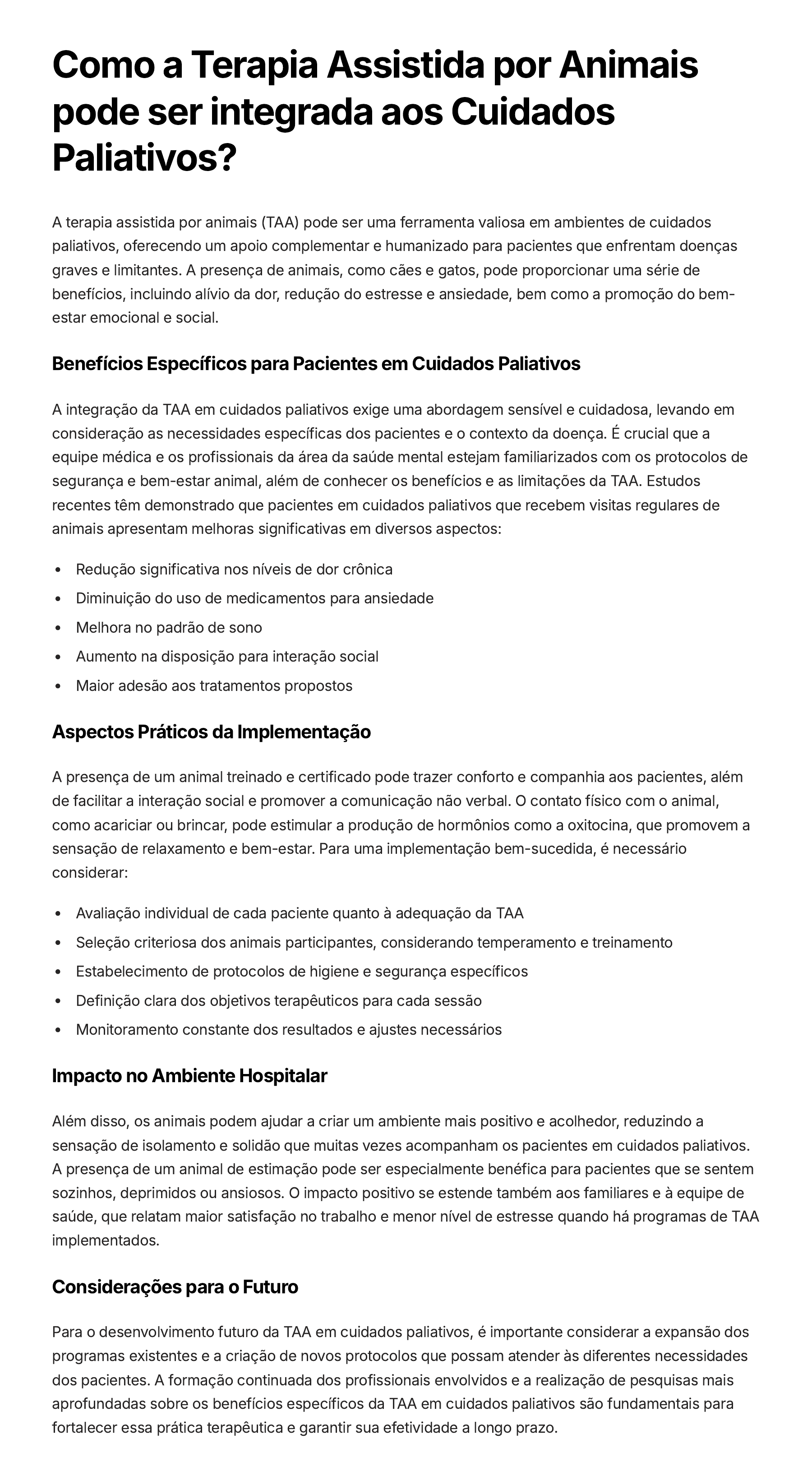 Como a Terapia Assistida por Animais pode ser integrada aos Cuidados Paliativos? A terapia assistida por animais (TAA) pode ser uma ferramenta valiosa em ambientes de cuidados paliativos, oferecendo um apoio complementar e humanizado para pacientes que enfrentam doenças graves e limitantes. A presença de animais, como cães e gatos, pode proporcionar uma série de benefícios, incluindo alívio da dor, redução do estresse e ansiedade, bem como a promoção do bem- estar emocional e social. Benefícios Específicos para Pacientes em Cuidados Paliativos A integração da TAA em cuidados paliativos exige uma abordagem sensível e cuidadosa, levando em consideração as necessidades específicas dos pacientes e o contexto da doença. É crucial que a equipe médica e os profissionais da área da saúde mental estejam familiarizados com os protocolos de segurança e bem-estar animal, além de conhecer os benefícios e as limitações da TAA. Estudos recentes têm demonstrado que pacientes em cuidados paliativos que recebem visitas regulares de animais apresentam melhoras significativas em diversos aspectos: Redução significativa nos níveis de dor crônica Diminuição do uso de medicamentos para ansiedade Melhora no padrão de sono Aumento na disposição para interação social Maior adesão aos tratamentos propostos Aspectos Práticos da Implementação A presença de um animal treinado e certificado pode trazer conforto e companhia aos pacientes, além de facilitar a interação social e promover a comunicação não verbal. O contato físico com o animal, como acariciar ou brincar, pode estimular a produção de hormônios como a oxitocina, que promovem a sensação de relaxamento e bem-estar. Para uma implementação bem-sucedida, é necessário considerar: Avaliação individual de cada paciente quanto à adequação da TAA Seleção criteriosa dos animais participantes, considerando temperamento e treinamento Estabelecimento de protocolos de higiene e segurança específicos Definição clara dos objetivos terapêuticos para cada sessão Monitoramento constante dos resultados e ajustes necessários Impacto no Ambiente Hospitalar Além disso, os animais podem ajudar a criar um ambiente mais positivo e acolhedor, reduzindo a sensação de isolamento e solidão que muitas vezes acompanham os pacientes em cuidados paliativos. A presença de um animal de estimação pode ser especialmente benéfica para pacientes que se sentem sozinhos, deprimidos ou ansiosos. O impacto positivo se estende também aos familiares e à equipe de saúde, que relatam maior satisfação no trabalho e menor nível de estresse quando há programas de TAA implementados. Considerações para o Futuro Para o desenvolvimento futuro da TAA em cuidados paliativos, é importante considerar a expansão dos programas existentes e a criação de novos protocolos que possam atender às diferentes necessidades dos pacientes. A formação continuada dos profissionais envolvidos e a realização de pesquisas mais aprofundadas sobre os benefícios específicos da TAA em cuidados paliativos são fundamentais para fortalecer essa prática terapêutica e garantir sua efetividade a longo prazo.