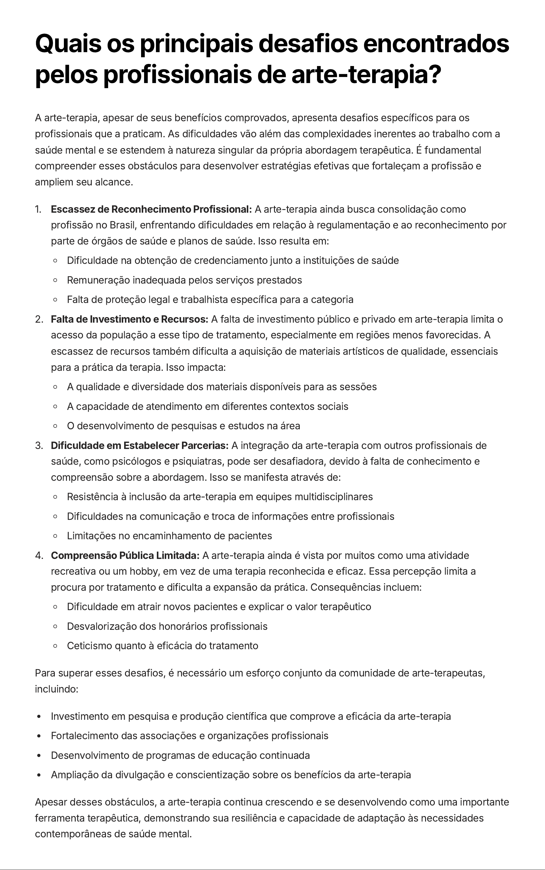 Quais os principais desafios encontrados pelos profissionais de arte-terapia? A arte-terapia, apesar de seus benefícios comprovados, apresenta desafios específicos para os profissionais que a praticam. As dificuldades vão além das complexidades inerentes ao trabalho com a saúde mental e se estendem à natureza singular da própria abordagem terapêutica. É fundamental compreender esses obstáculos para desenvolver estratégias efetivas que fortaleçam a profissão e ampliem seu alcance. Escassez de Reconhecimento Profissional: A arte-terapia ainda busca consolidação como profissão no Brasil, enfrentando dificuldades em relação à regulamentação e ao reconhecimento por parte de órgãos de saúde e planos de saúde. Isso resulta em: 1. Dificuldade na obtenção de credenciamento junto a instituições de saúde Remuneração inadequada pelos serviços prestados Falta de proteção legal e trabalhista específica para a categoria Falta de Investimento e Recursos: A falta de investimento público e privado em arte-terapia limita o acesso da população a esse tipo de tratamento, especialmente em regiões menos favorecidas. A escassez de recursos também dificulta a aquisição de materiais artísticos de qualidade, essenciais para a prática da terapia. Isso impacta: 2. A qualidade e diversidade dos materiais disponíveis para as sessões A capacidade de atendimento em diferentes contextos sociais O desenvolvimento de pesquisas e estudos na área Dificuldade em Estabelecer Parcerias: A integração da arte-terapia com outros profissionais de saúde, como psicólogos e psiquiatras, pode ser desafiadora, devido à falta de conhecimento e compreensão sobre a abordagem. Isso se manifesta através de: 3. Resistência à inclusão da arte-terapia em equipes multidisciplinares Dificuldades na comunicação e troca de informações entre profissionais Limitações no encaminhamento de pacientes Compreensão Pública Limitada: A arte-terapia ainda é vista por muitos como uma atividade recreativa ou um hobby, em vez de uma terapia reconhecida e eficaz. Essa percepção limita a procura por tratamento e dificulta a expansão da prática. Consequências incluem: 4. Dificuldade em atrair novos pacientes e explicar o valor terapêutico Desvalorização dos honorários profissionais Ceticismo quanto à eficácia do tratamento Para superar esses desafios, é necessário um esforço conjunto da comunidade de arte-terapeutas, incluindo: Investimento em pesquisa e produção científica que comprove a eficácia da arte-terapia Fortalecimento das associações e organizações profissionais Desenvolvimento de programas de educação continuada Ampliação da divulgação e conscientização sobre os benefícios da arte-terapia Apesar desses obstáculos, a arte-terapia continua crescendo e se desenvolvendo como uma importante ferramenta terapêutica, demonstrando sua resiliência e capacidade de adaptação às necessidades contemporâneas de saúde mental.