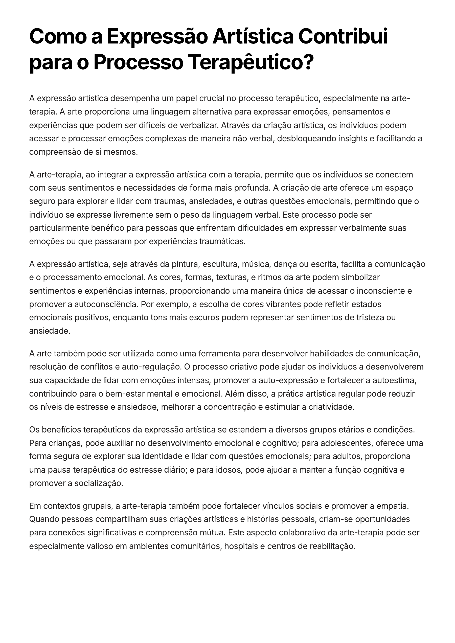 Como a Expressão Artística Contribui para o Processo Terapêutico? A expressão artística desempenha um papel crucial no processo terapêutico, especialmente na arte- terapia. A arte proporciona uma linguagem alternativa para expressar emoções, pensamentos e experiências que podem ser difíceis de verbalizar. Através da criação artística, os indivíduos podem acessar e processar emoções complexas de maneira não verbal, desbloqueando insights e facilitando a compreensão de si mesmos. A arte-terapia, ao integrar a expressão artística com a terapia, permite que os indivíduos se conectem com seus sentimentos e necessidades de forma mais profunda. A criação de arte oferece um espaço seguro para explorar e lidar com traumas, ansiedades, e outras questões emocionais, permitindo que o indivíduo se expresse livremente sem o peso da linguagem verbal. Este processo pode ser particularmente benéfico para pessoas que enfrentam dificuldades em expressar verbalmente suas emoções ou que passaram por experiências traumáticas. A expressão artística, seja através da pintura, escultura, música, dança ou escrita, facilita a comunicação e o processamento emocional. As cores, formas, texturas, e ritmos da arte podem simbolizar sentimentos e experiências internas, proporcionando uma maneira única de acessar o inconsciente e promover a autoconsciência. Por exemplo, a escolha de cores vibrantes pode refletir estados emocionais positivos, enquanto tons mais escuros podem representar sentimentos de tristeza ou ansiedade. A arte também pode ser utilizada como uma ferramenta para desenvolver habilidades de comunicação, resolução de conflitos e auto-regulação. O processo criativo pode ajudar os indivíduos a desenvolverem sua capacidade de lidar com emoções intensas, promover a auto-expressão e fortalecer a autoestima, contribuindo para o bem-estar mental e emocional. Além disso, a prática artística regular pode reduzir os níveis de estresse e ansiedade, melhorar a concentração e estimular a criatividade. Os benefícios terapêuticos da expressão artística se estendem a diversos grupos etários e condições. Para crianças, pode auxiliar no desenvolvimento emocional e cognitivo; para adolescentes, oferece uma forma segura de explorar sua identidade e lidar com questões emocionais; para adultos, proporciona uma pausa terapêutica do estresse diário; e para idosos, pode ajudar a manter a função cognitiva e promover a socialização. Em contextos grupais, a arte-terapia também pode fortalecer vínculos sociais e promover a empatia. Quando pessoas compartilham suas criações artísticas e histórias pessoais, criam-se oportunidades para conexões significativas e compreensão mútua. Este aspecto colaborativo da arte-terapia pode ser especialmente valioso em ambientes comunitários, hospitais e centros de reabilitação.