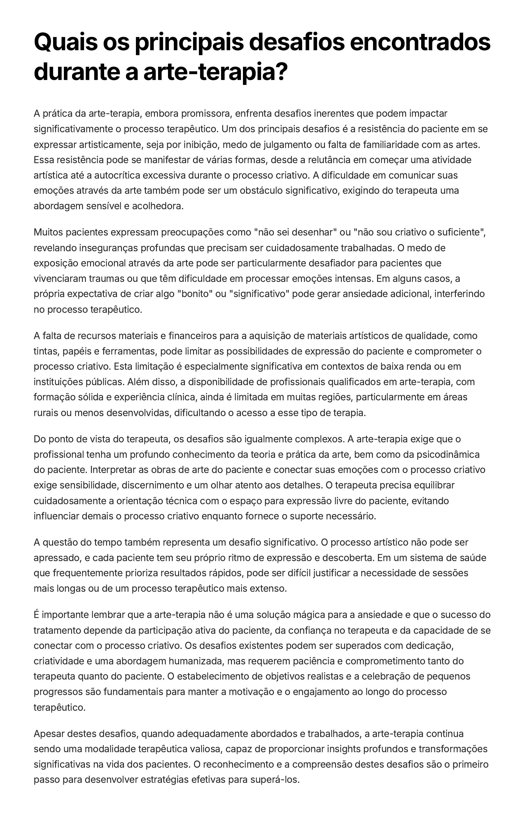 Quais os principais desafios encontrados durante a arte-terapia? A prática da arte-terapia, embora promissora, enfrenta desafios inerentes que podem impactar significativamente o processo terapêutico. Um dos principais desafios é a resistência do paciente em se expressar artisticamente, seja por inibição, medo de julgamento ou falta de familiaridade com as artes. Essa resistência pode se manifestar de várias formas, desde a relutância em começar uma atividade artística até a autocrítica excessiva durante o processo criativo. A dificuldade em comunicar suas emoções através da arte também pode ser um obstáculo significativo, exigindo do terapeuta uma abordagem sensível e acolhedora. Muitos pacientes expressam preocupações como "não sei desenhar" ou "não sou criativo o suficiente", revelando inseguranças profundas que precisam ser cuidadosamente trabalhadas. O medo de exposição emocional através da arte pode ser particularmente desafiador para pacientes que vivenciaram traumas ou que têm dificuldade em processar emoções intensas. Em alguns casos, a própria expectativa de criar algo "bonito" ou "significativo" pode gerar ansiedade adicional, interferindo no processo terapêutico. A falta de recursos materiais e financeiros para a aquisição de materiais artísticos de qualidade, como tintas, papéis e ferramentas, pode limitar as possibilidades de expressão do paciente e comprometer o processo criativo. Esta limitação é especialmente significativa em contextos de baixa renda ou em instituições públicas. Além disso, a disponibilidade de profissionais qualificados em arte-terapia, com formação sólida e experiência clínica, ainda é limitada em muitas regiões, particularmente em áreas rurais ou menos desenvolvidas, dificultando o acesso a esse tipo de terapia. Do ponto de vista do terapeuta, os desafios são igualmente complexos. A arte-terapia exige que o profissional tenha um profundo conhecimento da teoria e prática da arte, bem como da psicodinâmica do paciente. Interpretar as obras de arte do paciente e conectar suas emoções com o processo criativo exige sensibilidade, discernimento e um olhar atento aos detalhes. O terapeuta precisa equilibrar cuidadosamente a orientação técnica com o espaço para expressão livre do paciente, evitando influenciar demais o processo criativo enquanto fornece o suporte necessário. A questão do tempo também representa um desafio significativo. O processo artístico não pode ser apressado, e cada paciente tem seu próprio ritmo de expressão e descoberta. Em um sistema de saúde que frequentemente prioriza resultados rápidos, pode ser difícil justificar a necessidade de sessões mais longas ou de um processo terapêutico mais extenso. É importante lembrar que a arte-terapia não é uma solução mágica para a ansiedade e que o sucesso do tratamento depende da participação ativa do paciente, da confiança no terapeuta e da capacidade de se conectar com o processo criativo. Os desafios existentes podem ser superados com dedicação, criatividade e uma abordagem humanizada, mas requerem paciência e comprometimento tanto do terapeuta quanto do paciente. O estabelecimento de objetivos realistas e a celebração de pequenos progressos são fundamentais para manter a motivação e o engajamento ao longo do processo terapêutico. Apesar destes desafios, quando adequadamente abordados e trabalhados, a arte-terapia continua sendo uma modalidade terapêutica valiosa, capaz de proporcionar insights profundos e transformações significativas na vida dos pacientes. O reconhecimento e a compreensão destes desafios são o primeiro passo para desenvolver estratégias efetivas para superá-los.
