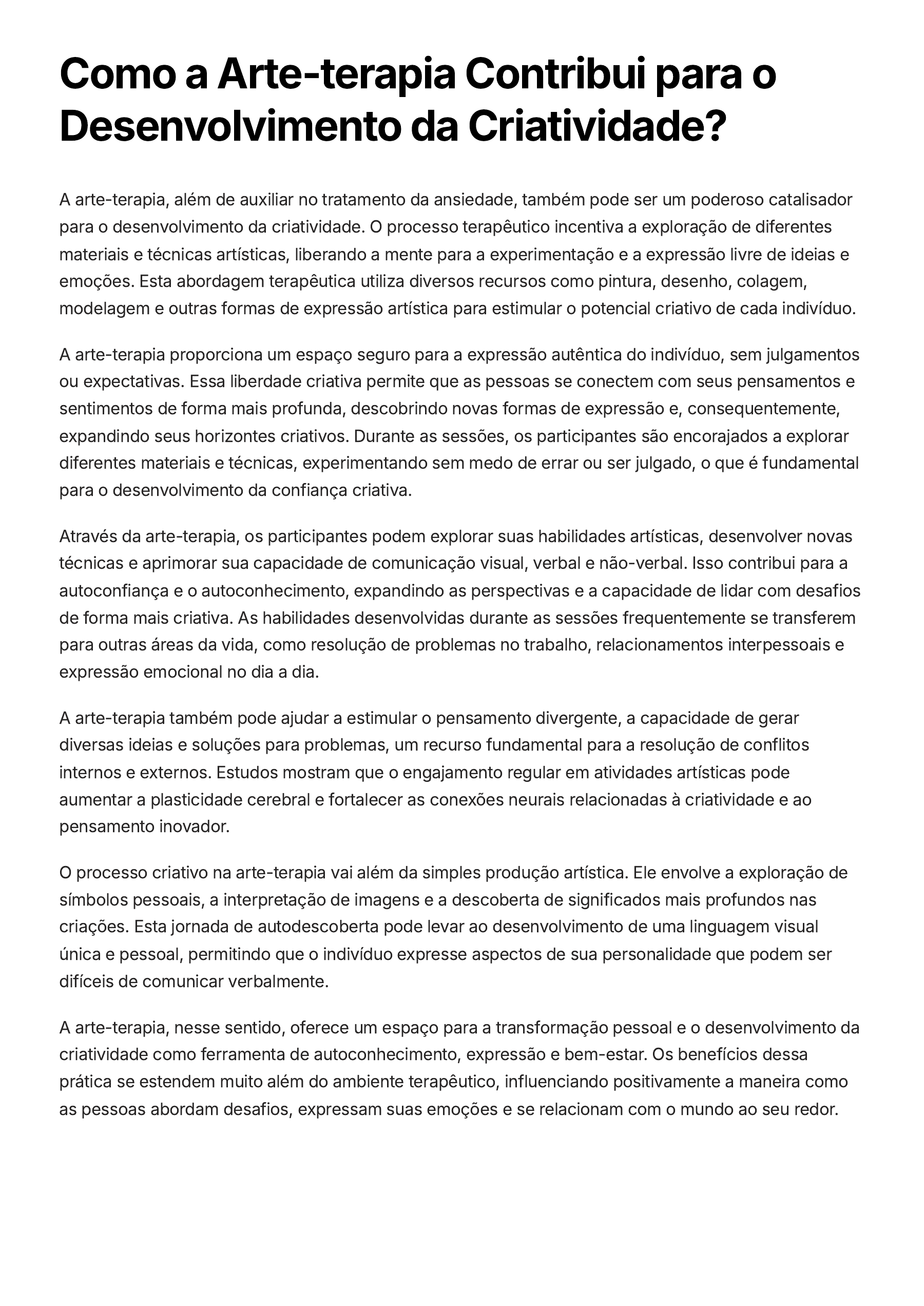 Como a Arte-terapia Contribui para o Desenvolvimento da Criatividade? A arte-terapia, além de auxiliar no tratamento da ansiedade, também pode ser um poderoso catalisador para o desenvolvimento da criatividade. O processo terapêutico incentiva a exploração de diferentes materiais e técnicas artísticas, liberando a mente para a experimentação e a expressão livre de ideias e emoções. Esta abordagem terapêutica utiliza diversos recursos como pintura, desenho, colagem, modelagem e outras formas de expressão artística para estimular o potencial criativo de cada indivíduo. A arte-terapia proporciona um espaço seguro para a expressão autêntica do indivíduo, sem julgamentos ou expectativas. Essa liberdade criativa permite que as pessoas se conectem com seus pensamentos e sentimentos de forma mais profunda, descobrindo novas formas de expressão e, consequentemente, expandindo seus horizontes criativos. Durante as sessões, os participantes são encorajados a explorar diferentes materiais e técnicas, experimentando sem medo de errar ou ser julgado, o que é fundamental para o desenvolvimento da confiança criativa. Através da arte-terapia, os participantes podem explorar suas habilidades artísticas, desenvolver novas técnicas e aprimorar sua capacidade de comunicação visual, verbal e não-verbal. Isso contribui para a autoconfiança e o autoconhecimento, expandindo as perspectivas e a capacidade de lidar com desafios de forma mais criativa. As habilidades desenvolvidas durante as sessões frequentemente se transferem para outras áreas da vida, como resolução de problemas no trabalho, relacionamentos interpessoais e expressão emocional no dia a dia. A arte-terapia também pode ajudar a estimular o pensamento divergente, a capacidade de gerar diversas ideias e soluções para problemas, um recurso fundamental para a resolução de conflitos internos e externos. Estudos mostram que o engajamento regular em atividades artísticas pode aumentar a plasticidade cerebral e fortalecer as conexões neurais relacionadas à criatividade e ao pensamento inovador. O processo criativo na arte-terapia vai além da simples produção artística. Ele envolve a exploração de símbolos pessoais, a interpretação de imagens e a descoberta de significados mais profundos nas criações. Esta jornada de autodescoberta pode levar ao desenvolvimento de uma linguagem visual única e pessoal, permitindo que o indivíduo expresse aspectos de sua personalidade que podem ser difíceis de comunicar verbalmente. A arte-terapia, nesse sentido, oferece um espaço para a transformação pessoal e o desenvolvimento da criatividade como ferramenta de autoconhecimento, expressão e bem-estar. Os benefícios dessa prática se estendem muito além do ambiente terapêutico, influenciando positivamente a maneira como as pessoas abordam desafios, expressam suas emoções e se relacionam com o mundo ao seu redor.