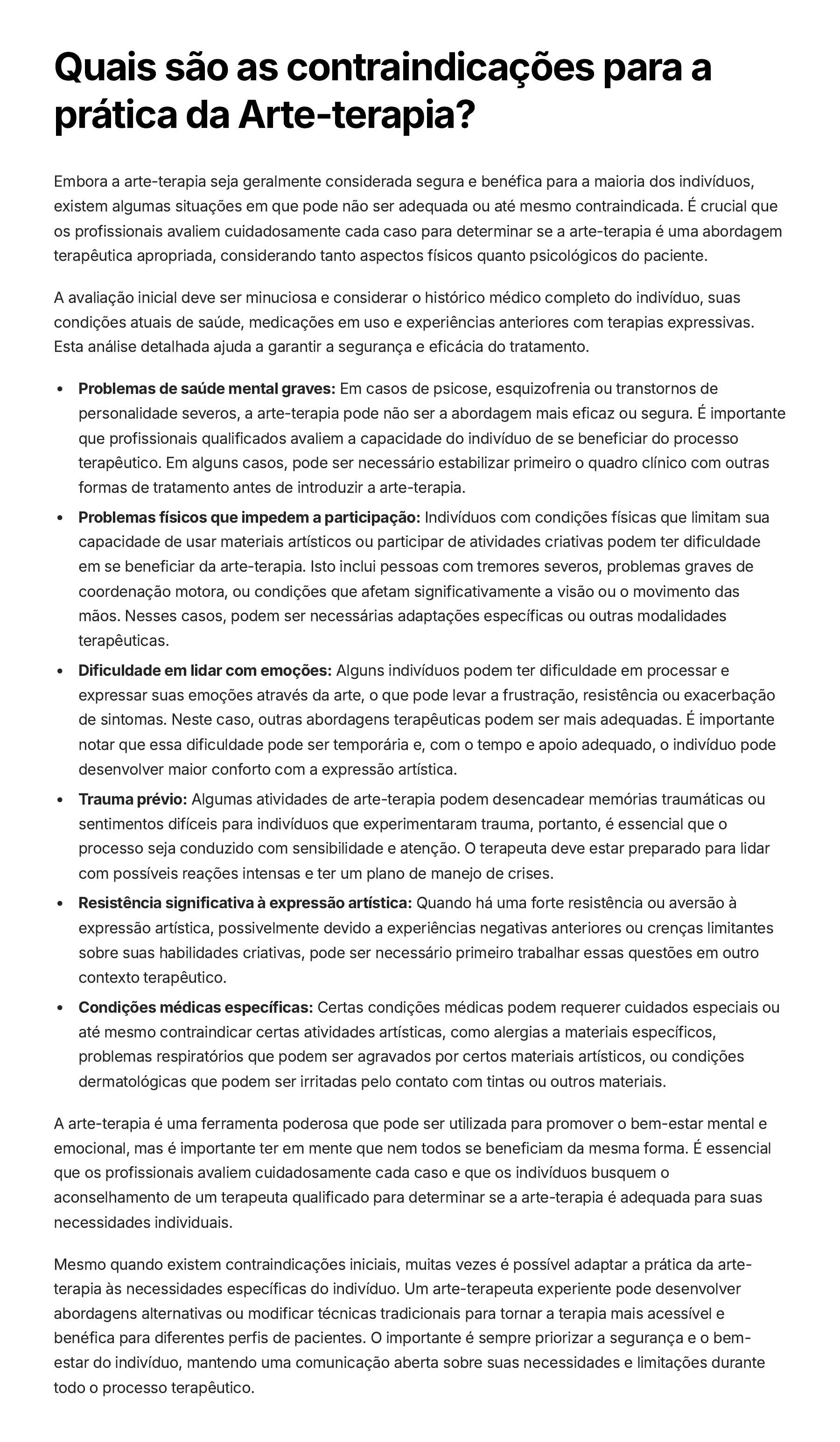 Quais são as contraindicações para a prática da Arte-terapia? Embora a arte-terapia seja geralmente considerada segura e benéfica para a maioria dos indivíduos, existem algumas situações em que pode não ser adequada ou até mesmo contraindicada. É crucial que os profissionais avaliem cuidadosamente cada caso para determinar se a arte-terapia é uma abordagem terapêutica apropriada, considerando tanto aspectos físicos quanto psicológicos do paciente. A avaliação inicial deve ser minuciosa e considerar o histórico médico completo do indivíduo, suas condições atuais de saúde, medicações em uso e experiências anteriores com terapias expressivas. Esta análise detalhada ajuda a garantir a segurança e eficácia do tratamento. Problemas de saúde mental graves: Em casos de psicose, esquizofrenia ou transtornos de personalidade severos, a arte-terapia pode não ser a abordagem mais eficaz ou segura. É importante que profissionais qualificados avaliem a capacidade do indivíduo de se beneficiar do processo terapêutico. Em alguns casos, pode ser necessário estabilizar primeiro o quadro clínico com outras formas de tratamento antes de introduzir a arte-terapia. Problemas físicos que impedem a participação: Indivíduos com condições físicas que limitam sua capacidade de usar materiais artísticos ou participar de atividades criativas podem ter dificuldade em se beneficiar da arte-terapia. Isto inclui pessoas com tremores severos, problemas graves de coordenação motora, ou condições que afetam significativamente a visão ou o movimento das mãos. Nesses casos, podem ser necessárias adaptações específicas ou outras modalidades terapêuticas. Dificuldade em lidar com emoções: Alguns indivíduos podem ter dificuldade em processar e expressar suas emoções através da arte, o que pode levar a frustração, resistência ou exacerbação de sintomas. Neste caso, outras abordagens terapêuticas podem ser mais adequadas. É importante notar que essa dificuldade pode ser temporária e, com o tempo e apoio adequado, o indivíduo pode desenvolver maior conforto com a expressão artística. Trauma prévio: Algumas atividades de arte-terapia podem desencadear memórias traumáticas ou sentimentos difíceis para indivíduos que experimentaram trauma, portanto, é essencial que o processo seja conduzido com sensibilidade e atenção. O terapeuta deve estar preparado para lidar com possíveis reações intensas e ter um plano de manejo de crises. Resistência significativa à expressão artística: Quando há uma forte resistência ou aversão à expressão artística, possivelmente devido a experiências negativas anteriores ou crenças limitantes sobre suas habilidades criativas, pode ser necessário primeiro trabalhar essas questões em outro contexto terapêutico. Condições médicas específicas: Certas condições médicas podem requerer cuidados especiais ou até mesmo contraindicar certas atividades artísticas, como alergias a materiais específicos, problemas respiratórios que podem ser agravados por certos materiais artísticos, ou condições dermatológicas que podem ser irritadas pelo contato com tintas ou outros materiais. A arte-terapia é uma ferramenta poderosa que pode ser utilizada para promover o bem-estar mental e emocional, mas é importante ter em mente que nem todos se beneficiam da mesma forma. É essencial que os profissionais avaliem cuidadosamente cada caso e que os indivíduos busquem o aconselhamento de um terapeuta qualificado para determinar se a arte-terapia é adequada para suas necessidades individuais. Mesmo quando existem contraindicações iniciais, muitas vezes é possível adaptar a prática da arte- terapia às necessidades específicas do indivíduo. Um arte-terapeuta experiente pode desenvolver abordagens alternativas ou modificar técnicas tradicionais para tornar a terapia mais acessível e benéfica para diferentes perfis de pacientes. O importante é sempre priorizar a segurança e o bem- estar do indivíduo, mantendo uma comunicação aberta sobre suas necessidades e limitações durante todo o processo terapêutico.