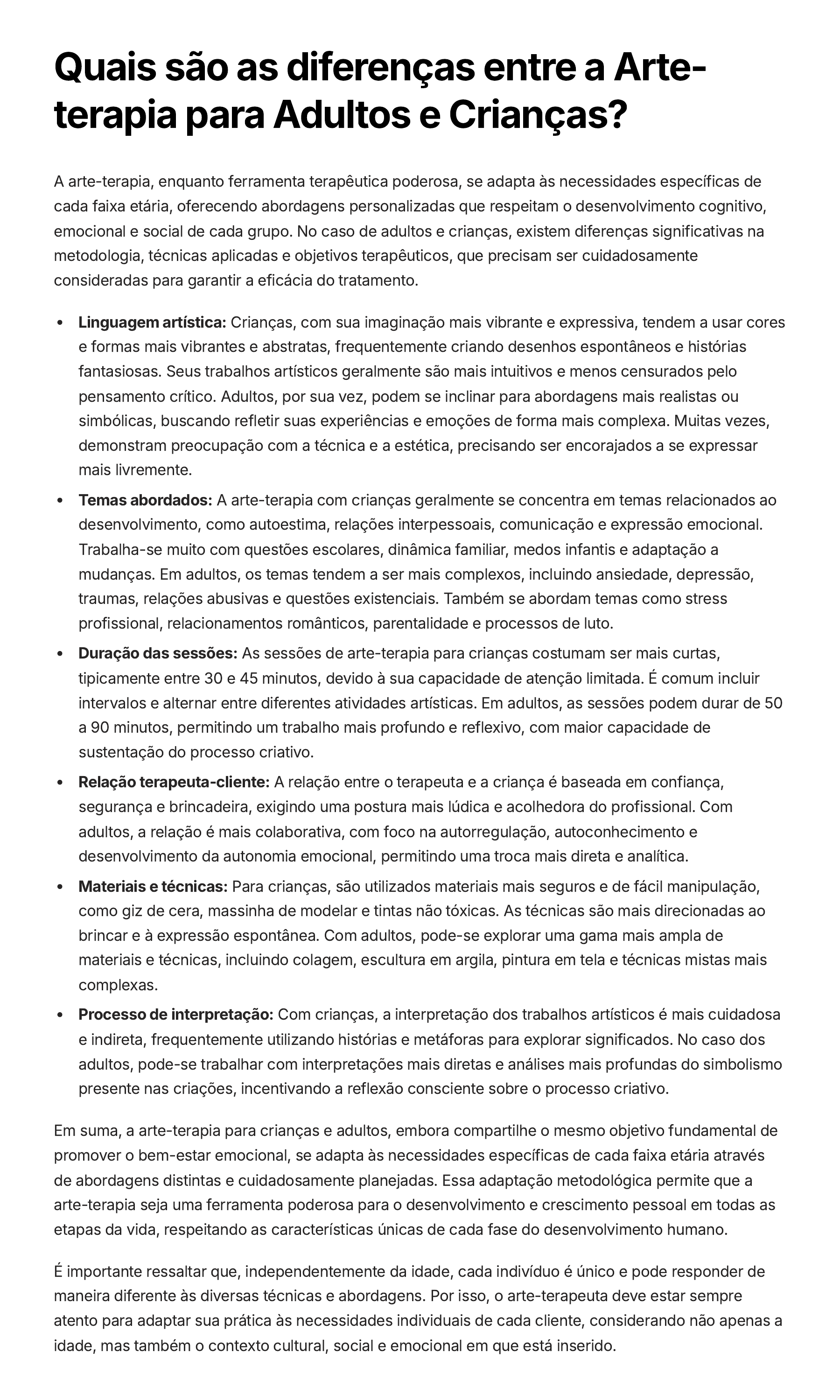 Quais são as diferenças entre a Arte- terapia para Adultos e Crianças? A arte-terapia, enquanto ferramenta terapêutica poderosa, se adapta às necessidades específicas de cada faixa etária, oferecendo abordagens personalizadas que respeitam o desenvolvimento cognitivo, emocional e social de cada grupo. No caso de adultos e crianças, existem diferenças significativas na metodologia, técnicas aplicadas e objetivos terapêuticos, que precisam ser cuidadosamente consideradas para garantir a eficácia do tratamento. Linguagem artística: Crianças, com sua imaginação mais vibrante e expressiva, tendem a usar cores e formas mais vibrantes e abstratas, frequentemente criando desenhos espontâneos e histórias fantasiosas. Seus trabalhos artísticos geralmente são mais intuitivos e menos censurados pelo pensamento crítico. Adultos, por sua vez, podem se inclinar para abordagens mais realistas ou simbólicas, buscando refletir suas experiências e emoções de forma mais complexa. Muitas vezes, demonstram preocupação com a técnica e a estética, precisando ser encorajados a se expressar mais livremente. Temas abordados: A arte-terapia com crianças geralmente se concentra em temas relacionados ao desenvolvimento, como autoestima, relações interpessoais, comunicação e expressão emocional. Trabalha-se muito com questões escolares, dinâmica familiar, medos infantis e adaptação a mudanças. Em adultos, os temas tendem a ser mais complexos, incluindo ansiedade, depressão, traumas, relações abusivas e questões existenciais. Também se abordam temas como stress profissional, relacionamentos românticos, parentalidade e processos de luto. Duração das sessões: As sessões de arte-terapia para crianças costumam ser mais curtas, tipicamente entre 30 e 45 minutos, devido à sua capacidade de atenção limitada. É comum incluir intervalos e alternar entre diferentes atividades artísticas. Em adultos, as sessões podem durar de 50 a 90 minutos, permitindo um trabalho mais profundo e reflexivo, com maior capacidade de sustentação do processo criativo. Relação terapeuta-cliente: A relação entre o terapeuta e a criança é baseada em confiança, segurança e brincadeira, exigindo uma postura mais lúdica e acolhedora do profissional. Com adultos, a relação é mais colaborativa, com foco na autorregulação, autoconhecimento e desenvolvimento da autonomia emocional, permitindo uma troca mais direta e analítica. Materiais e técnicas: Para crianças, são utilizados materiais mais seguros e de fácil manipulação, como giz de cera, massinha de modelar e tintas não tóxicas. As técnicas são mais direcionadas ao brincar e à expressão espontânea. Com adultos, pode-se explorar uma gama mais ampla de materiais e técnicas, incluindo colagem, escultura em argila, pintura em tela e técnicas mistas mais complexas. Processo de interpretação: Com crianças, a interpretação dos trabalhos artísticos é mais cuidadosa e indireta, frequentemente utilizando histórias e metáforas para explorar significados. No caso dos adultos, pode-se trabalhar com interpretações mais diretas e análises mais profundas do simbolismo presente nas criações, incentivando a reflexão consciente sobre o processo criativo. Em suma, a arte-terapia para crianças e adultos, embora compartilhe o mesmo objetivo fundamental de promover o bem-estar emocional, se adapta às necessidades específicas de cada faixa etária através de abordagens distintas e cuidadosamente planejadas. Essa adaptação metodológica permite que a arte-terapia seja uma ferramenta poderosa para o desenvolvimento e crescimento pessoal em todas as etapas da vida, respeitando as características únicas de cada fase do desenvolvimento humano. É importante ressaltar que, independentemente da idade, cada indivíduo é único e pode responder de maneira diferente às diversas técnicas e abordagens. Por isso, o arte-terapeuta deve estar sempre atento para adaptar sua prática às necessidades individuais de cada cliente, considerando não apenas a idade, mas também o contexto cultural, social e emocional em que está inserido.