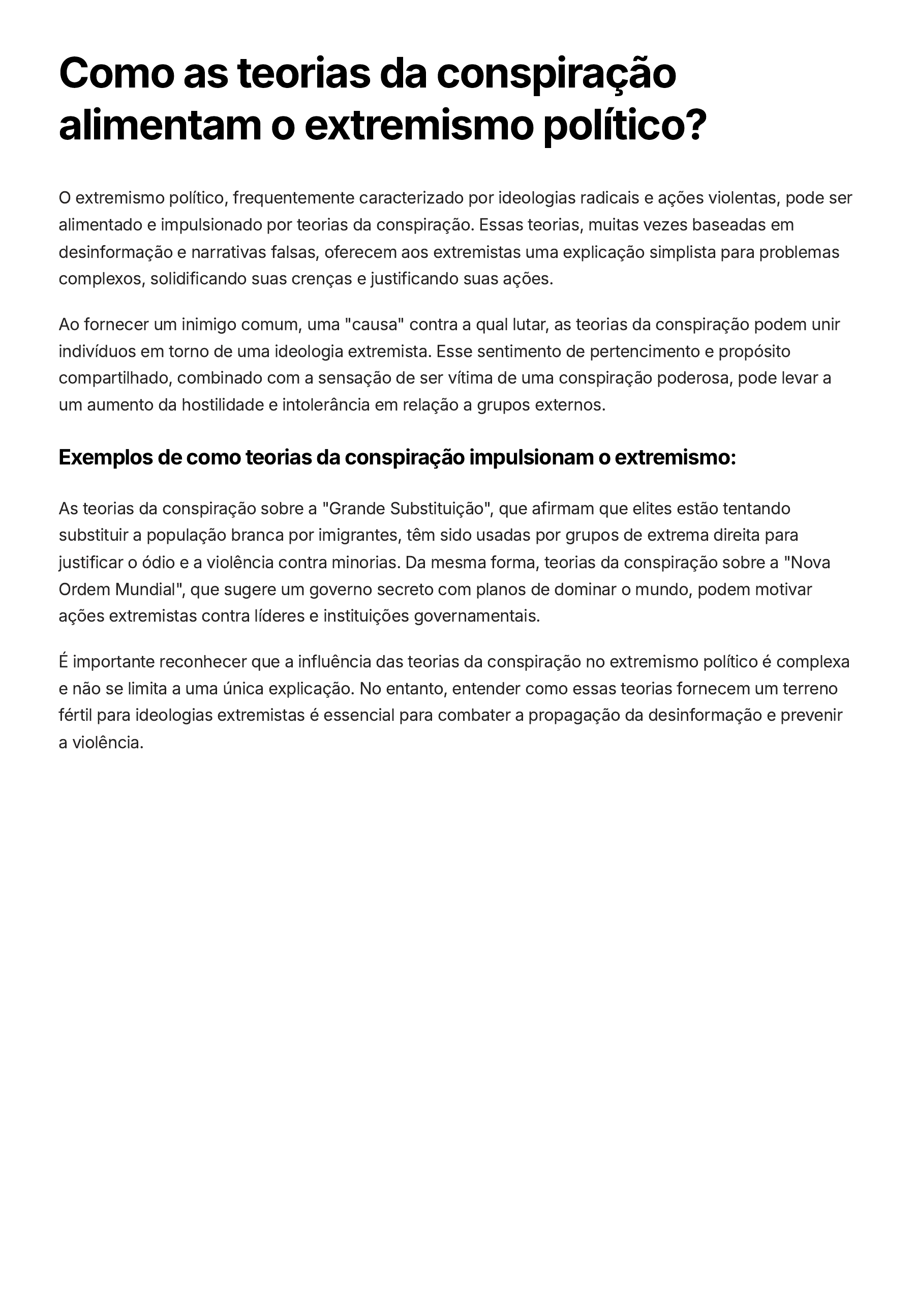Como as teorias da conspiração alimentam o extremismo político? O extremismo político, frequentemente caracterizado por ideologias radicais e ações violentas, pode ser alimentado e impulsionado por teorias da conspiração. Essas teorias, muitas vezes baseadas em desinformação e narrativas falsas, oferecem aos extremistas uma explicação simplista para problemas complexos, solidificando suas crenças e justificando suas ações. Ao fornecer um inimigo comum, uma "causa" contra a qual lutar, as teorias da conspiração podem unir indivíduos em torno de uma ideologia extremista. Esse sentimento de pertencimento e propósito compartilhado, combinado com a sensação de ser vítima de uma conspiração poderosa, pode levar a um aumento da hostilidade e intolerância em relação a grupos externos. Exemplos de como teorias da conspiração impulsionam o extremismo: As teorias da conspiração sobre a "Grande Substituição", que afirmam que elites estão tentando substituir a população branca por imigrantes, têm sido usadas por grupos de extrema direita para justificar o ódio e a violência contra minorias. Da mesma forma, teorias da conspiração sobre a "Nova Ordem Mundial", que sugere um governo secreto com planos de dominar o mundo, podem motivar ações extremistas contra líderes e instituições governamentais. É importante reconhecer que a influência das teorias da conspiração no extremismo político é complexa e não se limita a uma única explicação. No entanto, entender como essas teorias fornecem um terreno fértil para ideologias extremistas é essencial para combater a propagação da desinformação e prevenir a violência. Como as Teorias da Conspiração Influenciam os Movimentos Antisistema? Movimentos antisistema, que desafiam as estruturas de poder existentes, frequentemente se alimentam de teorias da conspiração. A crença em teorias da conspiração fornece uma narrativa que explica as desigualdades sociais e a injustiça percebida, oferecendo uma explicação simples para problemas complexos. Essas teorias frequentemente pintam um quadro de um "inimigo" poderoso e oculto, que controla os bastidores do poder e age contra o bem comum. Essa narrativa cria um senso de união entre os membros do movimento, fortalecendo a identidade do grupo. Teorias da conspiração podem fornecer um senso de agência e controle para aqueles que se sentem marginalizados e impotentes diante das instituições dominantes. Elas oferecem uma explicação para seus problemas e sugerem que algo pode ser feito para mudá-los. A proliferação de informações online facilita a propagação de teorias da conspiração e a organização de movimentos antisistema. Plataformas de mídia social permitem que indivíduos com ideias semelhantes se conectem e compartilhem informações, ampliando o alcance de suas mensagens. É fundamental diferenciar movimentos antisistema legítimos que buscam mudanças sociais por meio de ações pacíficas e aqueles que se baseiam em teorias da conspiração para justificar violência e extremismo. A disseminação de desinformação e o discurso de ódio podem ter consequências devastadoras para a sociedade. Compreender a relação entre teorias da conspiração e movimentos antisistema é essencial para abordar as causas profundas da desconfiança nas instituições e promover um debate público mais saudável e informado. Como as Teorias da Conspiração se Relacionam com as Teorias da Guerra? A interseção entre teorias da conspiração e teorias da guerra é complexa e muitas vezes perigosa. As narrativas de conspiração podem ser usadas para justificar ações militares, manipular a opinião pública e alimentar o nacionalismo. Por exemplo, a teoria da conspiração de que o ataque de Pearl Harbor foi uma operação de bandeira falsa, organizada pelo próprio governo americano para justificar a entrada dos Estados Unidos na Segunda Guerra Mundial, ainda é propagada por alguns grupos. Esse tipo de narrativa, embora desmentida por evidências históricas, pode contribuir para a desconfiança em relação ao governo e a hostilidade em relação a outros países. Teorias da conspiração sobre invasões e ataques terroristas podem levar a um clima de medo e paranoia, intensificando a polarização política e a xenofobia. A proliferação de teorias da conspiração sobre armas de destruição em massa, como aconteceu com o Iraque na década de 2000, pode servir como pretexto para intervenções militares. Teorias da conspiração sobre guerras secretas e governos secretos podem alimentar o sentimento de que a sociedade está sendo enganada por elites poderosas, alimentando movimentos antissistema e a desconfiança nas instituições. É fundamental ter consciência da influência das teorias da conspiração no discurso público sobre guerras e conflitos. A desinformação pode ter um impacto devastador na política internacional, na paz global e na vida de pessoas inocentes. A educação e a alfabetização midiática são cruciais para combater a propagação de narrativas falsas e promover um debate público mais responsável e informado.