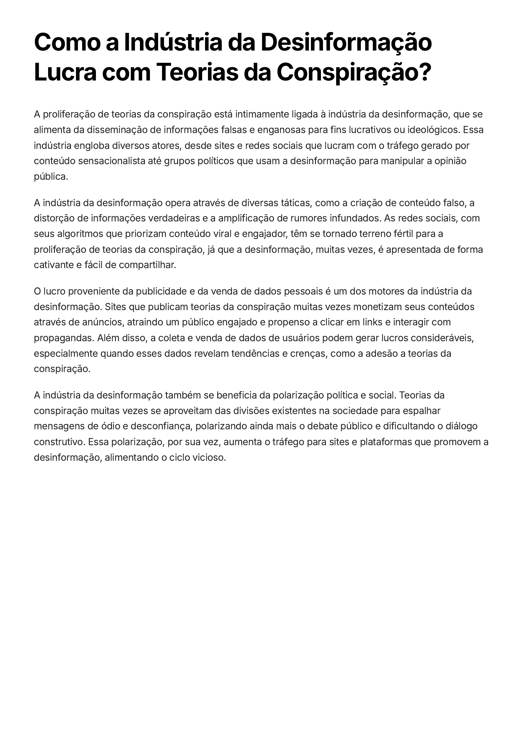 Como a Indústria da Desinformação Lucra com Teorias da Conspiração? A proliferação de teorias da conspiração está intimamente ligada à indústria da desinformação, que se alimenta da disseminação de informações falsas e enganosas para fins lucrativos ou ideológicos. Essa indústria engloba diversos atores, desde sites e redes sociais que lucram com o tráfego gerado por conteúdo sensacionalista até grupos políticos que usam a desinformação para manipular a opinião pública. A indústria da desinformação opera através de diversas táticas, como a criação de conteúdo falso, a distorção de informações verdadeiras e a amplificação de rumores infundados. As redes sociais, com seus algoritmos que priorizam conteúdo viral e engajador, têm se tornado terreno fértil para a proliferação de teorias da conspiração, já que a desinformação, muitas vezes, é apresentada de forma cativante e fácil de compartilhar. O lucro proveniente da publicidade e da venda de dados pessoais é um dos motores da indústria da desinformação. Sites que publicam teorias da conspiração muitas vezes monetizam seus conteúdos através de anúncios, atraindo um público engajado e propenso a clicar em links e interagir com propagandas. Além disso, a coleta e venda de dados de usuários podem gerar lucros consideráveis, especialmente quando esses dados revelam tendências e crenças, como a adesão a teorias da conspiração. A indústria da desinformação também se beneficia da polarização política e social. Teorias da conspiração muitas vezes se aproveitam das divisões existentes na sociedade para espalhar mensagens de ódio e desconfiança, polarizando ainda mais o debate público e dificultando o diálogo construtivo. Essa polarização, por sua vez, aumenta o tráfego para sites e plataformas que promovem a desinformação, alimentando o ciclo vicioso. Como as Teorias da Conspiração Afetam o Mundo Corporativo? As teorias da conspiração podem ter um impacto significativo no mundo corporativo, afetando a reputação das empresas, as relações com os clientes e até mesmo os resultados financeiros. Empresas que são alvo de teorias da conspiração podem enfrentar uma série de desafios, como: Perda de confiança dos clientes e investidores Dificuldade em atrair e reter talentos Aumento dos custos de gerenciamento de crises Danos à marca e à reputação Algumas teorias da conspiração podem ser baseadas em informações falsas ou distorcidas, mas podem ser amplamente difundidas por meio de redes sociais e outros meios de comunicação, causando danos consideráveis à imagem da empresa. A resposta das empresas às teorias da conspiração deve ser estratégica e abrangente. É crucial: Monitorar as redes sociais e outros canais de comunicação em busca de teorias da conspiração Desmentir informações falsas com base em fatos e evidências Comunicar-se abertamente com os clientes e stakeholders Construir confiança e transparência nas relações com o público A prevenção é fundamental. As empresas devem se esforçar para construir uma cultura de transparência, ética e responsabilidade social para minimizar os riscos de serem alvo de teorias da conspiração. Como as Teorias da Conspiração se Relacionam com a Crise da Confiança? A proliferação de teorias da conspiração está profundamente ligada à crise de confiança que assola as sociedades modernas. A desconfiança nas instituições, na mídia e em figuras de autoridade é um terreno fértil para a disseminação de narrativas conspiratórias, que oferecem explicações alternativas, muitas vezes mais simples e atraentes, para eventos complexos e perturbadores. A crise da confiança se manifesta em diversas áreas, como a política, a saúde pública, a economia e a ciência. A crescente polarização política, a desinformação online e a proliferação de notícias falsas contribuem para um ambiente de desconfiança generalizada, onde as pessoas questionam a veracidade das informações e buscam explicações alternativas para eventos que as desafiam. As teorias da conspiração aproveitam essa crise de confiança para oferecer um senso de ordem e controle em um mundo que parece cada vez mais caótico. Ao atribuir eventos complexos a ações secretas e malévolas de grupos poderosos, as teorias da conspiração fornecem uma narrativa que, embora baseada em especulações e desinformação, oferece uma sensação de compreensão e de que as coisas estão sob controle. É importante reconhecer que a crise da confiança é um problema complexo com raízes profundas, mas entender o papel das teorias da conspiração nesse contexto é crucial para combater a desinformação e promover um diálogo mais saudável e construtivo na sociedade.