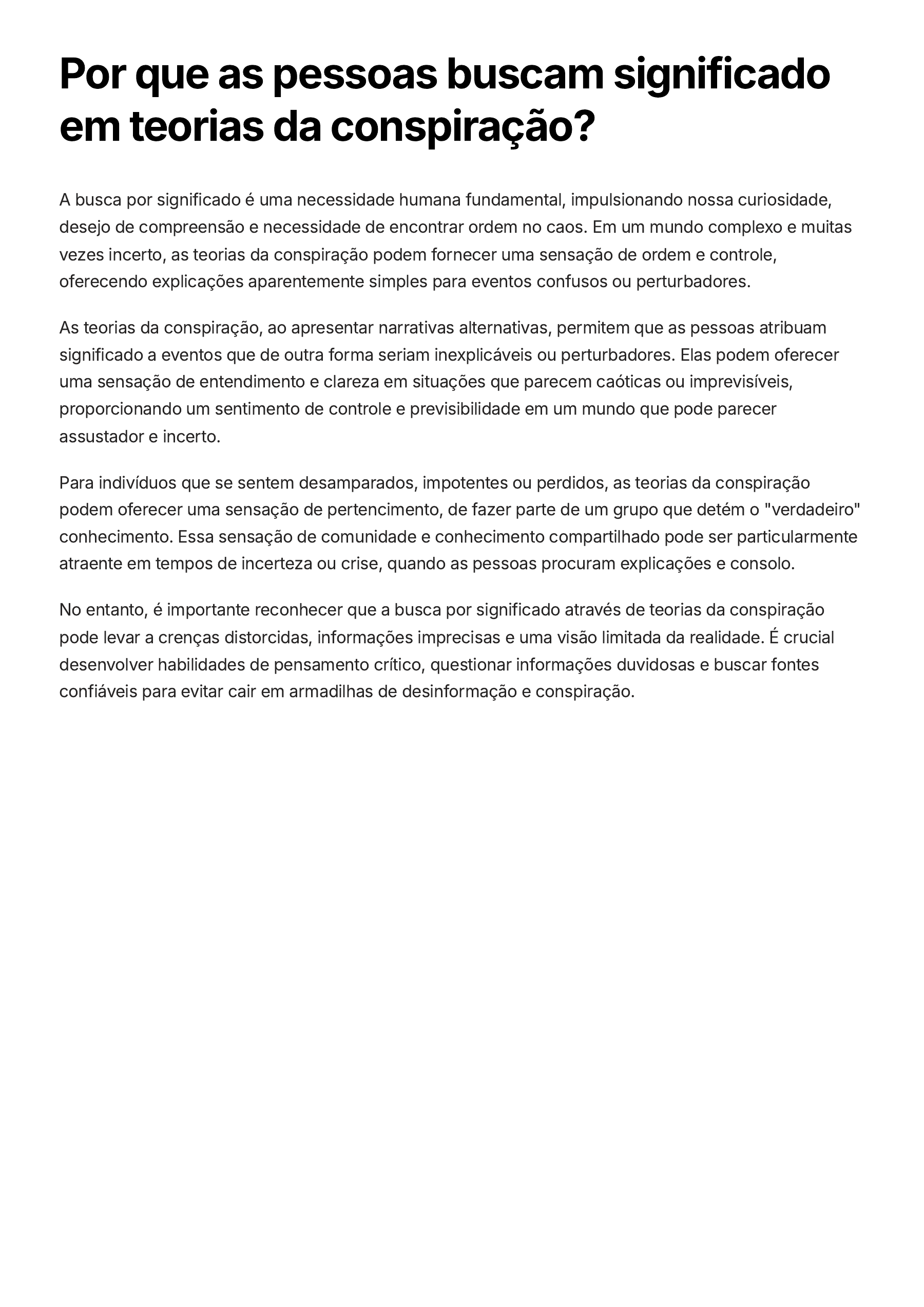 Por que as pessoas buscam significado em teorias da conspiração? A busca por significado é uma necessidade humana fundamental, impulsionando nossa curiosidade, desejo de compreensão e necessidade de encontrar ordem no caos. Em um mundo complexo e muitas vezes incerto, as teorias da conspiração podem fornecer uma sensação de ordem e controle, oferecendo explicações aparentemente simples para eventos confusos ou perturbadores. As teorias da conspiração, ao apresentar narrativas alternativas, permitem que as pessoas atribuam significado a eventos que de outra forma seriam inexplicáveis ou perturbadores. Elas podem oferecer uma sensação de entendimento e clareza em situações que parecem caóticas ou imprevisíveis, proporcionando um sentimento de controle e previsibilidade em um mundo que pode parecer assustador e incerto. Para indivíduos que se sentem desamparados, impotentes ou perdidos, as teorias da conspiração podem oferecer uma sensação de pertencimento, de fazer parte de um grupo que detém o "verdadeiro" conhecimento. Essa sensação de comunidade e conhecimento compartilhado pode ser particularmente atraente em tempos de incerteza ou crise, quando as pessoas procuram explicações e consolo. No entanto, é importante reconhecer que a busca por significado através de teorias da conspiração pode levar a crenças distorcidas, informações imprecisas e uma visão limitada da realidade. É crucial desenvolver habilidades de pensamento crítico, questionar informações duvidosas e buscar fontes confiáveis para evitar cair em armadilhas de desinformação e conspiração. Como a necessidade de pertencimento influencia a adesão às teorias da conspiração? A necessidade de pertencimento é uma das necessidades humanas básicas, e a psicologia demonstra como ela pode ser um motor por trás da adesão a teorias da conspiração. Em um mundo cada vez mais complexo e individualizado, sentir-se parte de um grupo com crenças e valores compartilhados pode trazer conforto e segurança. As teorias da conspiração podem oferecer esse senso de comunidade, especialmente para aqueles que se sentem marginalizados ou excluídos da sociedade. Ao compartilhar crenças conspiratórias, indivíduos podem se conectar com outros que compartilham suas visões, criando uma sensação de pertencimento e identidade. A adesão a teorias da conspiração pode ser uma forma de lidar com a sensação de impotência e incerteza em um mundo que parece caótico e imprevisível. A crença em uma conspiração pode oferecer uma explicação simplista e satisfatória para eventos complexos, proporcionando uma sensação de controle e previsibilidade. A sensação de pertencimento a um grupo de "iniciados" que "conhecem a verdade" também pode contribuir para a autoestima e autoimagem do indivíduo. As teorias da conspiração podem fortalecer a sensação de pertencimento, especialmente para aqueles que se sentem excluídos ou marginalizados pela sociedade dominante. Como as teorias da conspiração podem influenciar a busca por status social? A adesão a teorias da conspiração pode, em certos casos, servir como uma forma de buscar status social dentro de determinados grupos. Isso acontece porque compartilhar crenças alternativas e informações "exclusivas" pode fortalecer laços e criar uma sensação de pertencimento. Indivíduos que se sentem marginalizados ou excluídos da sociedade podem encontrar em grupos que acreditam em teorias da conspiração uma comunidade onde se sentem acolhidos e validados. Ao abraçar teorias da conspiração complexas e controversas, esses indivíduos podem se sentir "inteligentes" e "informados", diferenciando-se de outros que não compartilham de suas crenças. Essa dinâmica se torna particularmente forte em ambientes online, onde comunidades de teóricos da conspiração se formam e se fortalecem através da troca constante de informações e da validação mútua. A busca por status social pode ser impulsionada por uma necessidade de reconhecimento, uma sensação de poder e controle, ou até mesmo por um desejo de se sentir parte de algo maior do que si mesmo. É importante lembrar que a busca por status não justifica a propagação de informações falsas e descabidas, e que o verdadeiro conhecimento e a busca pela verdade devem sempre estar acima de qualquer tipo de necessidade social.