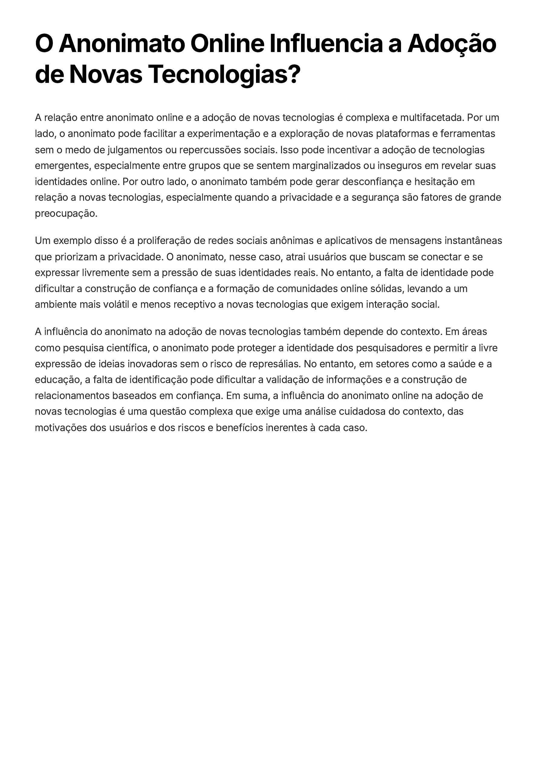 O Anonimato Online Influencia a Adoção de Novas Tecnologias? A relação entre anonimato online e a adoção de novas tecnologias é complexa e multifacetada. Por um lado, o anonimato pode facilitar a experimentação e a exploração de novas plataformas e ferramentas sem o medo de julgamentos ou repercussões sociais. Isso pode incentivar a adoção de tecnologias emergentes, especialmente entre grupos que se sentem marginalizados ou inseguros em revelar suas identidades online. Por outro lado, o anonimato também pode gerar desconfiança e hesitação em relação a novas tecnologias, especialmente quando a privacidade e a segurança são fatores de grande preocupação. Um exemplo disso é a proliferação de redes sociais anônimas e aplicativos de mensagens instantâneas que priorizam a privacidade. O anonimato, nesse caso, atrai usuários que buscam se conectar e se expressar livremente sem a pressão de suas identidades reais. No entanto, a falta de identidade pode dificultar a construção de confiança e a formação de comunidades online sólidas, levando a um ambiente mais volátil e menos receptivo a novas tecnologias que exigem interação social. A influência do anonimato na adoção de novas tecnologias também depende do contexto. Em áreas como pesquisa científica, o anonimato pode proteger a identidade dos pesquisadores e permitir a livre expressão de ideias inovadoras sem o risco de represálias. No entanto, em setores como a saúde e a educação, a falta de identificação pode dificultar a validação de informações e a construção de relacionamentos baseados em confiança. Em suma, a influência do anonimato online na adoção de novas tecnologias é uma questão complexa que exige uma análise cuidadosa do contexto, das motivações dos usuários e dos riscos e benefícios inerentes à cada caso. Como o Anonimato Online Afeta a Privacidade das Crianças e Adolescentes? O anonimato online, enquanto oferece um senso de liberdade e proteção para alguns, pode representar uma ameaça séria à privacidade de crianças e adolescentes. A falta de identificação online facilita a coleta e o uso indevido de dados pessoais, como nome completo, endereço, número de telefone e fotos. Essa vulnerabilidade aumenta o risco de exposição a conteúdos inadequados, cyberbullying, pedofilia e outros crimes online. Crianças e adolescentes que usam plataformas online anonimamente podem ser alvo de predadores que se aproveitam da falta de identificação para se conectar e manipular suas vítimas. O anonimato online pode dificultar a identificação e a responsabilização de indivíduos que praticam cyberbullying, o que pode levar a um aumento da violência online e do sofrimento psicológico entre crianças e adolescentes. A falta de identificação online também pode contribuir para a disseminação de informações falsas e conteúdo prejudicial, expondo crianças e adolescentes a riscos de saúde mental e bem-estar. É fundamental que pais, educadores e responsáveis por crianças e adolescentes estejam cientes dos riscos do anonimato online e promovam o uso seguro e responsável da internet. A educação sobre a privacidade online, a importância da proteção de dados pessoais e a identificação de comportamentos suspeitos é essencial para proteger as crianças e adolescentes do mundo virtual. O Anonimato Online Pode Ser Usado para Proteger Grupos Vulneráveis? Sim, o anonimato online pode ser uma ferramenta importante para proteger grupos vulneráveis, proporcionando um espaço seguro para comunicação e expressão sem medo de retaliação. O anonimato permite que indivíduos que enfrentam discriminação, intimidação ou perseguição devido à sua identidade de gênero, orientação sexual, crenças religiosas, origem étnica ou outras características possam se conectar com outros, compartilhar suas experiências e buscar apoio. Comunidades online seguras: O anonimato online pode ajudar a criar comunidades online seguras para grupos vulneráveis, onde eles podem se expressar livremente sem medo de serem identificados e discriminados. Proteção contra assédio e perseguição: O anonimato pode proteger indivíduos de assédio online e perseguição, especialmente para aqueles que são alvo de discriminação ou violência devido à sua identidade. Acesso à informação e recursos: O anonimato permite que indivíduos acessem informações e recursos relevantes para suas necessidades específicas, especialmente para aqueles que podem ter medo de procurar ajuda devido à sua situação. Defesa de direitos: O anonimato pode ser crucial para defender os direitos de grupos vulneráveis, permitindo que eles denunciem abusos, compartilhem suas histórias e lutem por justiça sem medo de represálias. No entanto, é essencial garantir que o anonimato online seja usado de forma responsável e ética, para evitar a disseminação de informações falsas ou prejudiciais. O uso do anonimato online para fins de proteção de grupos vulneráveis exige um equilíbrio entre a proteção da privacidade e a responsabilização.