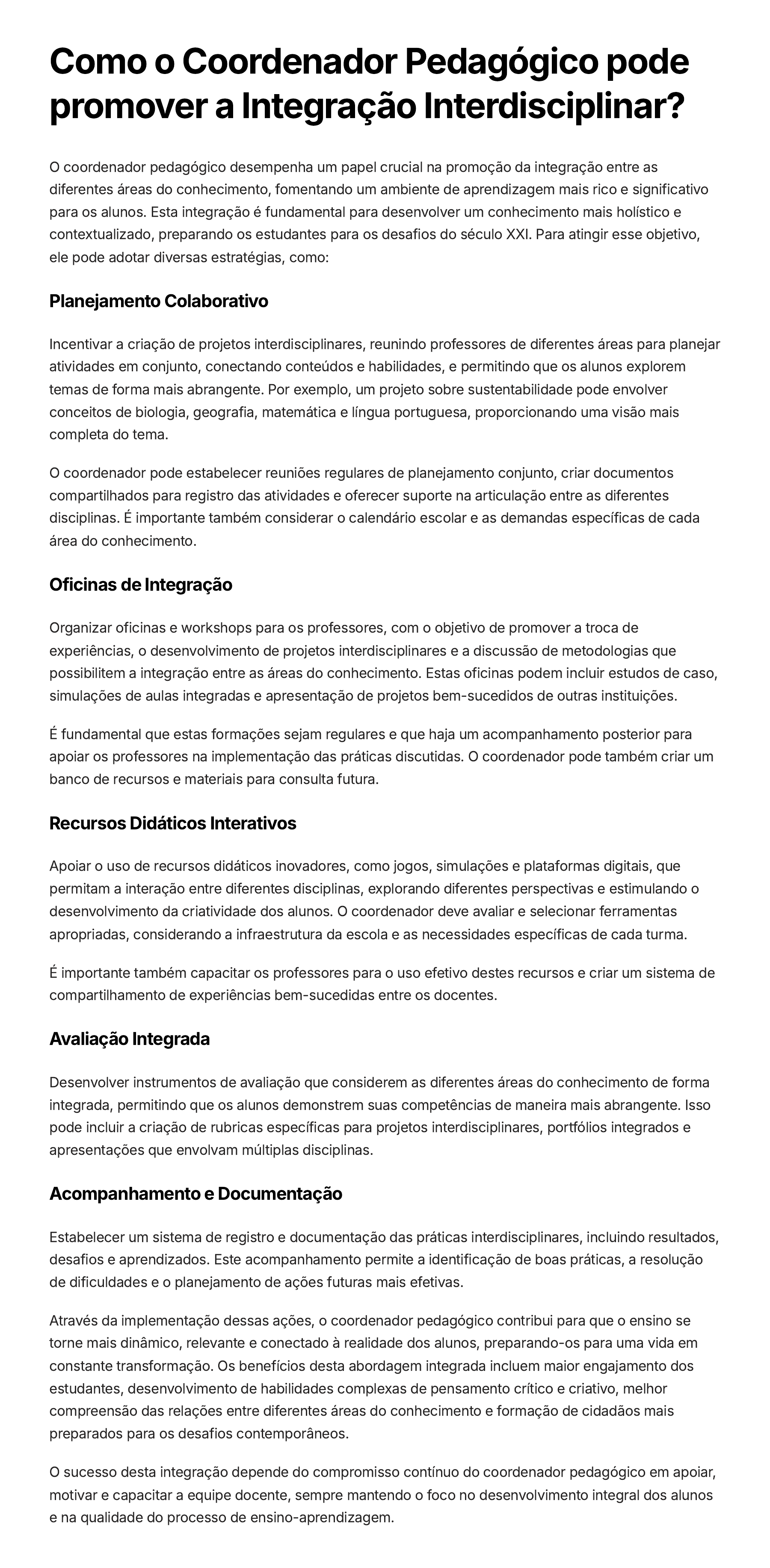Como o Coordenador Pedagógico pode promover a Integração Interdisciplinar? O coordenador pedagógico desempenha um papel crucial na promoção da integração entre as diferentes áreas do conhecimento, fomentando um ambiente de aprendizagem mais rico e significativo para os alunos. Esta integração é fundamental para desenvolver um conhecimento mais holístico e contextualizado, preparando os estudantes para os desafios do século XXI. Para atingir esse objetivo, ele pode adotar diversas estratégias, como: Planejamento Colaborativo Incentivar a criação de projetos interdisciplinares, reunindo professores de diferentes áreas para planejar atividades em conjunto, conectando conteúdos e habilidades, e permitindo que os alunos explorem temas de forma mais abrangente. Por exemplo, um projeto sobre sustentabilidade pode envolver conceitos de biologia, geografia, matemática e língua portuguesa, proporcionando uma visão mais completa do tema. O coordenador pode estabelecer reuniões regulares de planejamento conjunto, criar documentos compartilhados para registro das atividades e oferecer suporte na articulação entre as diferentes disciplinas. É importante também considerar o calendário escolar e as demandas específicas de cada área do conhecimento. Oficinas de Integração Organizar oficinas e workshops para os professores, com o objetivo de promover a troca de experiências, o desenvolvimento de projetos interdisciplinares e a discussão de metodologias que possibilitem a integração entre as áreas do conhecimento. Estas oficinas podem incluir estudos de caso, simulações de aulas integradas e apresentação de projetos bem-sucedidos de outras instituições. É fundamental que estas formações sejam regulares e que haja um acompanhamento posterior para apoiar os professores na implementação das práticas discutidas. O coordenador pode também criar um banco de recursos e materiais para consulta futura. Recursos Didáticos Interativos Apoiar o uso de recursos didáticos inovadores, como jogos, simulações e plataformas digitais, que permitam a interação entre diferentes disciplinas, explorando diferentes perspectivas e estimulando o desenvolvimento da criatividade dos alunos. O coordenador deve avaliar e selecionar ferramentas apropriadas, considerando a infraestrutura da escola e as necessidades específicas de cada turma. É importante também capacitar os professores para o uso efetivo destes recursos e criar um sistema de compartilhamento de experiências bem-sucedidas entre os docentes. Avaliação Integrada Desenvolver instrumentos de avaliação que considerem as diferentes áreas do conhecimento de forma integrada, permitindo que os alunos demonstrem suas competências de maneira mais abrangente. Isso pode incluir a criação de rubricas específicas para projetos interdisciplinares, portfólios integrados e apresentações que envolvam múltiplas disciplinas. Acompanhamento e Documentação Estabelecer um sistema de registro e documentação das práticas interdisciplinares, incluindo resultados, desafios e aprendizados. Este acompanhamento permite a identificação de boas práticas, a resolução de dificuldades e o planejamento de ações futuras mais efetivas. Através da implementação dessas ações, o coordenador pedagógico contribui para que o ensino se torne mais dinâmico, relevante e conectado à realidade dos alunos, preparando-os para uma vida em constante transformação. Os benefícios desta abordagem integrada incluem maior engajamento dos estudantes, desenvolvimento de habilidades complexas de pensamento crítico e criativo, melhor compreensão das relações entre diferentes áreas do conhecimento e formação de cidadãos mais preparados para os desafios contemporâneos. O sucesso desta integração depende do compromisso contínuo do coordenador pedagógico em apoiar, motivar e capacitar a equipe docente, sempre mantendo o foco no desenvolvimento integral dos alunos e na qualidade do processo de ensino-aprendizagem.