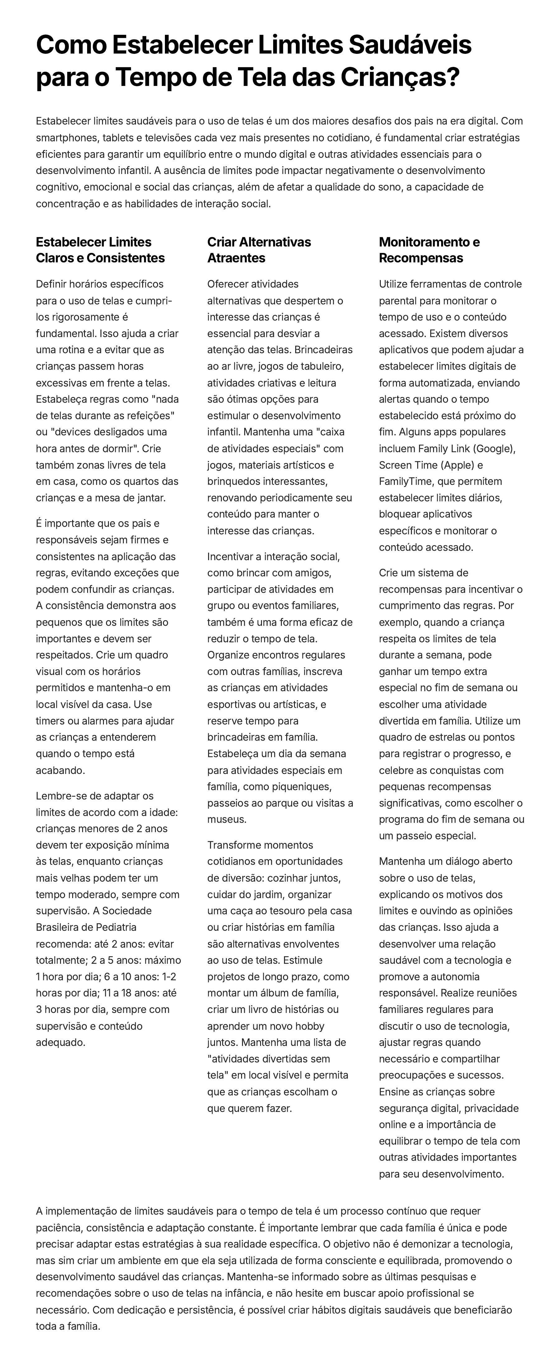 Como Estabelecer Limites Saudáveis para o Tempo de Tela das Crianças? Estabelecer limites saudáveis para o uso de telas é um dos maiores desafios dos pais na era digital. Com smartphones, tablets e televisões cada vez mais presentes no cotidiano, é fundamental criar estratégias eficientes para garantir um equilíbrio entre o mundo digital e outras atividades essenciais para o desenvolvimento infantil. A ausência de limites pode impactar negativamente o desenvolvimento cognitivo, emocional e social das crianças, além de afetar a qualidade do sono, a capacidade de concentração e as habilidades de interação social. Estabelecer Limites Claros e Consistentes Definir horários específicos para o uso de telas e cumpri- los rigorosamente é fundamental. Isso ajuda a criar uma rotina e a evitar que as crianças passem horas excessivas em frente a telas. Estabeleça regras como "nada de telas durante as refeições" ou "devices desligados uma hora antes de dormir". Crie também zonas livres de tela em casa, como os quartos das crianças e a mesa de jantar. É importante que os pais e responsáveis sejam firmes e consistentes na aplicação das regras, evitando exceções que podem confundir as crianças. A consistência demonstra aos pequenos que os limites são importantes e devem ser respeitados. Crie um quadro visual com os horários permitidos e mantenha-o em local visível da casa. Use timers ou alarmes para ajudar as crianças a entenderem quando o tempo está acabando. Lembre-se de adaptar os limites de acordo com a idade: crianças menores de 2 anos devem ter exposição mínima às telas, enquanto crianças mais velhas podem ter um tempo moderado, sempre com supervisão. A Sociedade Brasileira de Pediatria recomenda: até 2 anos: evitar totalmente; 2 a 5 anos: máximo 1 hora por dia; 6 a 10 anos: 1-2 horas por dia; 11 a 18 anos: até 3 horas por dia, sempre com supervisão e conteúdo adequado. Criar Alternativas Atraentes Oferecer atividades alternativas que despertem o interesse das crianças é essencial para desviar a atenção das telas. Brincadeiras ao ar livre, jogos de tabuleiro, atividades criativas e leitura são ótimas opções para estimular o desenvolvimento infantil. Mantenha uma "caixa de atividades especiais" com jogos, materiais artísticos e brinquedos interessantes, renovando periodicamente seu conteúdo para manter o interesse das crianças. Incentivar a interação social, como brincar com amigos, participar de atividades em grupo ou eventos familiares, também é uma forma eficaz de reduzir o tempo de tela. Organize encontros regulares com outras famílias, inscreva as crianças em atividades esportivas ou artísticas, e reserve tempo para brincadeiras em família. Estabeleça um dia da semana para atividades especiais em família, como piqueniques, passeios ao parque ou visitas a museus. Transforme momentos cotidianos em oportunidades de diversão: cozinhar juntos, cuidar do jardim, organizar uma caça ao tesouro pela casa ou criar histórias em família são alternativas envolventes ao uso de telas. Estimule projetos de longo prazo, como montar um álbum de família, criar um livro de histórias ou aprender um novo hobby juntos. Mantenha uma lista de "atividades divertidas sem tela" em local visível e permita que as crianças escolham o que querem fazer. Monitoramento e Recompensas Utilize ferramentas de controle parental para monitorar o tempo de uso e o conteúdo acessado. Existem diversos aplicativos que podem ajudar a estabelecer limites digitais de forma automatizada, enviando alertas quando o tempo estabelecido está próximo do fim. Alguns apps populares incluem Family Link (Google), Screen Time (Apple) e FamilyTime, que permitem estabelecer limites diários, bloquear aplicativos específicos e monitorar o conteúdo acessado. Crie um sistema de recompensas para incentivar o cumprimento das regras. Por exemplo, quando a criança respeita os limites de tela durante a semana, pode ganhar um tempo extra especial no fim de semana ou escolher uma atividade divertida em família. Utilize um quadro de estrelas ou pontos para registrar o progresso, e celebre as conquistas com pequenas recompensas significativas, como escolher o programa do fim de semana ou um passeio especial. Mantenha um diálogo aberto sobre o uso de telas, explicando os motivos dos limites e ouvindo as opiniões das crianças. Isso ajuda a desenvolver uma relação saudável com a tecnologia e promove a autonomia responsável. Realize reuniões familiares regulares para discutir o uso de tecnologia, ajustar regras quando necessário e compartilhar preocupações e sucessos. Ensine as crianças sobre segurança digital, privacidade online e a importância de equilibrar o tempo de tela com outras atividades importantes para seu desenvolvimento. A implementação de limites saudáveis para o tempo de tela é um processo contínuo que requer paciência, consistência e adaptação constante. É importante lembrar que cada família é única e pode precisar adaptar estas estratégias à sua realidade específica. O objetivo não é demonizar a tecnologia, mas sim criar um ambiente em que ela seja utilizada de forma consciente e equilibrada, promovendo o desenvolvimento saudável das crianças. Mantenha-se informado sobre as últimas pesquisas e recomendações sobre o uso de telas na infância, e não hesite em buscar apoio profissional se necessário. Com dedicação e persistência, é possível criar hábitos digitais saudáveis que beneficiarão toda a família.