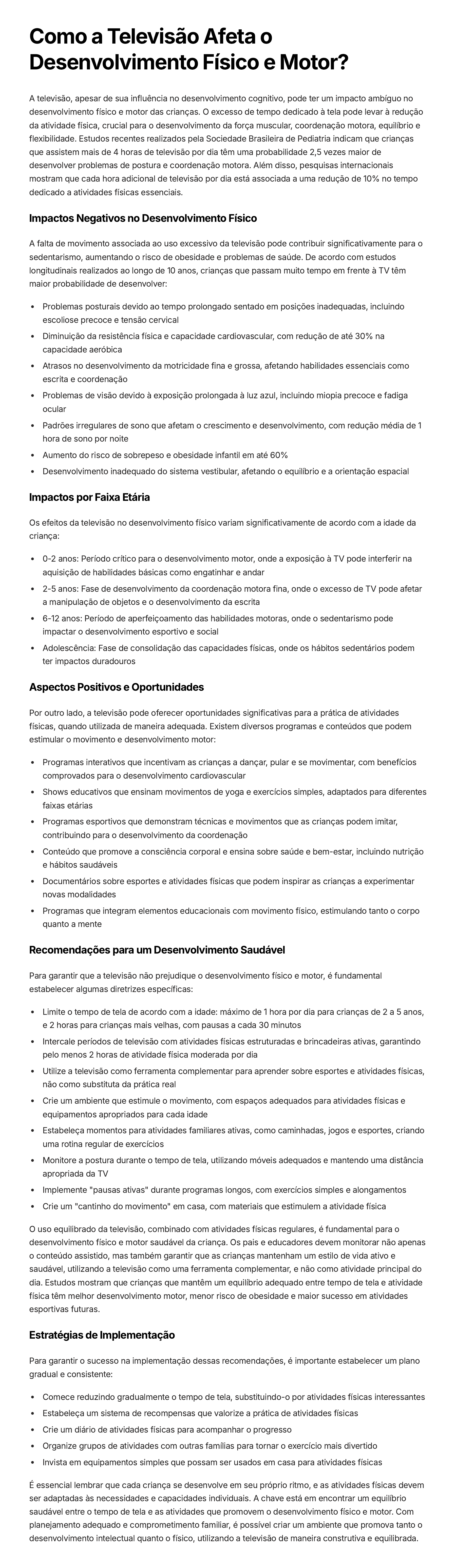 Como a Televisão Afeta o Desenvolvimento Físico e Motor? A televisão, apesar de sua influência no desenvolvimento cognitivo, pode ter um impacto ambíguo no desenvolvimento físico e motor das crianças. O excesso de tempo dedicado à tela pode levar à redução da atividade física, crucial para o desenvolvimento da força muscular, coordenação motora, equilíbrio e flexibilidade. Estudos recentes realizados pela Sociedade Brasileira de Pediatria indicam que crianças que assistem mais de 4 horas de televisão por dia têm uma probabilidade 2,5 vezes maior de desenvolver problemas de postura e coordenação motora. Além disso, pesquisas internacionais mostram que cada hora adicional de televisão por dia está associada a uma redução de 10% no tempo dedicado a atividades físicas essenciais. Impactos Negativos no Desenvolvimento Físico A falta de movimento associada ao uso excessivo da televisão pode contribuir significativamente para o sedentarismo, aumentando o risco de obesidade e problemas de saúde. De acordo com estudos longitudinais realizados ao longo de 10 anos, crianças que passam muito tempo em frente à TV têm maior probabilidade de desenvolver: Problemas posturais devido ao tempo prolongado sentado em posições inadequadas, incluindo escoliose precoce e tensão cervical Diminuição da resistência física e capacidade cardiovascular, com redução de até 30% na capacidade aeróbica Atrasos no desenvolvimento da motricidade fina e grossa, afetando habilidades essenciais como escrita e coordenação Problemas de visão devido à exposição prolongada à luz azul, incluindo miopia precoce e fadiga ocular Padrões irregulares de sono que afetam o crescimento e desenvolvimento, com redução média de 1 hora de sono por noite Aumento do risco de sobrepeso e obesidade infantil em até 60% Desenvolvimento inadequado do sistema vestibular, afetando o equilíbrio e a orientação espacial Impactos por Faixa Etária Os efeitos da televisão no desenvolvimento físico variam significativamente de acordo com a idade da criança: 0-2 anos: Período crítico para o desenvolvimento motor, onde a exposição à TV pode interferir na aquisição de habilidades básicas como engatinhar e andar 2-5 anos: Fase de desenvolvimento da coordenação motora fina, onde o excesso de TV pode afetar a manipulação de objetos e o desenvolvimento da escrita 6-12 anos: Período de aperfeiçoamento das habilidades motoras, onde o sedentarismo pode impactar o desenvolvimento esportivo e social Adolescência: Fase de consolidação das capacidades físicas, onde os hábitos sedentários podem ter impactos duradouros Aspectos Positivos e Oportunidades Por outro lado, a televisão pode oferecer oportunidades significativas para a prática de atividades físicas, quando utilizada de maneira adequada. Existem diversos programas e conteúdos que podem estimular o movimento e desenvolvimento motor: Programas interativos que incentivam as crianças a dançar, pular e se movimentar, com benefícios comprovados para o desenvolvimento cardiovascular Shows educativos que ensinam movimentos de yoga e exercícios simples, adaptados para diferentes faixas etárias Programas esportivos que demonstram técnicas e movimentos que as crianças podem imitar, contribuindo para o desenvolvimento da coordenação Conteúdo que promove a consciência corporal e ensina sobre saúde e bem-estar, incluindo nutrição e hábitos saudáveis Documentários sobre esportes e atividades físicas que podem inspirar as crianças a experimentar novas modalidades Programas que integram elementos educacionais com movimento físico, estimulando tanto o corpo quanto a mente Recomendações para um Desenvolvimento Saudável Para garantir que a televisão não prejudique o desenvolvimento físico e motor, é fundamental estabelecer algumas diretrizes específicas: Limite o tempo de tela de acordo com a idade: máximo de 1 hora por dia para crianças de 2 a 5 anos, e 2 horas para crianças mais velhas, com pausas a cada 30 minutos Intercale períodos de televisão com atividades físicas estruturadas e brincadeiras ativas, garantindo pelo menos 2 horas de atividade física moderada por dia Utilize a televisão como ferramenta complementar para aprender sobre esportes e atividades físicas, não como substituta da prática real Crie um ambiente que estimule o movimento, com espaços adequados para atividades físicas e equipamentos apropriados para cada idade Estabeleça momentos para atividades familiares ativas, como caminhadas, jogos e esportes, criando uma rotina regular de exercícios Monitore a postura durante o tempo de tela, utilizando móveis adequados e mantendo uma distância apropriada da TV Implemente "pausas ativas" durante programas longos, com exercícios simples e alongamentos Crie um "cantinho do movimento" em casa, com materiais que estimulem a atividade física O uso equilibrado da televisão, combinado com atividades físicas regulares, é fundamental para o desenvolvimento físico e motor saudável da criança. Os pais e educadores devem monitorar não apenas o conteúdo assistido, mas também garantir que as crianças mantenham um estilo de vida ativo e saudável, utilizando a televisão como uma ferramenta complementar, e não como atividade principal do dia. Estudos mostram que crianças que mantêm um equilíbrio adequado entre tempo de tela e atividade física têm melhor desenvolvimento motor, menor risco de obesidade e maior sucesso em atividades esportivas futuras. Estratégias de Implementação Para garantir o sucesso na implementação dessas recomendações, é importante estabelecer um plano gradual e consistente: Comece reduzindo gradualmente o tempo de tela, substituindo-o por atividades físicas interessantes Estabeleça um sistema de recompensas que valorize a prática de atividades físicas Crie um diário de atividades físicas para acompanhar o progresso Organize grupos de atividades com out