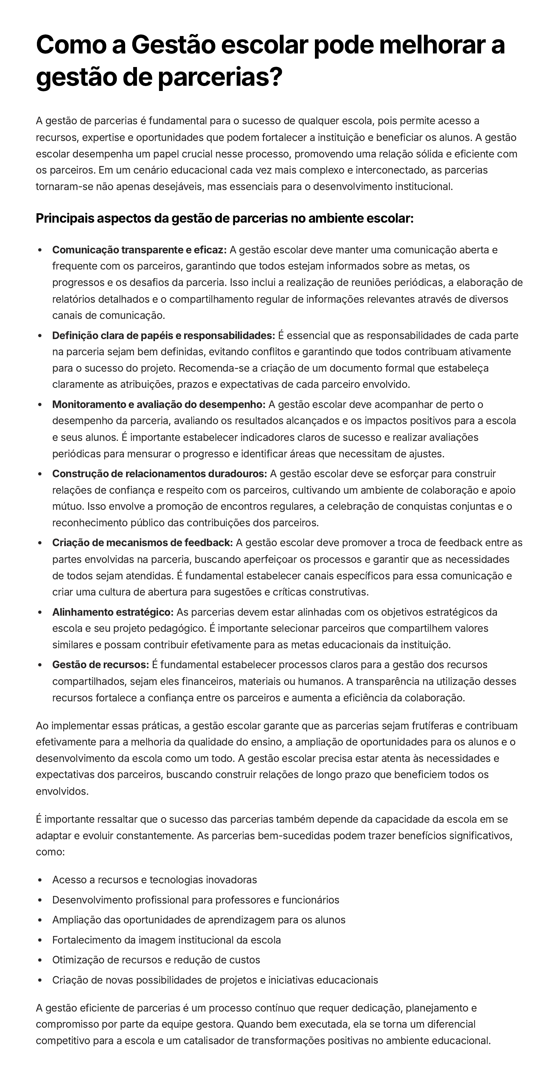 Como a Gestão escolar pode melhorar a gestão de parcerias? A gestão de parcerias é fundamental para o sucesso de qualquer escola, pois permite acesso a recursos, expertise e oportunidades que podem fortalecer a instituição e beneficiar os alunos. A gestão escolar desempenha um papel crucial nesse processo, promovendo uma relação sólida e eficiente com os parceiros. Em um cenário educacional cada vez mais complexo e interconectado, as parcerias tornaram-se não apenas desejáveis, mas essenciais para o desenvolvimento institucional. Principais aspectos da gestão de parcerias no ambiente escolar: Comunicação transparente e eficaz: A gestão escolar deve manter uma comunicação aberta e frequente com os parceiros, garantindo que todos estejam informados sobre as metas, os progressos e os desafios da parceria. Isso inclui a realização de reuniões periódicas, a elaboração de relatórios detalhados e o compartilhamento regular de informações relevantes através de diversos canais de comunicação. Definição clara de papéis e responsabilidades: É essencial que as responsabilidades de cada parte na parceria sejam bem definidas, evitando conflitos e garantindo que todos contribuam ativamente para o sucesso do projeto. Recomenda-se a criação de um documento formal que estabeleça claramente as atribuições, prazos e expectativas de cada parceiro envolvido. Monitoramento e avaliação do desempenho: A gestão escolar deve acompanhar de perto o desempenho da parceria, avaliando os resultados alcançados e os impactos positivos para a escola e seus alunos. É importante estabelecer indicadores claros de sucesso e realizar avaliações periódicas para mensurar o progresso e identificar áreas que necessitam de ajustes. Construção de relacionamentos duradouros: A gestão escolar deve se esforçar para construir relações de confiança e respeito com os parceiros, cultivando um ambiente de colaboração e apoio mútuo. Isso envolve a promoção de encontros regulares, a celebração de conquistas conjuntas e o reconhecimento público das contribuições dos parceiros. Criação de mecanismos de feedback: A gestão escolar deve promover a troca de feedback entre as partes envolvidas na parceria, buscando aperfeiçoar os processos e garantir que as necessidades de todos sejam atendidas. É fundamental estabelecer canais específicos para essa comunicação e criar uma cultura de abertura para sugestões e críticas construtivas. Alinhamento estratégico: As parcerias devem estar alinhadas com os objetivos estratégicos da escola e seu projeto pedagógico. É importante selecionar parceiros que compartilhem valores similares e possam contribuir efetivamente para as metas educacionais da instituição. Gestão de recursos: É fundamental estabelecer processos claros para a gestão dos recursos compartilhados, sejam eles financeiros, materiais ou humanos. A transparência na utilização desses recursos fortalece a confiança entre os parceiros e aumenta a eficiência da colaboração. Ao implementar essas práticas, a gestão escolar garante que as parcerias sejam frutíferas e contribuam efetivamente para a melhoria da qualidade do ensino, a ampliação de oportunidades para os alunos e o desenvolvimento da escola como um todo. A gestão escolar precisa estar atenta às necessidades e expectativas dos parceiros, buscando construir relações de longo prazo que beneficiem todos os envolvidos. É importante ressaltar que o sucesso das parcerias também depende da capacidade da escola em se adaptar e evoluir constantemente. As parcerias bem-sucedidas podem trazer benefícios significativos, como: Acesso a recursos e tecnologias inovadoras Desenvolvimento profissional para professores e funcionários Ampliação das oportunidades de aprendizagem para os alunos Fortalecimento da imagem institucional da escola Otimização de recursos e redução de custos Criação de novas possibilidades de projetos e iniciativas educacionais A gestão eficiente de parcerias é um processo contínuo que requer dedicação, planejamento e compromisso por parte da equipe gestora. Quando bem executada, ela se torna um diferencial competitivo para a escola e um catalisador de transformações positivas no ambiente educacional.