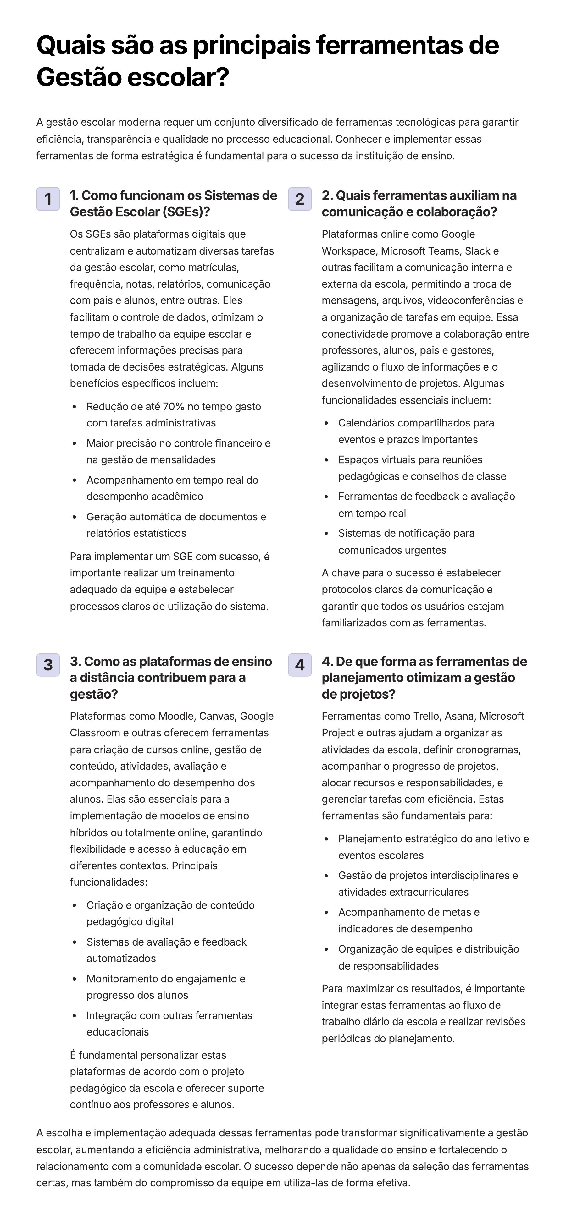 Quais são as principais ferramentas de Gestão escolar? A gestão escolar moderna requer um conjunto diversificado de ferramentas tecnológicas para garantir eficiência, transparência e qualidade no processo educacional. Conhecer e implementar essas ferramentas de forma estratégica é fundamental para o sucesso da instituição de ensino. 1 1. Como funcionam os Sistemas de Gestão Escolar (SGEs)? Os SGEs são plataformas digitais que centralizam e automatizam diversas tarefas da gestão escolar, como matrículas, frequência, notas, relatórios, comunicação com pais e alunos, entre outras. Eles facilitam o controle de dados, otimizam o tempo de trabalho da equipe escolar e oferecem informações precisas para tomada de decisões estratégicas. Alguns benefícios específicos incluem: Redução de até 70% no tempo gasto com tarefas administrativas Maior precisão no controle financeiro e na gestão de mensalidades Acompanhamento em tempo real do desempenho acadêmico Geração automática de documentos e relatórios estatísticos Para implementar um SGE com sucesso, é importante realizar um treinamento adequado da equipe e estabelecer processos claros de utilização do sistema. 2 2. Quais ferramentas auxiliam na comunicação e colaboração? Plataformas online como Google Workspace, Microsoft Teams, Slack e outras facilitam a comunicação interna e externa da escola, permitindo a troca de mensagens, arquivos, videoconferências e a organização de tarefas em equipe. Essa conectividade promove a colaboração entre professores, alunos, pais e gestores, agilizando o fluxo de informações e o desenvolvimento de projetos. Algumas funcionalidades essenciais incluem: Calendários compartilhados para eventos e prazos importantes Espaços virtuais para reuniões pedagógicas e conselhos de classe Ferramentas de feedback e avaliação em tempo real Sistemas de notificação para comunicados urgentes A chave para o sucesso é estabelecer protocolos claros de comunicação e garantir que todos os usuários estejam familiarizados com as ferramentas. 3 3. Como as plataformas de ensino a distância contribuem para a gestão? Plataformas como Moodle, Canvas, Google Classroom e outras oferecem ferramentas para criação de cursos online, gestão de conteúdo, atividades, avaliação e acompanhamento do desempenho dos alunos. Elas são essenciais para a implementação de modelos de ensino híbridos ou totalmente online, garantindo flexibilidade e acesso à educação em diferentes contextos. Principais funcionalidades: Criação e organização de conteúdo pedagógico digital Sistemas de avaliação e feedback automatizados Monitoramento do engajamento e progresso dos alunos Integração com outras ferramentas educacionais É fundamental personalizar estas plataformas de acordo com o projeto pedagógico da escola e oferecer suporte contínuo aos professores e alunos. 4 4. De que forma as ferramentas de planejamento otimizam a gestão de projetos? Ferramentas como Trello, Asana, Microsoft Project e outras ajudam a organizar as atividades da escola, definir cronogramas, acompanhar o progresso de projetos, alocar recursos e responsabilidades, e gerenciar tarefas com eficiência. Estas ferramentas são fundamentais para: Planejamento estratégico do ano letivo e eventos escolares Gestão de projetos interdisciplinares e atividades extracurriculares Acompanhamento de metas e indicadores de desempenho Organização de equipes e distribuição de responsabilidades Para maximizar os resultados, é importante integrar estas ferramentas ao fluxo de trabalho diário da escola e realizar revisões periódicas do planejamento. A escolha e implementação adequada dessas ferramentas pode transformar significativamente a gestão escolar, aumentando a eficiência administrativa, melhorando a qualidade do ensino e fortalecendo o relacionamento com a comunidade escolar. O sucesso depende não apenas da seleção das ferramentas certas, mas também do compromisso da equipe em utilizá-las de forma efetiva.