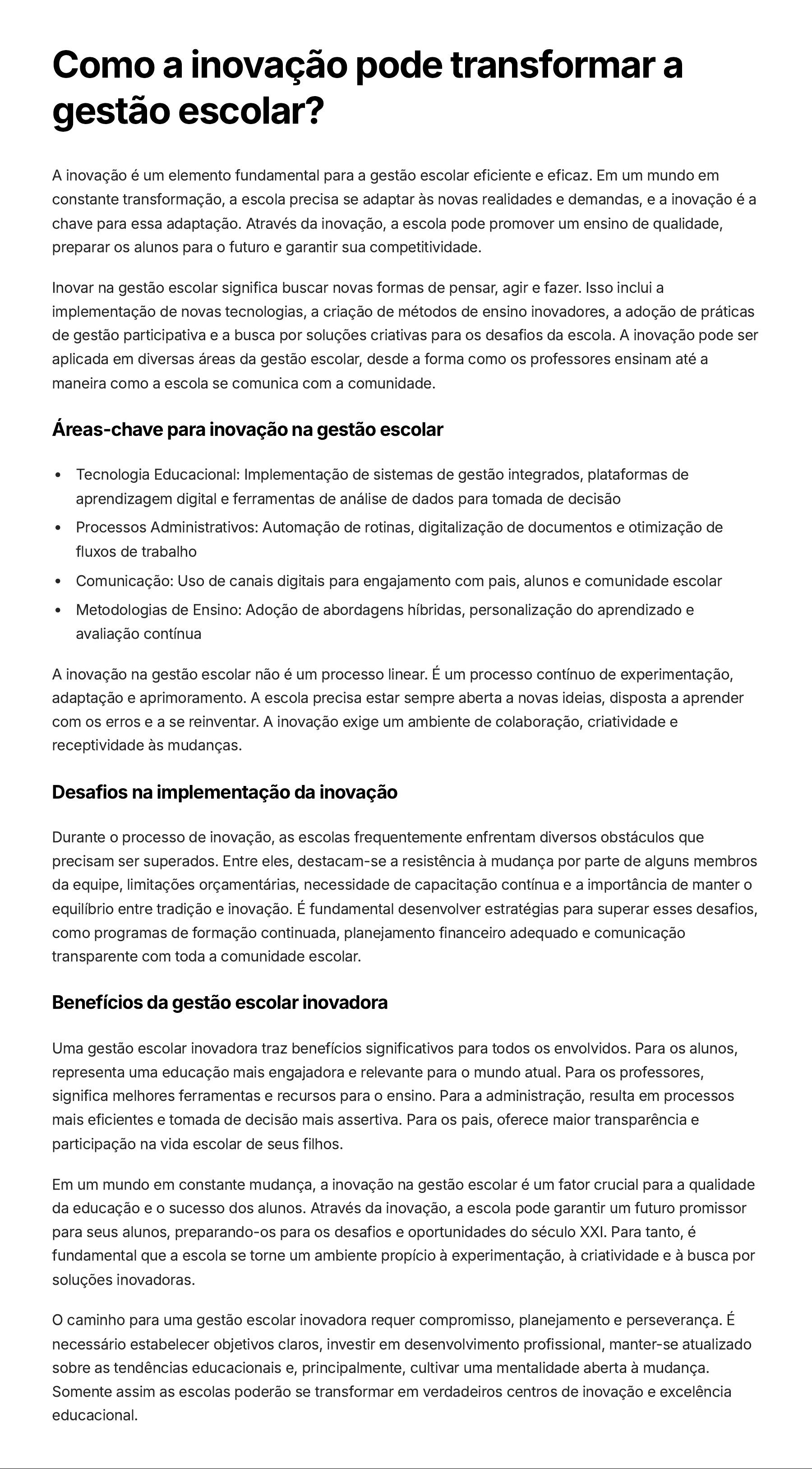 Como a inovação pode transformar a gestão escolar? A inovação é um elemento fundamental para a gestão escolar eficiente e eficaz. Em um mundo em constante transformação, a escola precisa se adaptar às novas realidades e demandas, e a inovação é a chave para essa adaptação. Através da inovação, a escola pode promover um ensino de qualidade, preparar os alunos para o futuro e garantir sua competitividade. Inovar na gestão escolar significa buscar novas formas de pensar, agir e fazer. Isso inclui a implementação de novas tecnologias, a criação de métodos de ensino inovadores, a adoção de práticas de gestão participativa e a busca por soluções criativas para os desafios da escola. A inovação pode ser aplicada em diversas áreas da gestão escolar, desde a forma como os professores ensinam até a maneira como a escola se comunica com a comunidade. Áreas-chave para inovação na gestão escolar Tecnologia Educacional: Implementação de sistemas de gestão integrados, plataformas de aprendizagem digital e ferramentas de análise de dados para tomada de decisão Processos Administrativos: Automação de rotinas, digitalização de documentos e otimização de fluxos de trabalho Comunicação: Uso de canais digitais para engajamento com pais, alunos e comunidade escolar Metodologias de Ensino: Adoção de abordagens híbridas, personalização do aprendizado e avaliação contínua A inovação na gestão escolar não é um processo linear. É um processo contínuo de experimentação, adaptação e aprimoramento. A escola precisa estar sempre aberta a novas ideias, disposta a aprender com os erros e a se reinventar. A inovação exige um ambiente de colaboração, criatividade e receptividade às mudanças. Desafios na implementação da inovação Durante o processo de inovação, as escolas frequentemente enfrentam diversos obstáculos que precisam ser superados. Entre eles, destacam-se a resistência à mudança por parte de alguns membros da equipe, limitações orçamentárias, necessidade de capacitação contínua e a importância de manter o equilíbrio entre tradição e inovação. É fundamental desenvolver estratégias para superar esses desafios, como programas de formação continuada, planejamento financeiro adequado e comunicação transparente com toda a comunidade escolar. Benefícios da gestão escolar inovadora Uma gestão escolar inovadora traz benefícios significativos para todos os envolvidos. Para os alunos, representa uma educação mais engajadora e relevante para o mundo atual. Para os professores, significa melhores ferramentas e recursos para o ensino. Para a administração, resulta em processos mais eficientes e tomada de decisão mais assertiva. Para os pais, oferece maior transparência e participação na vida escolar de seus filhos. Em um mundo em constante mudança, a inovação na gestão escolar é um fator crucial para a qualidade da educação e o sucesso dos alunos. Através da inovação, a escola pode garantir um futuro promissor para seus alunos, preparando-os para os desafios e oportunidades do século XXI. Para tanto, é fundamental que a escola se torne um ambiente propício à experimentação, à criatividade e à busca por soluções inovadoras. O caminho para uma gestão escolar inovadora requer compromisso, planejamento e perseverança. É necessário estabelecer objetivos claros, investir em desenvolvimento profissional, manter-se atualizado sobre as tendências educacionais e, principalmente, cultivar uma mentalidade aberta à mudança. Somente assim as escolas poderão se transformar em verdadeiros centros de inovação e excelência educacional.
