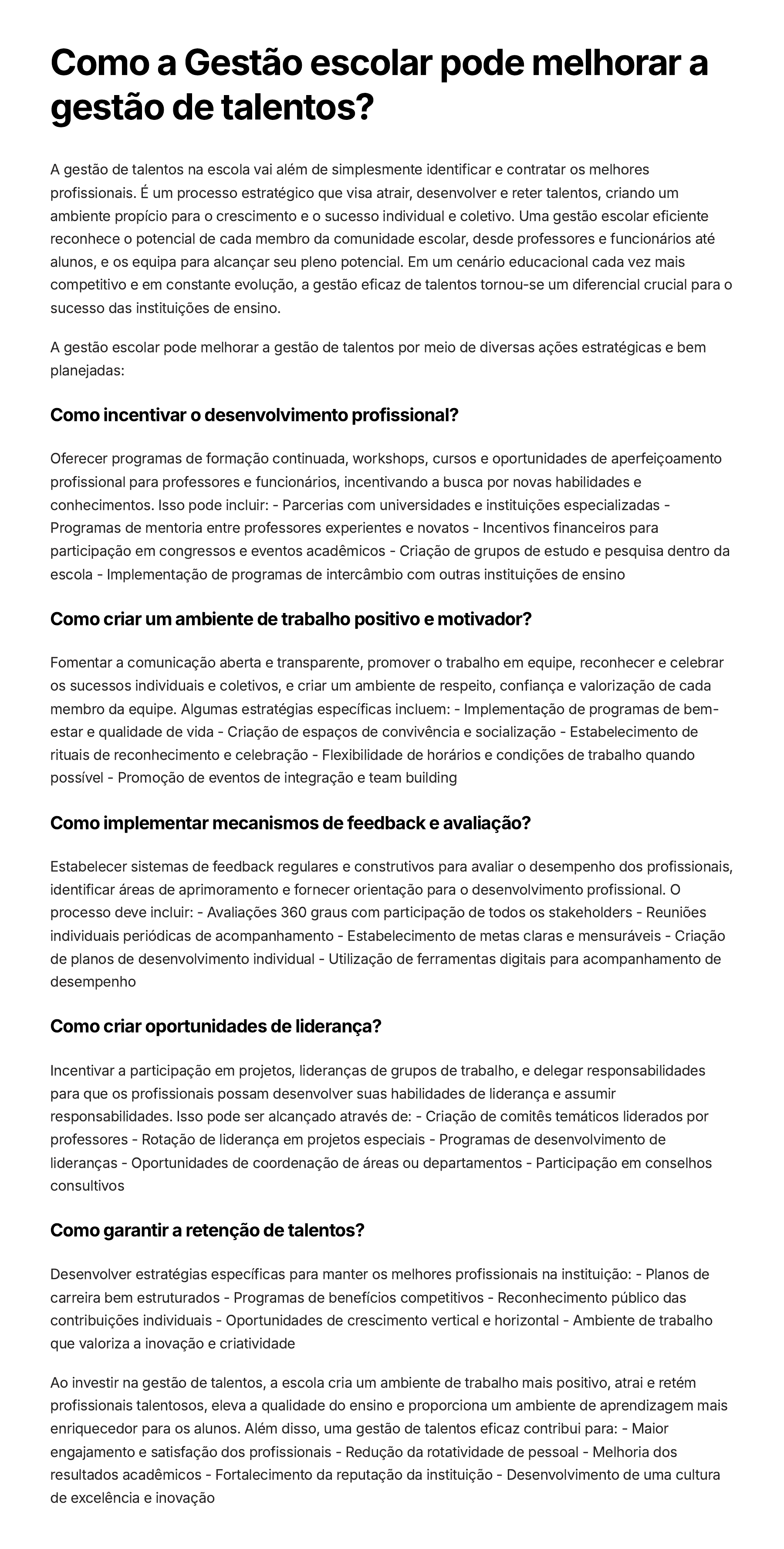 Como a Gestão escolar pode melhorar a gestão de talentos? A gestão de talentos na escola vai além de simplesmente identificar e contratar os melhores profissionais. É um processo estratégico que visa atrair, desenvolver e reter talentos, criando um ambiente propício para o crescimento e o sucesso individual e coletivo. Uma gestão escolar eficiente reconhece o potencial de cada membro da comunidade escolar, desde professores e funcionários até alunos, e os equipa para alcançar seu pleno potencial. Em um cenário educacional cada vez mais competitivo e em constante evolução, a gestão eficaz de talentos tornou-se um diferencial crucial para o sucesso das instituições de ensino. A gestão escolar pode melhorar a gestão de talentos por meio de diversas ações estratégicas e bem planejadas: Como incentivar o desenvolvimento profissional? Oferecer programas de formação continuada, workshops, cursos e oportunidades de aperfeiçoamento profissional para professores e funcionários, incentivando a busca por novas habilidades e conhecimentos. Isso pode incluir: - Parcerias com universidades e instituições especializadas - Programas de mentoria entre professores experientes e novatos - Incentivos financeiros para participação em congressos e eventos acadêmicos - Criação de grupos de estudo e pesquisa dentro da escola - Implementação de programas de intercâmbio com outras instituições de ensino Como criar um ambiente de trabalho positivo e motivador? Fomentar a comunicação aberta e transparente, promover o trabalho em equipe, reconhecer e celebrar os sucessos individuais e coletivos, e criar um ambiente de respeito, confiança e valorização de cada membro da equipe. Algumas estratégias específicas incluem: - Implementação de programas de bem- estar e qualidade de vida - Criação de espaços de convivência e socialização - Estabelecimento de rituais de reconhecimento e celebração - Flexibilidade de horários e condições de trabalho quando possível - Promoção de eventos de integração e team building Como implementar mecanismos de feedback e avaliação? Estabelecer sistemas de feedback regulares e construtivos para avaliar o desempenho dos profissionais, identificar áreas de aprimoramento e fornecer orientação para o desenvolvimento profissional. O processo deve incluir: - Avaliações 360 graus com participação de todos os stakeholders - Reuniões individuais periódicas de acompanhamento - Estabelecimento de metas claras e mensuráveis - Criação de planos de desenvolvimento individual - Utilização de ferramentas digitais para acompanhamento de desempenho Como criar oportunidades de liderança? Incentivar a participação em projetos, lideranças de grupos de trabalho, e delegar responsabilidades para que os profissionais possam desenvolver suas habilidades de liderança e assumir responsabilidades. Isso pode ser alcançado através de: - Criação de comitês temáticos liderados por professores - Rotação de liderança em projetos especiais - Programas de desenvolvimento de lideranças - Oportunidades de coordenação de áreas ou departamentos - Participação em conselhos consultivos Como garantir a retenção de talentos? Desenvolver estratégias específicas para manter os melhores profissionais na instituição: - Planos de carreira bem estruturados - Programas de benefícios competitivos - Reconhecimento público das contribuições individuais - Oportunidades de crescimento vertical e horizontal - Ambiente de trabalho que valoriza a inovação e criatividade Ao investir na gestão de talentos, a escola cria um ambiente de trabalho mais positivo, atrai e retém profissionais talentosos, eleva a qualidade do ensino e proporciona um ambiente de aprendizagem mais enriquecedor para os alunos. Além disso, uma gestão de talentos eficaz contribui para: - Maior engajamento e satisfação dos profissionais - Redução da rotatividade de pessoal - Melhoria dos resultados acadêmicos - Fortalecimento da reputação da instituição - Desenvolvimento de uma cultura de excelência e inovação