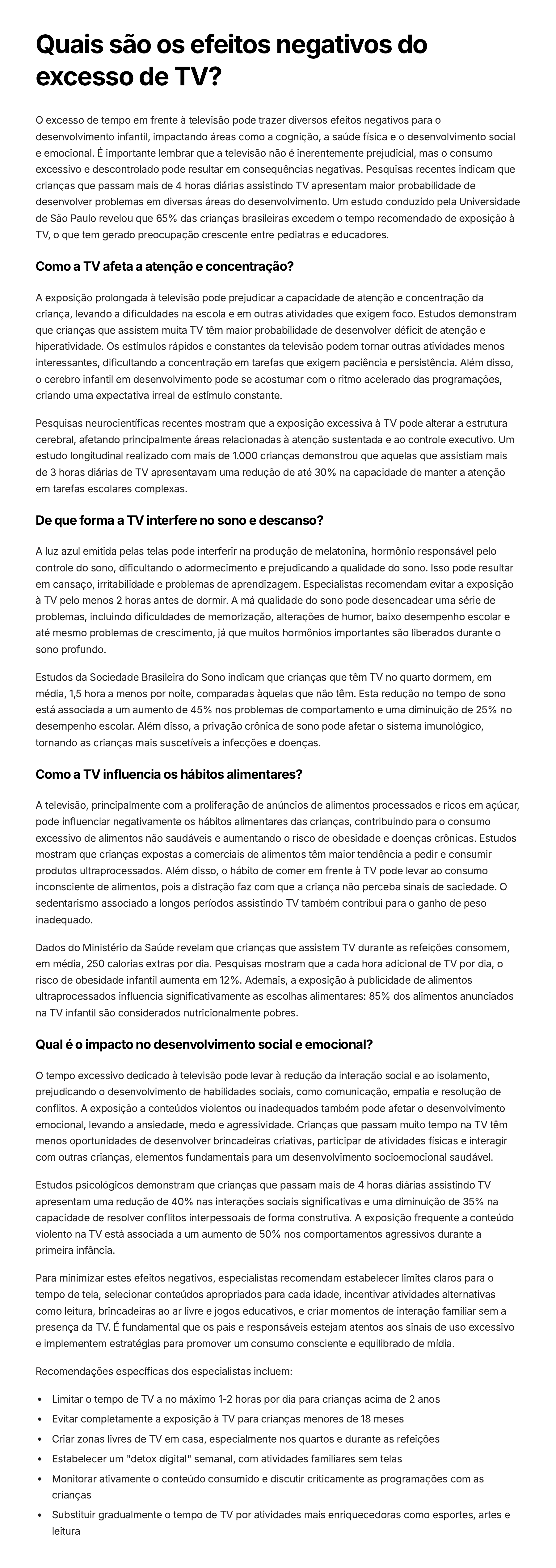 Quais são os efeitos negativos do excesso de TV? O excesso de tempo em frente à televisão pode trazer diversos efeitos negativos para o desenvolvimento infantil, impactando áreas como a cognição, a saúde física e o desenvolvimento social e emocional. É importante lembrar que a televisão não é inerentemente prejudicial, mas o consumo excessivo e descontrolado pode resultar em consequências negativas. Pesquisas recentes indicam que crianças que passam mais de 4 horas diárias assistindo TV apresentam maior probabilidade de desenvolver problemas em diversas áreas do desenvolvimento. Um estudo conduzido pela Universidade de São Paulo revelou que 65% das crianças brasileiras excedem o tempo recomendado de exposição à TV, o que tem gerado preocupação crescente entre pediatras e educadores. Como a TV afeta a atenção e concentração? A exposição prolongada à televisão pode prejudicar a capacidade de atenção e concentração da criança, levando a dificuldades na escola e em outras atividades que exigem foco. Estudos demonstram que crianças que assistem muita TV têm maior probabilidade de desenvolver déficit de atenção e hiperatividade. Os estímulos rápidos e constantes da televisão podem tornar outras atividades menos interessantes, dificultando a concentração em tarefas que exigem paciência e persistência. Além disso, o cerebro infantil em desenvolvimento pode se acostumar com o ritmo acelerado das programações, criando uma expectativa irreal de estímulo constante. Pesquisas neurocientíficas recentes mostram que a exposição excessiva à TV pode alterar a estrutura cerebral, afetando principalmente áreas relacionadas à atenção sustentada e ao controle executivo. Um estudo longitudinal realizado com mais de 1.000 crianças demonstrou que aquelas que assistiam mais de 3 horas diárias de TV apresentavam uma redução de até 30% na capacidade de manter a atenção em tarefas escolares complexas. De que forma a TV interfere no sono e descanso? A luz azul emitida pelas telas pode interferir na produção de melatonina, hormônio responsável pelo controle do sono, dificultando o adormecimento e prejudicando a qualidade do sono. Isso pode resultar em cansaço, irritabilidade e problemas de aprendizagem. Especialistas recomendam evitar a exposição à TV pelo menos 2 horas antes de dormir. A má qualidade do sono pode desencadear uma série de problemas, incluindo dificuldades de memorização, alterações de humor, baixo desempenho escolar e até mesmo problemas de crescimento, já que muitos hormônios importantes são liberados durante o sono profundo. Estudos da Sociedade Brasileira do Sono indicam que crianças que têm TV no quarto dormem, em média, 1,5 hora a menos por noite, comparadas àquelas que não têm. Esta redução no tempo de sono está associada a um aumento de 45% nos problemas de comportamento e uma diminuição de 25% no desempenho escolar. Além disso, a privação crônica de sono pode afetar o sistema imunológico, tornando as crianças mais suscetíveis a infecções e doenças. Como a TV influencia os hábitos alimentares? A televisão, principalmente com a proliferação de anúncios de alimentos processados e ricos em açúcar, pode influenciar negativamente os hábitos alimentares das crianças, contribuindo para o consumo excessivo de alimentos não saudáveis e aumentando o risco de obesidade e doenças crônicas. Estudos mostram que crianças expostas a comerciais de alimentos têm maior tendência a pedir e consumir produtos ultraprocessados. Além disso, o hábito de comer em frente à TV pode levar ao consumo inconsciente de alimentos, pois a distração faz com que a criança não perceba sinais de saciedade. O sedentarismo associado a longos períodos assistindo TV também contribui para o ganho de peso inadequado. Dados do Ministério da Saúde revelam que crianças que assistem TV durante as refeições consomem, em média, 250 calorias extras por dia. Pesquisas mostram que a cada hora adicional de TV por dia, o risco de obesidade infantil aumenta em 12%. Ademais, a exposição à publicidade de alimentos ultraprocessados influencia significativamente as escolhas alimentares: 85% dos alimentos anunciados na TV infantil são considerados nutricionalmente pobres. Qual é o impacto no desenvolvimento social e emocional? O tempo excessivo dedicado à televisão pode levar à redução da interação social e ao isolamento, prejudicando o desenvolvimento de habilidades sociais, como comunicação, empatia e resolução de conflitos. A exposição a conteúdos violentos ou inadequados também pode afetar o desenvolvimento emocional, levando a ansiedade, medo e agressividade. Crianças que passam muito tempo na TV têm menos oportunidades de desenvolver brincadeiras criativas, participar de atividades físicas e interagir com outras crianças, elementos fundamentais para um desenvolvimento socioemocional saudável. Estudos psicológicos demonstram que crianças que passam mais de 4 horas diárias assistindo TV apresentam uma redução de 40% nas interações sociais significativas e uma diminuição de 35% na capacidade de resolver conflitos interpessoais de forma construtiva. A exposição frequente a conteúdo violento na TV está associada a um aumento de 50% nos comportamentos agressivos durante a primeira infância. Para minimizar estes efeitos negativos, especialistas recomendam estabelecer limites claros para o tempo de tela, selecionar conteúdos apropriados para cada idade, incentivar atividades alternativas como leitura, brincadeiras ao ar livre e jogos educativos, e criar momentos de interação familiar sem a presença da TV. É fundamental que os pais e responsáveis estejam atentos aos sinais de uso excessivo e implementem estratégias para promover um consumo consciente e equilibrado de mídia. Recomendações específicas dos especialistas incluem: Limitar o tempo de TV a no máximo 1-2 horas por 