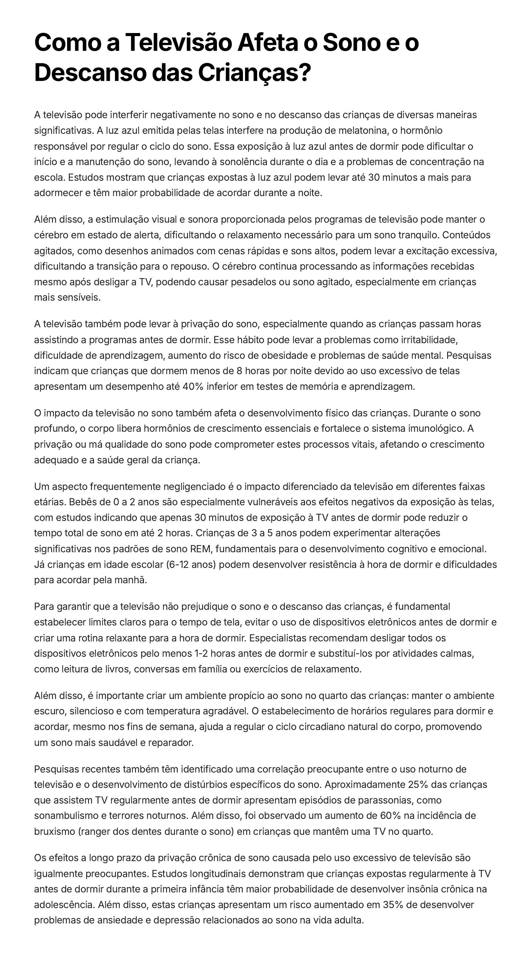 Como a Televisão Afeta o Sono e o Descanso das Crianças? A televisão pode interferir negativamente no sono e no descanso das crianças de diversas maneiras significativas. A luz azul emitida pelas telas interfere na produção de melatonina, o hormônio responsável por regular o ciclo do sono. Essa exposição à luz azul antes de dormir pode dificultar o início e a manutenção do sono, levando à sonolência durante o dia e a problemas de concentração na escola. Estudos mostram que crianças expostas à luz azul podem levar até 30 minutos a mais para adormecer e têm maior probabilidade de acordar durante a noite. Além disso, a estimulação visual e sonora proporcionada pelos programas de televisão pode manter o cérebro em estado de alerta, dificultando o relaxamento necessário para um sono tranquilo. Conteúdos agitados, como desenhos animados com cenas rápidas e sons altos, podem levar a excitação excessiva, dificultando a transição para o repouso. O cérebro continua processando as informações recebidas mesmo após desligar a TV, podendo causar pesadelos ou sono agitado, especialmente em crianças mais sensíveis. A televisão também pode levar à privação do sono, especialmente quando as crianças passam horas assistindo a programas antes de dormir. Esse hábito pode levar a problemas como irritabilidade, dificuldade de aprendizagem, aumento do risco de obesidade e problemas de saúde mental. Pesquisas indicam que crianças que dormem menos de 8 horas por noite devido ao uso excessivo de telas apresentam um desempenho até 40% inferior em testes de memória e aprendizagem. O impacto da televisão no sono também afeta o desenvolvimento físico das crianças. Durante o sono profundo, o corpo libera hormônios de crescimento essenciais e fortalece o sistema imunológico. A privação ou má qualidade do sono pode comprometer estes processos vitais, afetando o crescimento adequado e a saúde geral da criança. Um aspecto frequentemente negligenciado é o impacto diferenciado da televisão em diferentes faixas etárias. Bebês de 0 a 2 anos são especialmente vulneráveis aos efeitos negativos da exposição às telas, com estudos indicando que apenas 30 minutos de exposição à TV antes de dormir pode reduzir o tempo total de sono em até 2 horas. Crianças de 3 a 5 anos podem experimentar alterações significativas nos padrões de sono REM, fundamentais para o desenvolvimento cognitivo e emocional. Já crianças em idade escolar (6-12 anos) podem desenvolver resistência à hora de dormir e dificuldades para acordar pela manhã. Para garantir que a televisão não prejudique o sono e o descanso das crianças, é fundamental estabelecer limites claros para o tempo de tela, evitar o uso de dispositivos eletrônicos antes de dormir e criar uma rotina relaxante para a hora de dormir. Especialistas recomendam desligar todos os dispositivos eletrônicos pelo menos 1-2 horas antes de dormir e substituí-los por atividades calmas, como leitura de livros, conversas em família ou exercícios de relaxamento. Além disso, é importante criar um ambiente propício ao sono no quarto das crianças: manter o ambiente escuro, silencioso e com temperatura agradável. O estabelecimento de horários regulares para dormir e acordar, mesmo nos fins de semana, ajuda a regular o ciclo circadiano natural do corpo, promovendo um sono mais saudável e reparador. Pesquisas recentes também têm identificado uma correlação preocupante entre o uso noturno de televisão e o desenvolvimento de distúrbios específicos do sono. Aproximadamente 25% das crianças que assistem TV regularmente antes de dormir apresentam episódios de parassonias, como sonambulismo e terrores noturnos. Além disso, foi observado um aumento de 60% na incidência de bruxismo (ranger dos dentes durante o sono) em crianças que mantêm uma TV no quarto. Os efeitos a longo prazo da privação crônica de sono causada pelo uso excessivo de televisão são igualmente preocupantes. Estudos longitudinais demonstram que crianças expostas regularmente à TV antes de dormir durante a primeira infância têm maior probabilidade de desenvolver insônia crônica na adolescência. Além disso, estas crianças apresentam um risco aumentado em 35% de desenvolver problemas de ansiedade e depressão relacionados ao sono na vida adulta.