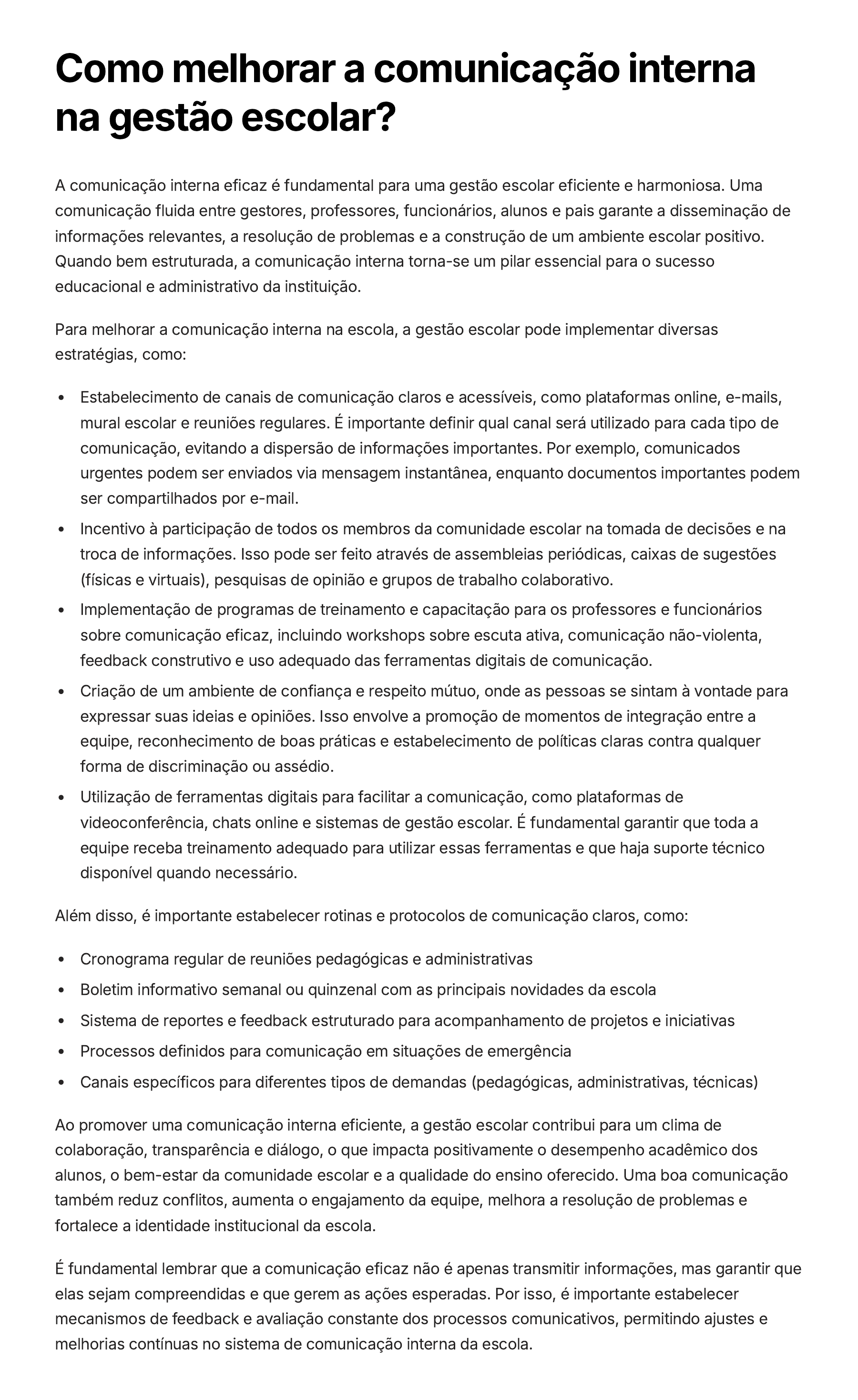 Como melhorar a comunicação interna na gestão escolar? A comunicação interna eficaz é fundamental para uma gestão escolar eficiente e harmoniosa. Uma comunicação fluida entre gestores, professores, funcionários, alunos e pais garante a disseminação de informações relevantes, a resolução de problemas e a construção de um ambiente escolar positivo. Quando bem estruturada, a comunicação interna torna-se um pilar essencial para o sucesso educacional e administrativo da instituição. Para melhorar a comunicação interna na escola, a gestão escolar pode implementar diversas estratégias, como: Estabelecimento de canais de comunicação claros e acessíveis, como plataformas online, e-mails, mural escolar e reuniões regulares. É importante definir qual canal será utilizado para cada tipo de comunicação, evitando a dispersão de informações importantes. Por exemplo, comunicados urgentes podem ser enviados via mensagem instantânea, enquanto documentos importantes podem ser compartilhados por e-mail. Incentivo à participação de todos os membros da comunidade escolar na tomada de decisões e na troca de informações. Isso pode ser feito através de assembleias periódicas, caixas de sugestões (físicas e virtuais), pesquisas de opinião e grupos de trabalho colaborativo. Implementação de programas de treinamento e capacitação para os professores e funcionários sobre comunicação eficaz, incluindo workshops sobre escuta ativa, comunicação não-violenta, feedback construtivo e uso adequado das ferramentas digitais de comunicação. Criação de um ambiente de confiança e respeito mútuo, onde as pessoas se sintam à vontade para expressar suas ideias e opiniões. Isso envolve a promoção de momentos de integração entre a equipe, reconhecimento de boas práticas e estabelecimento de políticas claras contra qualquer forma de discriminação ou assédio. Utilização de ferramentas digitais para facilitar a comunicação, como plataformas de videoconferência, chats online e sistemas de gestão escolar. É fundamental garantir que toda a equipe receba treinamento adequado para utilizar essas ferramentas e que haja suporte técnico disponível quando necessário. Além disso, é importante estabelecer rotinas e protocolos de comunicação claros, como: Cronograma regular de reuniões pedagógicas e administrativas Boletim informativo semanal ou quinzenal com as principais novidades da escola Sistema de reportes e feedback estruturado para acompanhamento de projetos e iniciativas Processos definidos para comunicação em situações de emergência Canais específicos para diferentes tipos de demandas (pedagógicas, administrativas, técnicas) Ao promover uma comunicação interna eficiente, a gestão escolar contribui para um clima de colaboração, transparência e diálogo, o que impacta positivamente o desempenho acadêmico dos alunos, o bem-estar da comunidade escolar e a qualidade do ensino oferecido. Uma boa comunicação também reduz conflitos, aumenta o engajamento da equipe, melhora a resolução de problemas e fortalece a identidade institucional da escola. É fundamental lembrar que a comunicação eficaz não é apenas transmitir informações, mas garantir que elas sejam compreendidas e que gerem as ações esperadas. Por isso, é importante estabelecer mecanismos de feedback e avaliação constante dos processos comunicativos, permitindo ajustes e melhorias contínuas no sistema de comunicação interna da escola.