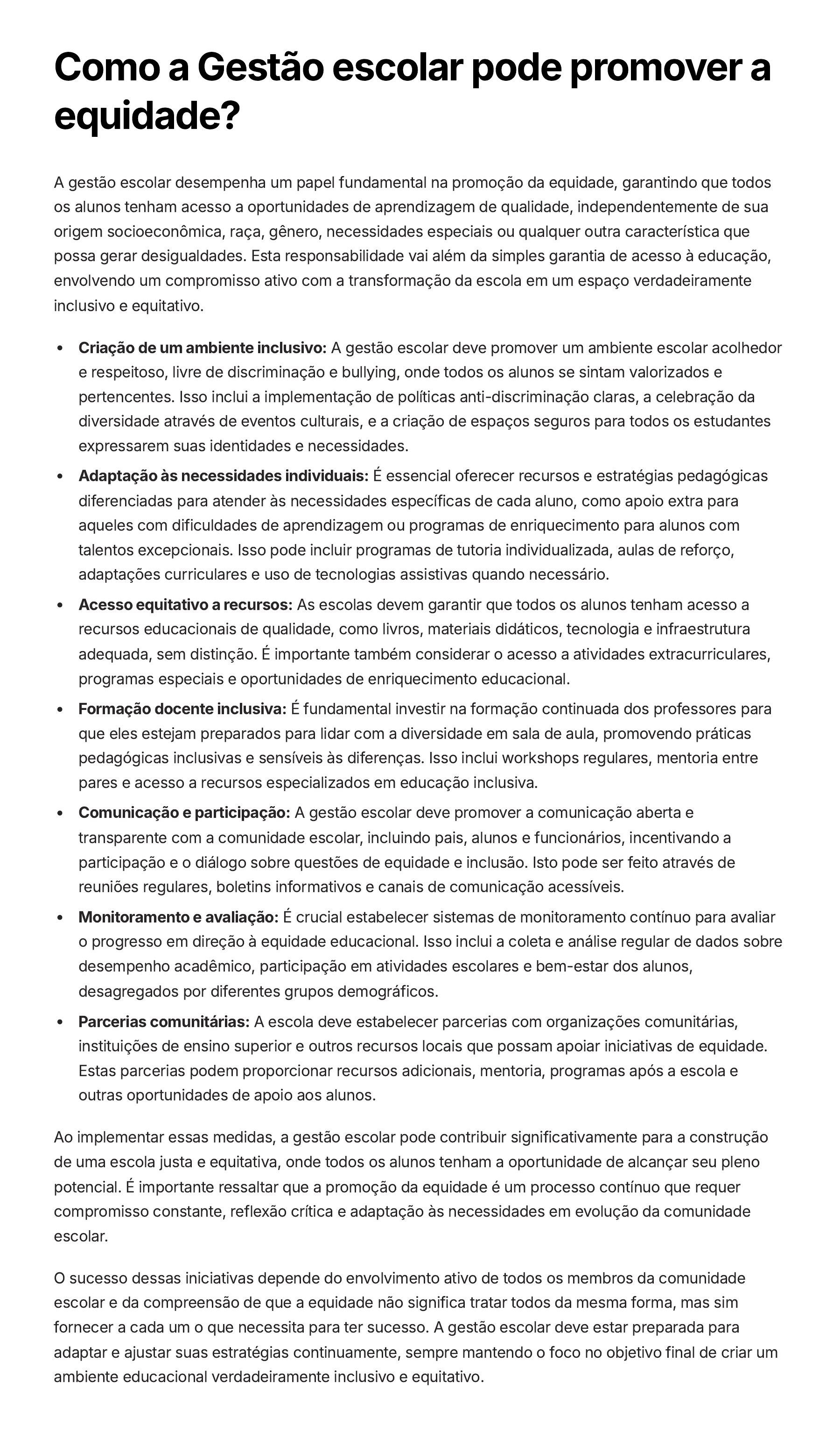 Como a Gestão escolar pode promover a equidade? A gestão escolar desempenha um papel fundamental na promoção da equidade, garantindo que todos os alunos tenham acesso a oportunidades de aprendizagem de qualidade, independentemente de sua origem socioeconômica, raça, gênero, necessidades especiais ou qualquer outra característica que possa gerar desigualdades. Esta responsabilidade vai além da simples garantia de acesso à educação, envolvendo um compromisso ativo com a transformação da escola em um espaço verdadeiramente inclusivo e equitativo. Criação de um ambiente inclusivo: A gestão escolar deve promover um ambiente escolar acolhedor e respeitoso, livre de discriminação e bullying, onde todos os alunos se sintam valorizados e pertencentes. Isso inclui a implementação de políticas anti-discriminação claras, a celebração da diversidade através de eventos culturais, e a criação de espaços seguros para todos os estudantes expressarem suas identidades e necessidades. Adaptação às necessidades individuais: É essencial oferecer recursos e estratégias pedagógicas diferenciadas para atender às necessidades específicas de cada aluno, como apoio extra para aqueles com dificuldades de aprendizagem ou programas de enriquecimento para alunos com talentos excepcionais. Isso pode incluir programas de tutoria individualizada, aulas de reforço, adaptações curriculares e uso de tecnologias assistivas quando necessário. Acesso equitativo a recursos: As escolas devem garantir que todos os alunos tenham acesso a recursos educacionais de qualidade, como livros, materiais didáticos, tecnologia e infraestrutura adequada, sem distinção. É importante também considerar o acesso a atividades extracurriculares, programas especiais e oportunidades de enriquecimento educacional. Formação docente inclusiva: É fundamental investir na formação continuada dos professores para que eles estejam preparados para lidar com a diversidade em sala de aula, promovendo práticas pedagógicas inclusivas e sensíveis às diferenças. Isso inclui workshops regulares, mentoria entre pares e acesso a recursos especializados em educação inclusiva. Comunicação e participação: A gestão escolar deve promover a comunicação aberta e transparente com a comunidade escolar, incluindo pais, alunos e funcionários, incentivando a participação e o diálogo sobre questões de equidade e inclusão. Isto pode ser feito através de reuniões regulares, boletins informativos e canais de comunicação acessíveis. Monitoramento e avaliação: É crucial estabelecer sistemas de monitoramento contínuo para avaliar o progresso em direção à equidade educacional. Isso inclui a coleta e análise regular de dados sobre desempenho acadêmico, participação em atividades escolares e bem-estar dos alunos, desagregados por diferentes grupos demográficos. Parcerias comunitárias: A escola deve estabelecer parcerias com organizações comunitárias, instituições de ensino superior e outros recursos locais que possam apoiar iniciativas de equidade. Estas parcerias podem proporcionar recursos adicionais, mentoria, programas após a escola e outras oportunidades de apoio aos alunos. Ao implementar essas medidas, a gestão escolar pode contribuir significativamente para a construção de uma escola justa e equitativa, onde todos os alunos tenham a oportunidade de alcançar seu pleno potencial. É importante ressaltar que a promoção da equidade é um processo contínuo que requer compromisso constante, reflexão crítica e adaptação às necessidades em evolução da comunidade escolar. O sucesso dessas iniciativas depende do envolvimento ativo de todos os membros da comunidade escolar e da compreensão de que a equidade não significa tratar todos da mesma forma, mas sim fornecer a cada um o que necessita para ter sucesso. A gestão escolar deve estar preparada para adaptar e ajustar suas estratégias continuamente, sempre mantendo o foco no objetivo final de criar um ambiente educacional verdadeiramente inclusivo e equitativo.