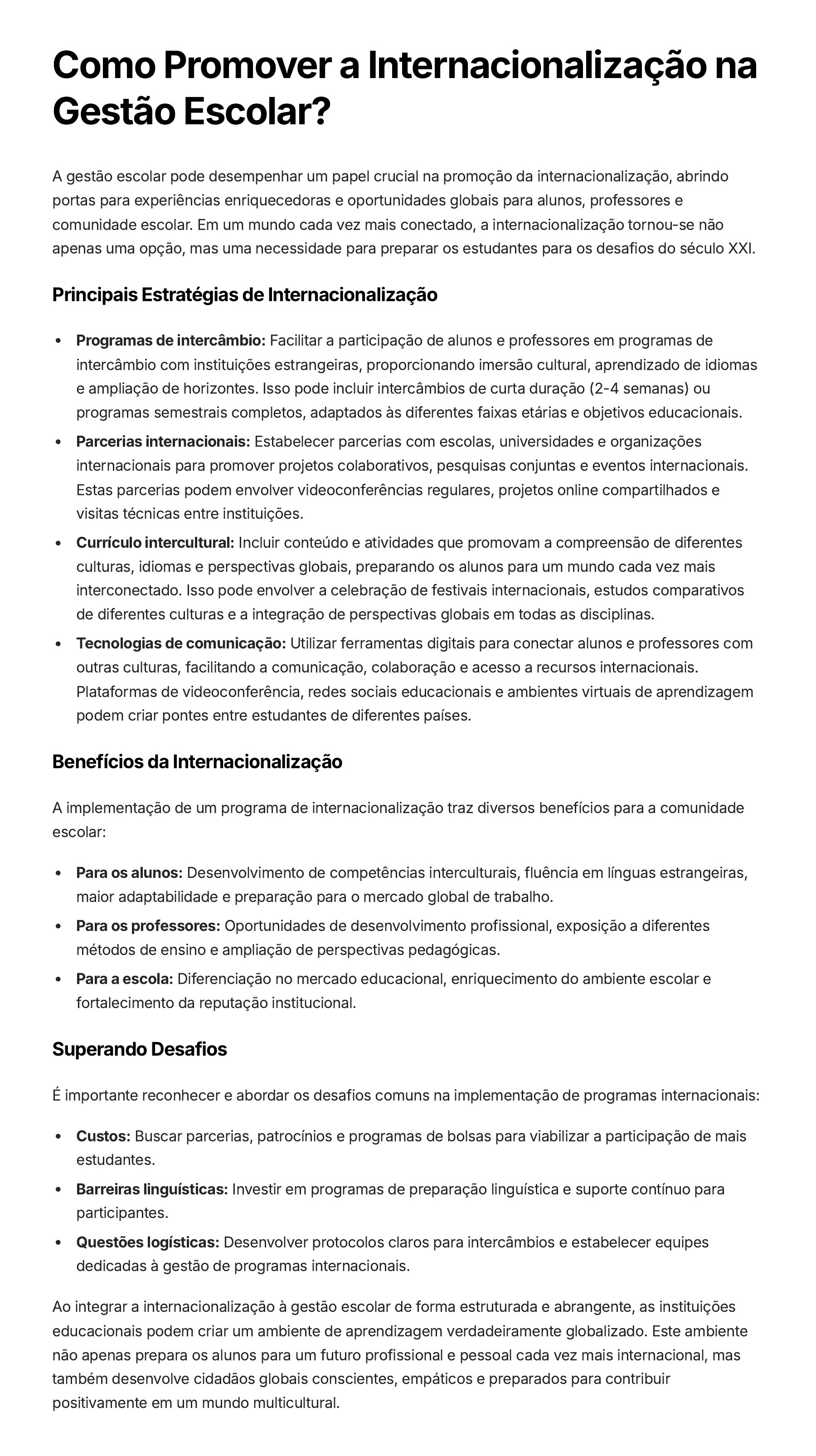 Como Promover a Internacionalização na Gestão Escolar? A gestão escolar pode desempenhar um papel crucial na promoção da internacionalização, abrindo portas para experiências enriquecedoras e oportunidades globais para alunos, professores e comunidade escolar. Em um mundo cada vez mais conectado, a internacionalização tornou-se não apenas uma opção, mas uma necessidade para preparar os estudantes para os desafios do século XXI. Principais Estratégias de Internacionalização Programas de intercâmbio: Facilitar a participação de alunos e professores em programas de intercâmbio com instituições estrangeiras, proporcionando imersão cultural, aprendizado de idiomas e ampliação de horizontes. Isso pode incluir intercâmbios de curta duração (2-4 semanas) ou programas semestrais completos, adaptados às diferentes faixas etárias e objetivos educacionais. Parcerias internacionais: Estabelecer parcerias com escolas, universidades e organizações internacionais para promover projetos colaborativos, pesquisas conjuntas e eventos internacionais. Estas parcerias podem envolver videoconferências regulares, projetos online compartilhados e visitas técnicas entre instituições. Currículo intercultural: Incluir conteúdo e atividades que promovam a compreensão de diferentes culturas, idiomas e perspectivas globais, preparando os alunos para um mundo cada vez mais interconectado. Isso pode envolver a celebração de festivais internacionais, estudos comparativos de diferentes culturas e a integração de perspectivas globais em todas as disciplinas. Tecnologias de comunicação: Utilizar ferramentas digitais para conectar alunos e professores com outras culturas, facilitando a comunicação, colaboração e acesso a recursos internacionais. Plataformas de videoconferência, redes sociais educacionais e ambientes virtuais de aprendizagem podem criar pontes entre estudantes de diferentes países. Benefícios da Internacionalização A implementação de um programa de internacionalização traz diversos benefícios para a comunidade escolar: Para os alunos: Desenvolvimento de competências interculturais, fluência em línguas estrangeiras, maior adaptabilidade e preparação para o mercado global de trabalho. Para os professores: Oportunidades de desenvolvimento profissional, exposição a diferentes métodos de ensino e ampliação de perspectivas pedagógicas. Para a escola: Diferenciação no mercado educacional, enriquecimento do ambiente escolar e fortalecimento da reputação institucional. Superando Desafios É importante reconhecer e abordar os desafios comuns na implementação de programas internacionais: Custos: Buscar parcerias, patrocínios e programas de bolsas para viabilizar a participação de mais estudantes. Barreiras linguísticas: Investir em programas de preparação linguística e suporte contínuo para participantes. Questões logísticas: Desenvolver protocolos claros para intercâmbios e estabelecer equipes dedicadas à gestão de programas internacionais. Ao integrar a internacionalização à gestão escolar de forma estruturada e abrangente, as instituições educacionais podem criar um ambiente de aprendizagem verdadeiramente globalizado. Este ambiente não apenas prepara os alunos para um futuro profissional e pessoal cada vez mais internacional, mas também desenvolve cidadãos globais conscientes, empáticos e preparados para contribuir positivamente em um mundo multicultural.
