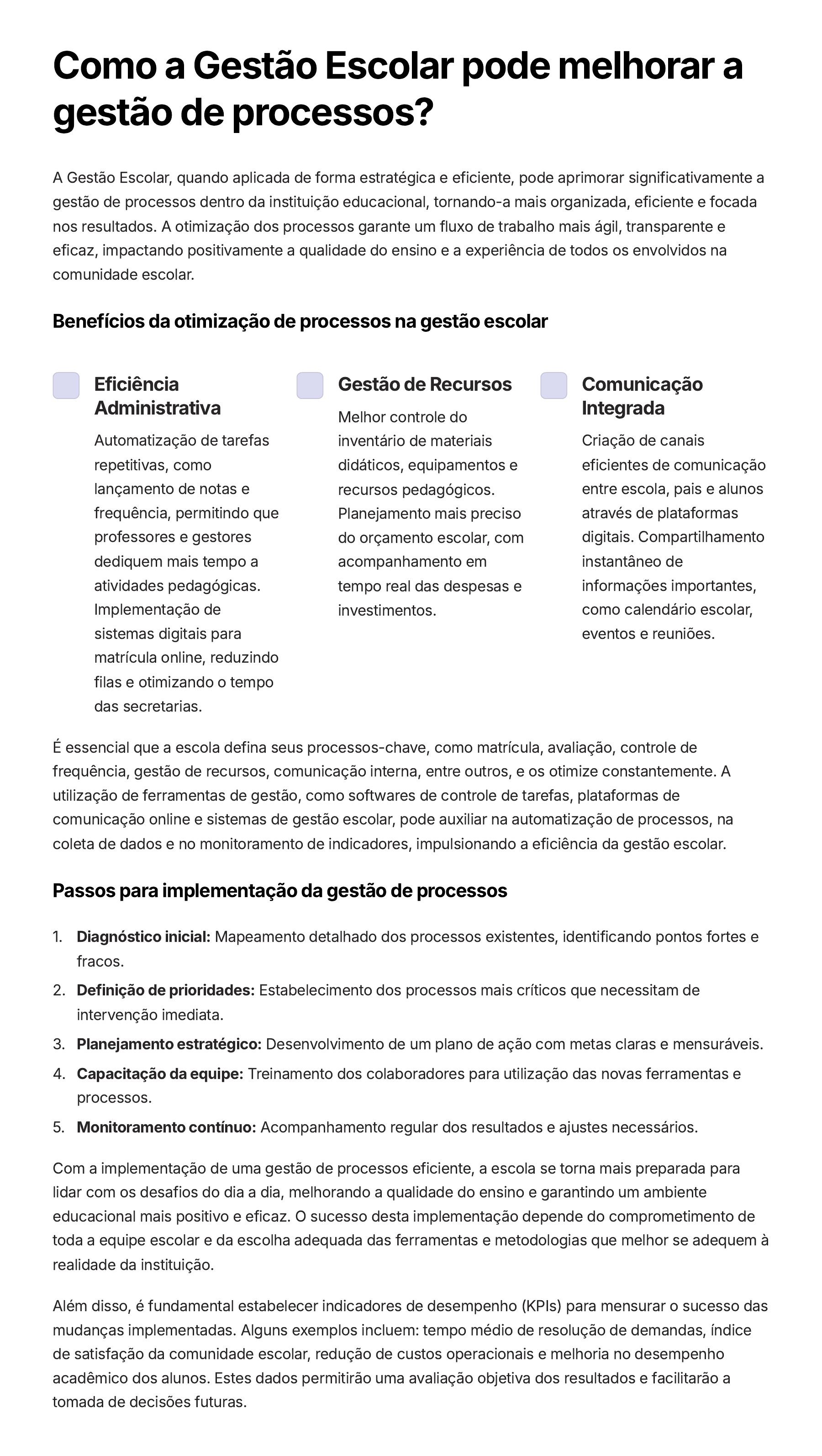 Como a Gestão Escolar pode melhorar a gestão de processos? A Gestão Escolar, quando aplicada de forma estratégica e eficiente, pode aprimorar significativamente a gestão de processos dentro da instituição educacional, tornando-a mais organizada, eficiente e focada nos resultados. A otimização dos processos garante um fluxo de trabalho mais ágil, transparente e eficaz, impactando positivamente a qualidade do ensino e a experiência de todos os envolvidos na comunidade escolar. Benefícios da otimização de processos na gestão escolar Eficiência Administrativa Automatização de tarefas repetitivas, como lançamento de notas e frequência, permitindo que professores e gestores dediquem mais tempo a atividades pedagógicas. Implementação de sistemas digitais para matrícula online, reduzindo filas e otimizando o tempo das secretarias. Gestão de Recursos Melhor controle do inventário de materiais didáticos, equipamentos e recursos pedagógicos. Planejamento mais preciso do orçamento escolar, com acompanhamento em tempo real das despesas e investimentos. Comunicação Integrada Criação de canais eficientes de comunicação entre escola, pais e alunos através de plataformas digitais. Compartilhamento instantâneo de informações importantes, como calendário escolar, eventos e reuniões. É essencial que a escola defina seus processos-chave, como matrícula, avaliação, controle de frequência, gestão de recursos, comunicação interna, entre outros, e os otimize constantemente. A utilização de ferramentas de gestão, como softwares de controle de tarefas, plataformas de comunicação online e sistemas de gestão escolar, pode auxiliar na automatização de processos, na coleta de dados e no monitoramento de indicadores, impulsionando a eficiência da gestão escolar. Passos para implementação da gestão de processos Diagnóstico inicial: Mapeamento detalhado dos processos existentes, identificando pontos fortes e fracos. 1. Definição de prioridades: Estabelecimento dos processos mais críticos que necessitam de intervenção imediata. 2. Planejamento estratégico: Desenvolvimento de um plano de ação com metas claras e mensuráveis.3. Capacitação da equipe: Treinamento dos colaboradores para utilização das novas ferramentas e processos. 4. Monitoramento contínuo: Acompanhamento regular dos resultados e ajustes necessários.5. Com a implementação de uma gestão de processos eficiente, a escola se torna mais preparada para lidar com os desafios do dia a dia, melhorando a qualidade do ensino e garantindo um ambiente educacional mais positivo e eficaz. O sucesso desta implementação depende do comprometimento de toda a equipe escolar e da escolha adequada das ferramentas e metodologias que melhor se adequem à realidade da instituição. Além disso, é fundamental estabelecer indicadores de desempenho (KPIs) para mensurar o sucesso das mudanças implementadas. Alguns exemplos incluem: tempo médio de resolução de demandas, índice de satisfação da comunidade escolar, redução de custos operacionais e melhoria no desempenho acadêmico dos alunos. Estes dados permitirão uma avaliação objetiva dos resultados e facilitarão a tomada de decisões futuras.