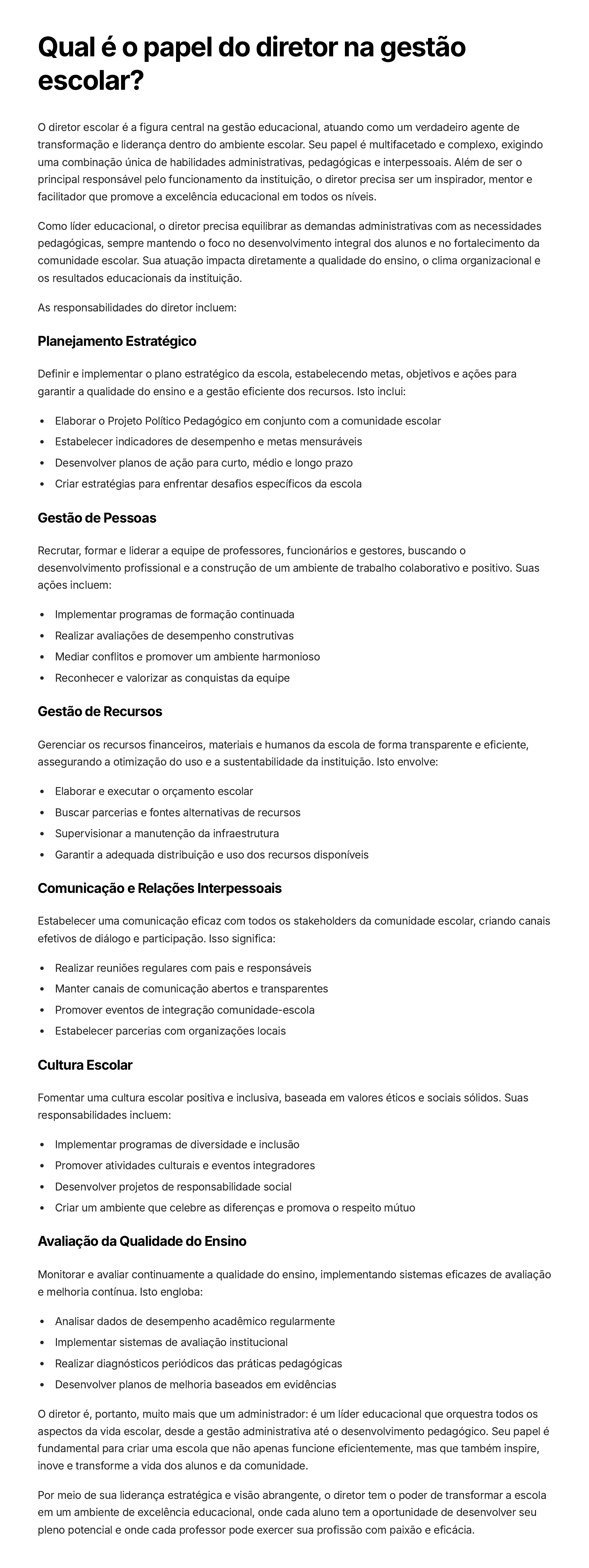 Qual é o papel do diretor na gestão escolar? O diretor escolar é a figura central na gestão educacional, atuando como um verdadeiro agente de transformação e liderança dentro do ambiente escolar. Seu papel é multifacetado e complexo, exigindo uma combinação única de habilidades administrativas, pedagógicas e interpessoais. Além de ser o principal responsável pelo funcionamento da instituição, o diretor precisa ser um inspirador, mentor e facilitador que promove a excelência educacional em todos os níveis. Como líder educacional, o diretor precisa equilibrar as demandas administrativas com as necessidades pedagógicas, sempre mantendo o foco no desenvolvimento integral dos alunos e no fortalecimento da comunidade escolar. Sua atuação impacta diretamente a qualidade do ensino, o clima organizacional e os resultados educacionais da instituição. As responsabilidades do diretor incluem: Planejamento Estratégico Definir e implementar o plano estratégico da escola, estabelecendo metas, objetivos e ações para garantir a qualidade do ensino e a gestão eficiente dos recursos. Isto inclui: Elaborar o Projeto Político Pedagógico em conjunto com a comunidade escolar Estabelecer indicadores de desempenho e metas mensuráveis Desenvolver planos de ação para curto, médio e longo prazo Criar estratégias para enfrentar desafios específicos da escola Gestão de Pessoas Recrutar, formar e liderar a equipe de professores, funcionários e gestores, buscando o desenvolvimento profissional e a construção de um ambiente de trabalho colaborativo e positivo. Suas ações incluem: Implementar programas de formação continuada Realizar avaliações de desempenho construtivas Mediar conflitos e promover um ambiente harmonioso Reconhecer e valorizar as conquistas da equipe Gestão de Recursos Gerenciar os recursos financeiros, materiais e humanos da escola de forma transparente e eficiente, assegurando a otimização do uso e a sustentabilidade da instituição. Isto envolve: Elaborar e executar o orçamento escolar Buscar parcerias e fontes alternativas de recursos Supervisionar a manutenção da infraestrutura Garantir a adequada distribuição e uso dos recursos disponíveis Comunicação e Relações Interpessoais Estabelecer uma comunicação eficaz com todos os stakeholders da comunidade escolar, criando canais efetivos de diálogo e participação. Isso significa: Realizar reuniões regulares com pais e responsáveis Manter canais de comunicação abertos e transparentes Promover eventos de integração comunidade-escola Estabelecer parcerias com organizações locais Cultura Escolar Fomentar uma cultura escolar positiva e inclusiva, baseada em valores éticos e sociais sólidos. Suas responsabilidades incluem: Implementar programas de diversidade e inclusão Promover atividades culturais e eventos integradores Desenvolver projetos de responsabilidade social Criar um ambiente que celebre as diferenças e promova o respeito mútuo Avaliação da Qualidade do Ensino Monitorar e avaliar continuamente a qualidade do ensino, implementando sistemas eficazes de avaliação e melhoria contínua. Isto engloba: Analisar dados de desempenho acadêmico regularmente Implementar sistemas de avaliação institucional Realizar diagnósticos periódicos das práticas pedagógicas Desenvolver planos de melhoria baseados em evidências O diretor é, portanto, muito mais que um administrador: é um líder educacional que orquestra todos os aspectos da vida escolar, desde a gestão administrativa até o desenvolvimento pedagógico. Seu papel é fundamental para criar uma escola que não apenas funcione eficientemente, mas que também inspire, inove e transforme a vida dos alunos e da comunidade. Por meio de sua liderança estratégica e visão abrangente, o diretor tem o poder de transformar a escola em um ambiente de excelência educacional, onde cada aluno tem a oportunidade de desenvolver seu pleno potencial e onde cada professor pode exercer sua profissão com paixão e eficácia.