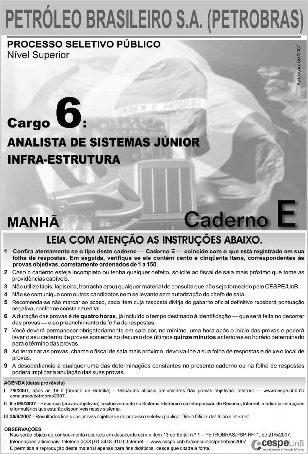 UnB/CESPE – PETROBRAS Caderno E Cargo 6: Analista de Sistemas Júnior – Infra-estrutura – 1 – De acordo com o comando a que cada um dos itens de 1 a 150 se refira, marque, na folha de respostas, para cada item: o campo designado com o código C, caso julgue o item CERTO; ou o campo designado com o código E, caso julgue o item ERRADO. A ausência de marcação ou a marcação de ambos os campos não serão apenadas, ou seja, não receberão pontuação negativa. Para as devidas marcações, use a folha de respostas, único documento válido para a correção das suas provas. CONHECIMENTOS BÁSICOS O aumento do controle e do uso, por parte do1 homem, da energia contida nos combustíveis fósseis, abundantes e baratos, foi determinante para as transformações econômicas, sociais, tecnológicas — e4 infelizmente ambientais — que vêm ocorrendo desde a Revolução Industrial. Dentre as conseqüências ambientais do processo de7 industrialização e do inerente e progressivo consumo de combustíveis fósseis — leia-se energia —, destaca-se o aumento da contaminação do ar por gases e material10 particulado provenientes justamente da queima desses combustíveis. Cabe lembrar que o efeito estufa existe na Terra13 independentemente da ação do homem. É importante que este fenômeno não seja visto como um problema: sem o efeito estufa, o Sol não conseguiria aquecer a Terra o16 suficiente para que ela fosse habitável. Portanto o problema não é o efeito estufa, mas, sim, sua intensificação. A mudança climática coloca em questão os padrões19 de produção e consumo hoje vigentes. Atualmente fala-se muito em descarbonizar a matriz energética mundial, isto é, em aumentar a participação das energias renováveis em22 detrimento de combustíveis fósseis. Isto seria uma condição necessária mas não suficiente para a atenuação da mudança do clima, que depende também de outras mudanças na infra-25 estrutura, na tecnologia e na economia. André Santos Pereira. Mudança climática e energias renováveis. (com adaptações). Julgue os seguintes itens, a respeito do texto acima. 1 Para demonstrar sua tese, o autor indica haver mais conseqüências ambientais do processo de industrialização do que aquelas que enumera. 2 Preservam-se a correção gramatical e a coerência textual ao se empregar “as transformações econômicas, sociais, tecnológicas — e infelizmente ambientais” (R.3-5) no singular. 3 Na linha 9, a oração entre travessões “leia-se energia” explica como deve ser entendida a expressão “combustíveis fósseis”, e a vírgula após o segundo travessão é empregada para se destacar uma circunstância deslocada para o início do período. 4 Nos processos de coesão textual, a expressão “este fenômeno” (R.15) retoma a idéia de “aumento da contaminação do ar por gases e material particulado” (R.10-11). 5 Preservam-se a coerência da argumentação e a correção gramatical do texto ao se substituir “que este fenômeno não seja” (R.14-15) por este fenômeno não ser. 6 Ficam preservadas a coerência textual e a correção gramatical do texto, ao se substituir o sinal de dois-pontos depois de “problema” (R.15) pela conjunção pois, precedida e seguida de vírgula. 7 A mudança de posição do pronome átono em “fala-se” (R.20) para antes do verbo desrespeitaria as regras de colocação pronominal da norma culta brasileira. 8 A presença da preposição no termo “em aumentar” (R.22) é gramaticalmente opcional, mas tem a função de evitar ambigüidade por marcar a relação de paralelismo entre as idéias introduzidas por “descarbonizar” (R.21) e “aumentar” (R.22). Após os dois choques de preços do petróleo,1 problemas ligados ao desequilíbrio do balanço de pagamentos e à garantia do suprimento de energia levaram à formulação de uma política energética cujos objetivos4 centrais eram a conservação da energia, o aumento da produção nacional de petróleo e de eletricidade e a substituição de derivados de petróleo por fontes alternativas7 nacionais (energia hidrelétrica, biomassa, carvão mineral etc.). Os instrumentos utilizados foram a política de preços de energia, a política tecnológica e a política de incentivos e10 subsídios, além de medidas de restrição ao consumo através do estabelecimento de quotas às empresas do setor industrial. Comissão interministerial para a preparação da conferência das Nações Unidas sobre meio ambiente e desenvolvimento (CIMA). O desafio do desenvolvimento sustentável. Secretaria de Imprensa. Presidência da República, dez. de 1991 (com adaptações). Tomando por base a organização do texto acima, julgue os itens subseqüentes. 9 Depreende-se das idéias do texto que “os dois choques de preços do petróleo” (R.1) provocaram preocupação com a escassez de energia. 10 O emprego do sinal de crase em “à garantia” (R.3) e “à formulação” (R.4) indica que são dois os complementos de “ligados” (R.2). 11 Mantêm-se a correção gramatical e a mesma relação significativa entre “política energética” (R.4) e “objetivos centrais” (R.4-5) ao se substituir o pronome “cujos” (R.4) por que os. 12 No trecho “o aumento (...) a substituição” (R.5-7), a repetição da conjunção “e” indica que “petróleo” e “eletricidade” estão ligados, na enumeração, ao termo “aumento da produção”, que se liga ao seguinte, iniciado por “a substituição”. 13 A inserção do sinal de dois-pontos depois de “foram” (R.9) preservaria a correção gramatical e a coerência textual. UnB/CESPE – PETROBRAS Caderno E Cargo 6: Analista de Sistemas Júnior – Infra-estrutura – 2 – Anderson Araújo. In: Correio Braziliense, 6/7/2007, p. 20 (com adaptações). Compare as informações da figura acima e julgue os seguintes itens. 14 Depreende-se das informações na coluna “A embaixada do etanol” que, 