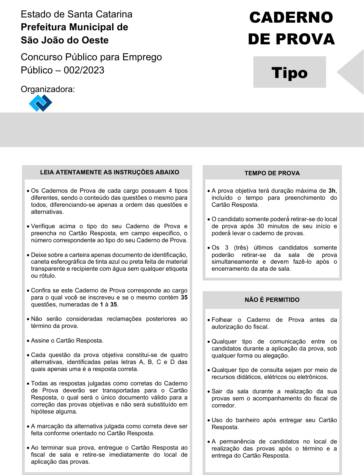 LEIA ATENTAMENTE AS INSTRUÇÕES ABAIXO TEMPO DE PROVA • Os Cadernos de Prova de cada cargo possuem 4 tipos diferentes, sendo o conteúdo das questões o mesmo para todos, diferenciando-se apenas a ordem das questões e alternativas. • Verifique acima o tipo do seu Caderno de Prova e preencha no Cartão Resposta, em campo especifico, o número correspondente ao tipo do seu Caderno de Prova. • Deixe sobre a carteira apenas documento de identificação, caneta esferográfica de tinta azul ou preta feita de material transparente e recipiente com água sem qualquer etiqueta ou rótulo. • Confira se este Caderno de Prova corresponde ao cargo para o qual você se inscreveu e se o mesmo contém 35 questões, numeradas de 1 à 35. • Não serão consideradas reclamações posteriores ao término da prova. • Assine o Cartão Resposta. • Cada questão da prova objetiva constitui-se de quatro alternativas, identificadas pelas letras A, B, C e D das quais apenas uma é a resposta correta. • Todas as respostas julgadas como corretas do Caderno de Prova deverão ser transportadas para o Cartão Resposta, o qual será o único documento válido para a correção das provas objetivas e não será substituído em hipótese alguma. • A marcação da alternativa julgada como correta deve ser feita conforme orientado no Cartão Resposta. • Ao terminar sua prova, entregue o Cartão Resposta ao fiscal de sala e retire-se imediatamente do local de aplicação das provas. • A prova objetiva terá duração máxima de 3h, incluído o tempo para preenchimento do Cartão Resposta. • O candidato somente poderá́ retirar-se do local de prova após 30 minutos de seu início e poderá́ levar o caderno de provas. • Os 3 (três) últimos candidatos somente poderão retirar-se da sala de prova simultaneamente e devem fazê-lo após o encerramento da ata de sala. NÃO É PERMITIDO • Folhear o Caderno de Prova antes da autorização do fiscal. • Qualquer tipo de comunicação entre os candidatos durante a aplicação da prova, sob qualquer forma ou alegação. • Qualquer tipo de consulta sejam por meio de recursos didáticos, elétricos ou eletrônicos. • Sair da sala durante a realização da sua provas sem o acompanhamento do fiscal de corredor. • Uso do banheiro após entregar seu Cartão Resposta. • A permanência de candidatos no local de realização das provas após o término e a entrega do Cartão Resposta. CADERNO DE PROVA Tipo Estado de Santa Catarina Prefeitura Municipal de São João do Oeste Concurso Público para Emprego Público – 002/2023 Organizadora: TÉCNICO EM ENFERMAGEM – PSF 1 1 Conhecimentos Específicos Questão 01 Em relação as alterações no padrão respiratório, assinale a alternativa CORRETA relacionada a respiração de Biot. (A) Frequência de respiração é regular mas anormalmente rápida (maior que 20 respirações/minuto). (B) Frequência respiratória é anormalmente baixa e profundidade de ventilação é deprimida. Algumas vezes ocorre hipercarbia. (C) As respirações são anormalmente profundas, regulares e aumentadas em frequência. (D) As respirações são anormalmente rasas por duas a três respirações, seguidas de período irregular de apneia. Questão 02 Em relação aos princípios do SUS, assinale a alternativa CORRETA que corresponde a um dos princípios doutrinários. (A) Regionalização. (B) Participação popular. (C) Universalidade. (D) Descentralização. Questão 03 Com base nas medidas de higiene e conforto, assinale a alternativa CORRETA relacionada ao banho frio. (A) Reduz o inchaço. (B) Estimula o sistema imunológico. (C) Remove toxinas da pele. (D) Diminui tensão corporal. Questão 04 Glândulas gástricas na mucosa secretam enzimas para quebrar moléculas grandes, preparando-as para a absorção, bem como os outros componentes do suco gástrico (ODYA & NORRIS, 2020). Assinale a alternativa CORRETA que corresponde a uma enzima digestiva ligada ao intestino delgado. (A) Sucrase. (B) Lipase. (C) Peptidase. (D) Pepsina. Questão 05 Com base na Constituição Federal de 1988, em relação a saúde é INCORRETO afirmar que: (A) Uma das competências do SUS é ordenar a formação de recursos humanos na área de saúde. (B) São de relevância pública as ações e serviços de saúde. (C) A saúde é direito de todos e dever do Estado. (D) A assistência à saúde não é livre à iniciativa privada. Questão 06 Avaliar a frequência apical requer um estetoscópio, em relação as principais partes do estetoscópio, é CORRETO afirmar que a peça torácica consiste em: (A) Um oliva auricular e um tubo de polivinil. (B) Uma campânula e um diafragma. (C) Um oliva auricular e um diafragma. (D) Um tubo de polivinil e um diafragma. Questão 07 Com base nos locais de verificação da pulsação, assinale a alternativa CORRETA que corresponde a um local que tem como localização o sulco entre os músculos bíceps e tríceps na fossa antecubital. (A) Carótida. (B) Poplíteo. (C) Femoral. (D) Braquial. Questão 08 Em relação a administração de medicamentos, assinale a alternativa CORRETA que propicia a administração do medicamento quando o paciente está criticamente doente ou quando a terapia por longo prazo se faz necessária; quando a perfusão periférica é deficiente, e é via preferida em relação às injeções. (A) Infusão intramuscular. (B) Infusão intradérmica. (C) Infusão intravenosa. (D) Infusão subcutânea. Questão 09 Assinale a alternativa CORRETA que corresponde a uma doença infecciosa, contagiosa, de evolução crônica, causadapela bactéria, em que a ocorrência de manchas (brancas, avermelhadas, acastanhadas ou amarronzadas) e/ou área (s) da pele com alteração da sensibilidade térmica (ao calor e frio) e/ou dolorosa (à dor) e/ou tátil (ao tato). (A) Dengue. (B) Coqueluche. (C) Hanseníase. (D) Asma. Questão 10 Em relação as Doenças sexualmente transmissíveis (DST), é INCORRETO