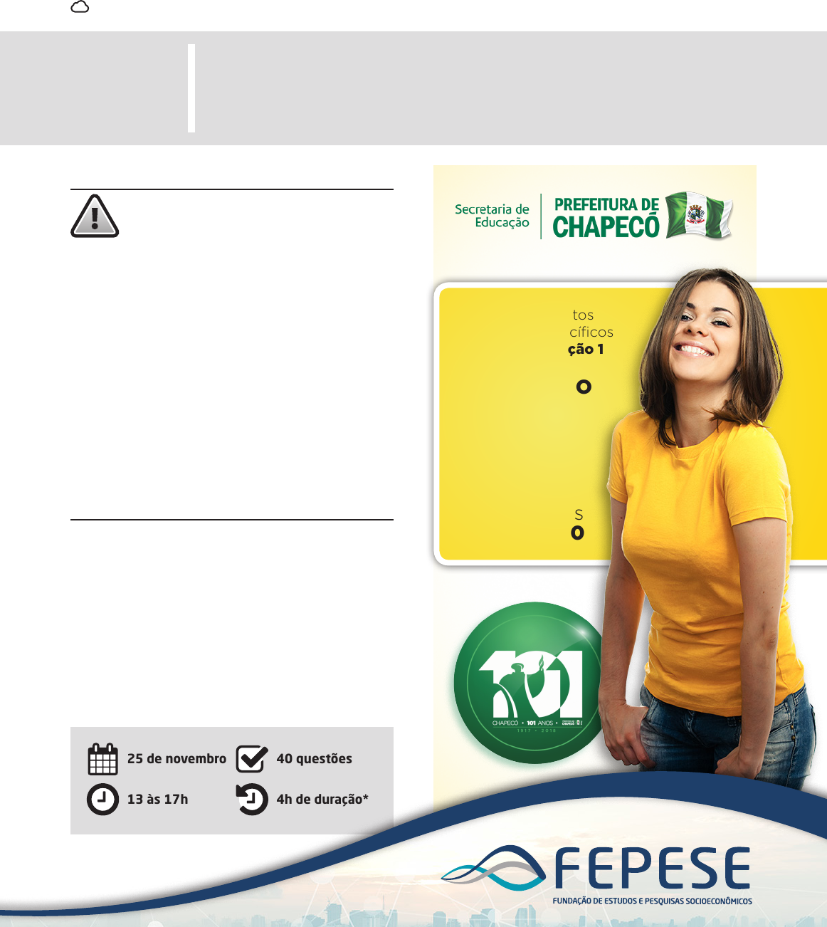 Conhecimentos Básicos e Específicos Área de atuação 1 CADERNO A questões de 1 a 40 Município de Chapecó Processo Seletivo • Edital 001/2018 http://seletivochapecoeduca.fepese.org.br Instruções Confira o número que você obteve no ato da inscrição com o que está indicado no cartão- resposta. * A duração da prova inclui o tempo para o preenchimento do cartão-resposta. Para fazer a prova você usará: � o caderno de prova A ( + B cargo opcional). � um cartão-resposta que contém o seu nome, número de inscrição e espaço para assinatura. Verifique, no caderno de prova, se: � faltam folhas e a sequência de questões está correta. � há imperfeições gráficas que possam causar dúvidas. Comunique imediatamente ao fiscal qualquer irregularidade! Atenção! � Não é permitido qualquer tipo de consulta durante a realização da prova. � Para cada questão são apresentadas 5 alternativas diferentes de respostas (a, b, c, d, e). Apenas uma delas constitui a resposta correta em relação ao enunciado da questão. � A interpretação das questões é parte integrante da prova, não sendo permitidas perguntas aos fiscais. � Não destaque folhas da prova. Ao terminar a prova, entregue ao fiscal o caderno de prova completo e o cartão-resposta devidamente preenchido e assinado. 25 de novembro 13 às 17h 40 questões 4h de duração* C A D E R N O D E P R O V A S08 PROFESSOR Educação Física . Página 3 Município de Chapecó • Processo Seletivo • Edital 001/2018 S08 Professor Educação Física Língua Portuguesa 5 questões Leia o texto 1 abaixo: Uma rã viu um boi que tinha uma boa estatura. Ela, que era pequena, invejosa, começou a inflar-se para igualar-se ao boi em tamanho. Depois de algum tempo, disse: — Olhe-me, minha irmã, já é o bastante? Estou do tamanho do boi? — De jeito nenhum. — E agora? — De modo algum. — Olhe-me agora. — Você nem se aproxima dele. O animal invejoso inflou-se tanto que estourou. LaFontaine. Fábulas 1. Considere as afirmativas abaixo: 1. O texto é uma história que critica os cos- tumes dos animais em uma clara intenção comunicativa. 2. A história desnuda certos comportamentos humanos. 3. O texto tem como ideia central: “um homem invejoso faz tudo para igualar-se a quem ele inveja”. 4. A inveja tem um significado contextual de altruísmo, ou seja, a intenção comunicativa do texto é enaltecer a abnegação. 5. Há no texto uma reiteração do traço semân- tico humano. Assinale a alternativa que indica todas as afirmativas corretas. a. SQUARE São corretas apenas as afirmativas 3 e 4. b. SQUARE São corretas apenas as afirmativas 4 e 5. c. SQUARE São corretas apenas as afirmativas 1, 2 e 3. d. Check-square São corretas apenas as afirmativas 2, 3 e 5. e. SQUARE São corretas apenas as afirmativas 3, 4 e 5. 2. Leia o texto. Numa loja de animais, o vendedor enaltece as quali- dades de um papagaio a um cliente interessado em comprá-lo. — Este papagaio é extraordinário! Falante como ele só! O senhor observou que ele tem um fio amarrado em cada pé? Se o senhor puxar o fio amarrado ao pé direito, ele fala francês. Se o senhor puxar o fio amar- rado ao pé esquerdo, ele fala russo. — E se eu puxar os dois ao mesmo tempo? – pergun- tou o cliente interessado. — Eu caio no chão, idiota! – responde o papagaio. in Cereja, William Roberto. Analise as afirmativas abaixo em relação ao texto. 1. O período sublinhado no texto é composto por duas orações. A primeira está subordi- nada à segunda, estabelecendo uma ideia de condição. 2. A palavra “extraordinário” é um predicativo do sujeito no contexto em que se insere. 3. O verbo “enaltecer” possui dois objetos: um direto (as qualidades) e um indireto (de um papagaio). 4. A expressão “o cliente interessado” é um sujeito simples deslocado, se considerada a ordem direta da frase em que se encontra. 5. A frase: “que ele tem um fio amarrado em cada pé” completa o sentido do verbo “observar” e, assim, pode ser classificada como objeto indireto. Assinale a alternativa que indica todas as afirmativas corretas. a. SQUARE São corretas apenas as afirmativas 2 e 4. b. SQUARE São corretas apenas as afirmativas 1, 2 e 3. c. Check-square São corretas apenas as afirmativas 1, 2 e 4. d. SQUARE São corretas apenas as afirmativas 2, 3 e 4. e. SQUARE São corretas apenas as afirmativas 3, 4 e 5. Página 4 Município de Chapecó • Processo Seletivo • Edital 001/2018 S08 Professor Educação Física 3. Assinale a alternativa correta em relação ao texto 1. a. SQUARE A frase sublinhada no último período do texto conota a ideia de causa. b. Check-square As duas palavras sublinhadas no texto (que/ que) têm o mesmo valor na articulação frasal, embora retomem palavras diferentes. c. SQUARE As palavras “pequena” e “invejosa” são adje- tivos e, dessa forma, são, no texto, adjuntos adnominais. d. SQUARE No contexto, a palavra “agora” equivale semanticamente à expressão “minha irmã” já que ambas (palavra e expressão) compõem a mesma estrutura frasal. e. SQUARE O verbo “inflou-se” não pode ser substituído por “intumesceu-se” já que essas palavras são parônimas. 4. Assinale a alternativa correta. a. Check-square Na frase: “Andou devagar, por isso chegou atra- sado”, a conjunção sublinhada estabelece uma relação de conclusão. b. SQUARE Em: “Mesmo que não haja sol, iremos à praia”, a expressão sublinhada estabelece uma ideia de condição para o fato expresso na oração seguinte. c. SQUARE Na frase: “A beleza e a sinceridade são dois excelentes atributos”, temos: três substantivos, dos quais dois são abstratos e um concreto; um adjetivo no plural e um verbo de ligação. d. SQUARE A frase: “Os servidores técnicos-administrativos fizeram greve” está correta. e. SQUARE Observe a frase: “Por trás de tudo aquilo, haviam mentira e deslealdade”. Nela temos: 1. Obj