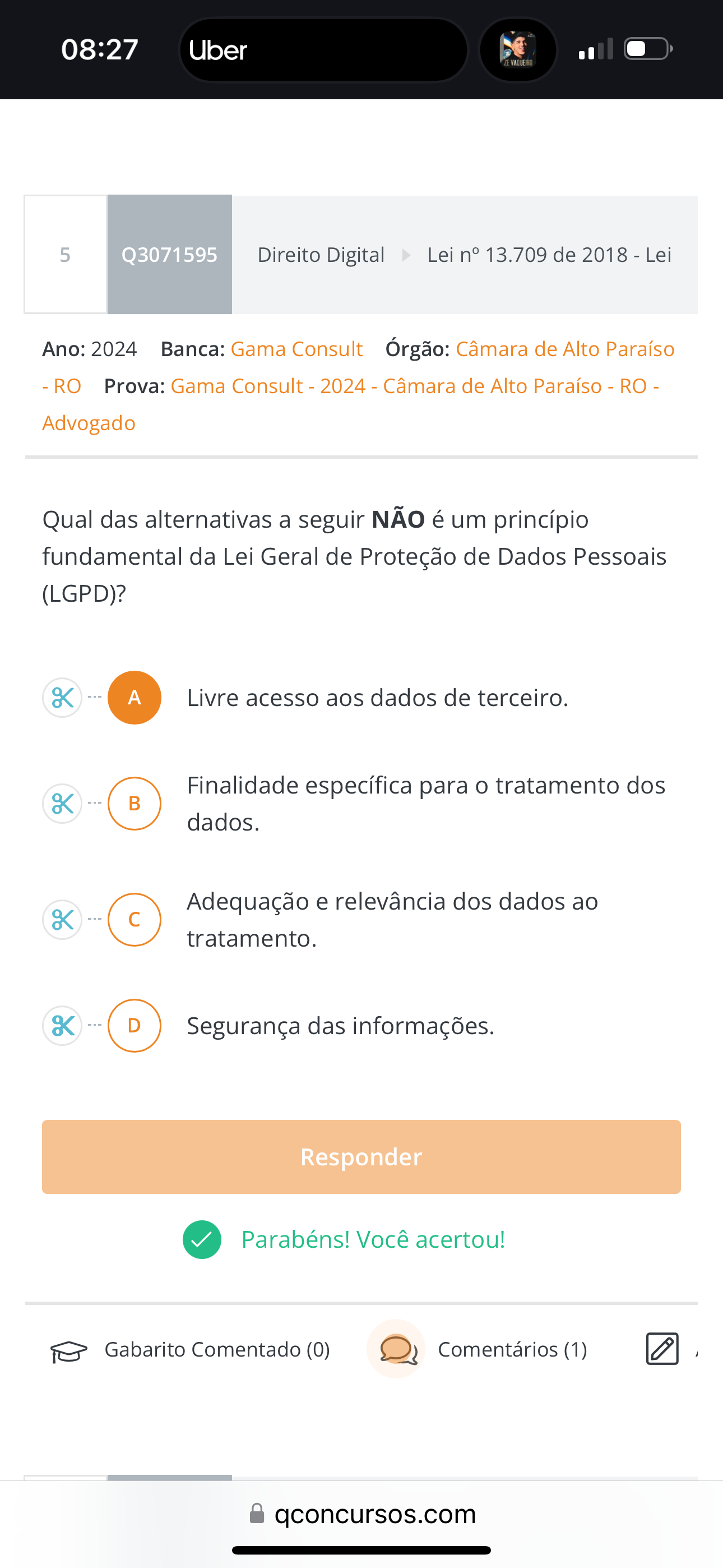 08:27 Uber 5 Q3071595 Direito Digital Lei n° 13.709 de 2018 - Lei Ano: 2024 Banca: Gama Consult Órgão: Câmara de Alto Paraíso - RO Prova: Gama Consult - 2024 - Câmara de Alto Paraíso - RO - Advogado Qual das alternativas a seguir NÃO é um princípio fundamental da Lei Geral de Proteção de Dados Pessoais (LGPD)? A Livre acesso aos dados de terceiro. Finalidade específica para o tratamento dos K B dados. Adequação e relevância dos dados ao tratamento. K D Segurança das informações. Responder Parabéns! Você acertou! Gabarito Comentado (0) Comentários (1) qconcursos.com